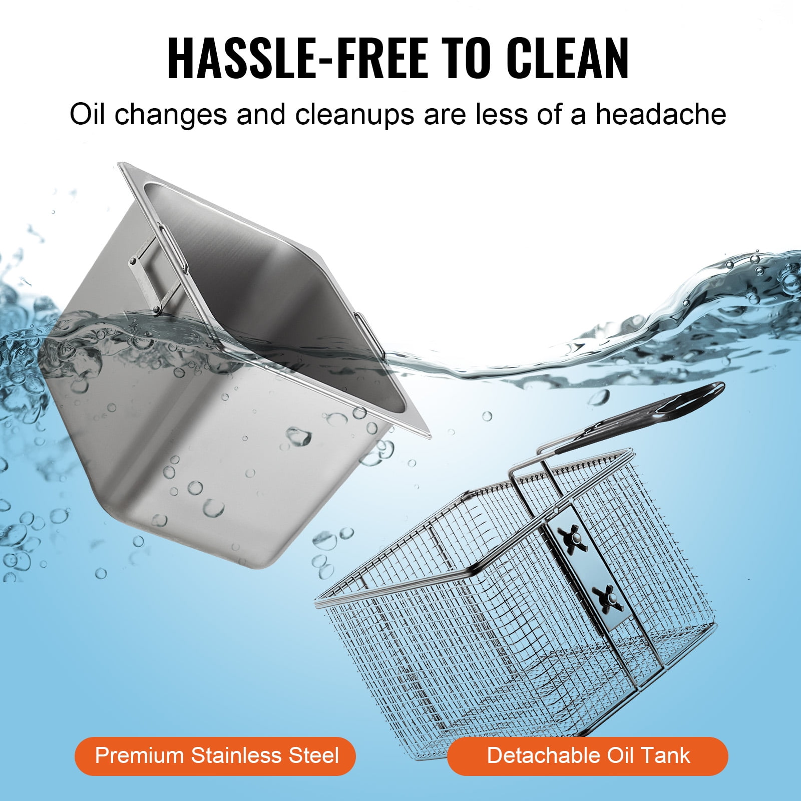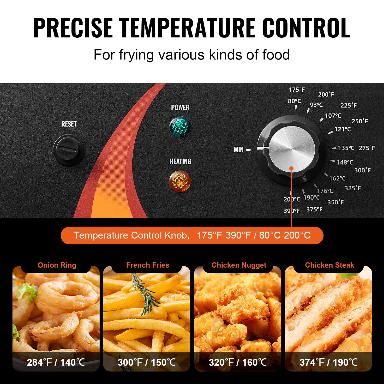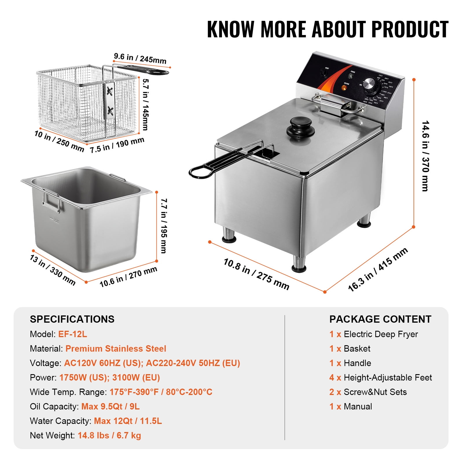 With a 9.5Qt/9L oil tank (water capacity: max 12Qt/11.5L), this commercial electric deep fryer offers a large capacity for frying various foods while preserving their unique flavor. Perfect for delis, concession stands, snack bars, and parties. Say goodbye to slow heat-ups! Equipped with a powerful heating element, this commercial electric fryer quickly heats oil to your desired temperature, allowing you to cook your food quickly and thoroughly. Easily adjust the temperature from 175°F to 390°F (80-200°C) and get ready to bring on the heat! This deep fryer features an automatic shut-off function when the temperature exceeds 446℉(230℃) or the temperature controller malfunctions. Designed with your convenience in mind, this fryer has adjustable feet for stability and the perfect cooking height. The well-matched cover minimizes hot oil splashes, while the front hook allows for easy hanging of the basket to drain oil quickly. Cleaning is a breeze with this electric deep fryer. All components, including the oil tank, are easy to lift out. The stainless steel exterior makes it easy to wipe down. Note: 1. Please remove any white plastic protective film on the surface. 2. Always ensure the machine is cool and dry before storing.