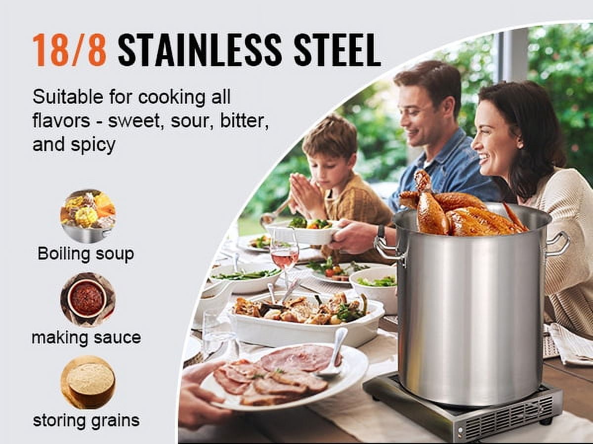 Product Description Multipurpose Stainless Steel Stockpot The large-capacity soup pot can accommodate more ingredients at once, saving cooking time. It can also process large foods like turkey and lobsters, ensuring even heating and thorough cooking. Premium Material Crafted with 18/8 stainless steel, this stockpot is more corrosion-resistant. When heated to high temperatures or while cooking acidic foods, it doesn’t release harmful substances, providing better overall stability. Quality Compound Base The compound base refers to the addition of a magnetic and thermally conductive aluminum sheet to the pot’s bottom, making it suitable for induction cook tops. This stainless steel cookware with a compound base improves cooking efficiency and experience. Thoughtful Design The ergonomic handle on the pot body uses rivet technology. It doesn’t produce thermal reactions leading to warping or damage like welding does, offering better overall weight-bearing. Even in situations of repair or replacement, it provides greater flexibility. Secure Packaging 1A-grade stacked packaging refers to meeting the highest standards from external packaging inspection (ensuring no watermarks, dirt, damage, etc.) to drop testing (high-frequency vibrations, inclined falls, etc.), ensures the integrity of the product. Large Capacity This cookware sauce pot is great for seafood boiling and deep frying. The ultra-strong lifter can hold up to 42 quart food. Versatile Application This large cooking pot is suitable for outdoor use, such as camping or having picnic with family and friends.It’s perfect for brewing, boiling, and turkey frying. Specifications Item Model Number: SP354003D Main Material: 18/8 Stainless Steel Capacity: 42QT (Approximately 39.7L) Package Content 1 x Stainless Steel Stockpot 1 x Lid 1 x User Manual