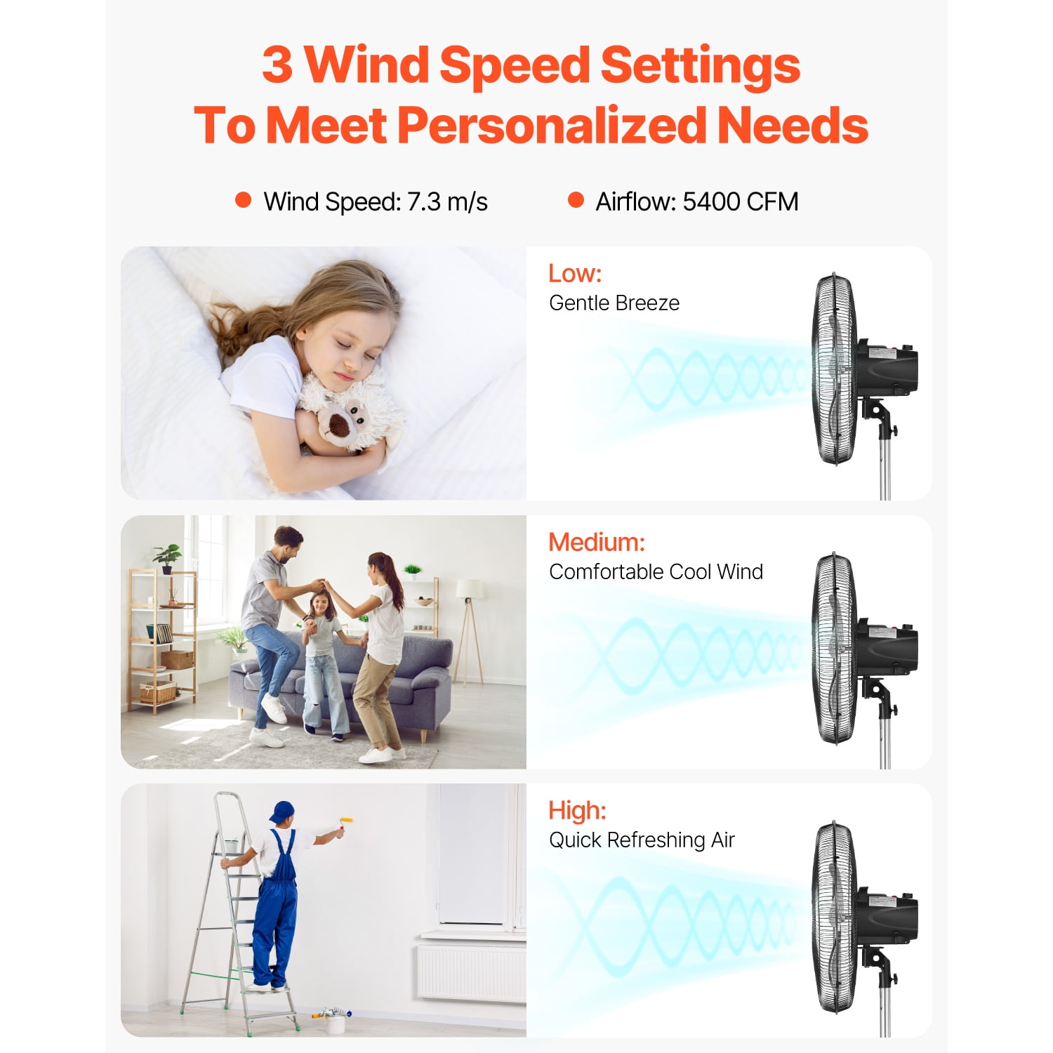 Premium Motor: The industrial pedestal fan is equipped with a high-quality motor, providing efficient airflow output and ensuring stability. It also includes a thermal protection mode to prevent overheating during extended use. Adjustable Speed: With 3 speed settings, this standing fan allows you to customize the airflow for various activities such as sleeping, relaxing, or indoor tasks. Experience a powerful 4200 CFM airflow and a refreshing wind speed of 7.3 m/s. Wide Coverage: Enjoy a refreshing breeze in every corner of your space with the fan’s 65.62 ft air delivery distance. The manual angle adjustments of 45° upward tilt and 25° downward tilt, combined with a 90° wide-angle automatic oscillation, ensure optimal air circulation. Height Customization: Easily adjust the height of the bedroom fan to suit your needs. The height range can be set from 43.1 to 53.7 inches, allowing you to personalize the fan’s position for different indoor activities or workspace requirements. Hassle-Free Installation: Our fan comes with a complete set of installation tools, making the setup process quick and easy. No additional tools are required. The fan is built with durable components to ensure long-lasting performance and reliability.