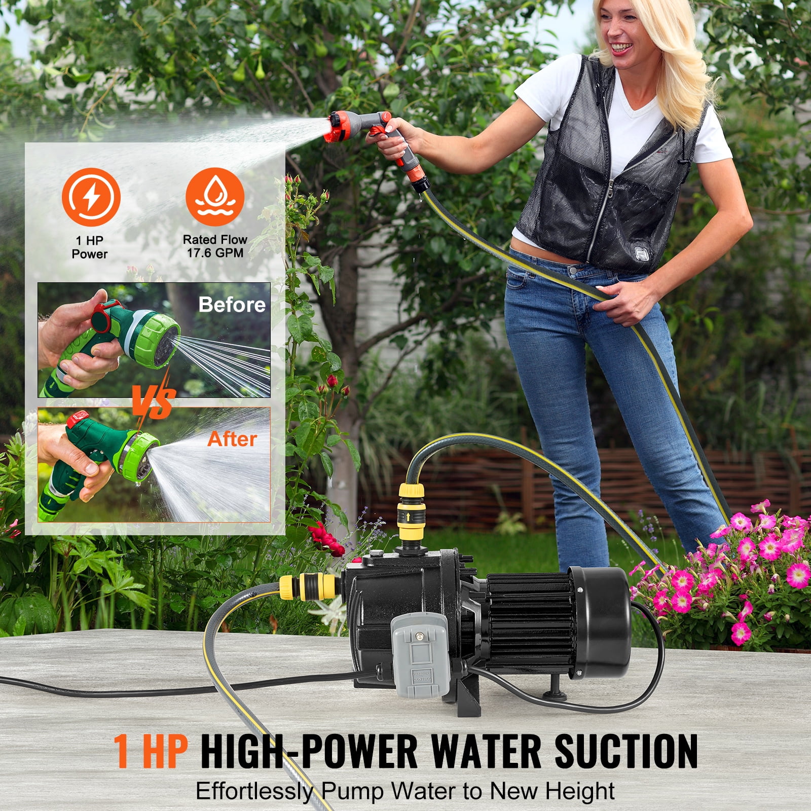 High-Power, 164ft Head: Introducing our shallow-well jet pump with a powerful 1 HP/745.7W motor designed to easily increase water flow. Nominal flows of up to 17.6 GPM and heights of up to 164 FT / 50 m exceed expectations for domestic water demand. Automatic Pressure Switch: Our shallow well jet pumps automatically start and stop when the faucet is turned on and off, saving you valuable time. It operates in the 30-50 PSI range and starts or deactivates in sync with the water valve, preventing damage from pipe clogging or insufficient pressure. For accurate monitoring of water pressure, consider purchasing a separate pressure gauge. Easy Setup, Simple Use: Just compare the voltage, connect the power supply and install the water pipe at the specified water inlet and outlet. However, before use, fill the injection nozzle with water until the water flows out of the drain, and then install the exhaust plug. Drain the water if you rarely use it. Durable: Our shallow well jet pumps are made of cast iron and are resistant to abrasion and corrosion, making them ideal for outdoor use in yards and farms. A rear cooling port facilitates instant cooling, and a built-in automatic thermal overload protector ensures uninterrupted performance for years to come. Commercial & Household Use: This shallow well jet pump is versatile and ideal for supplying fresh water to large homes, farms and cottages, as well as providing solutions for garden irrigation, increasing faucet water pressure, supplying water to car washes and more. Meet the water supply needs of high-rise buildings.