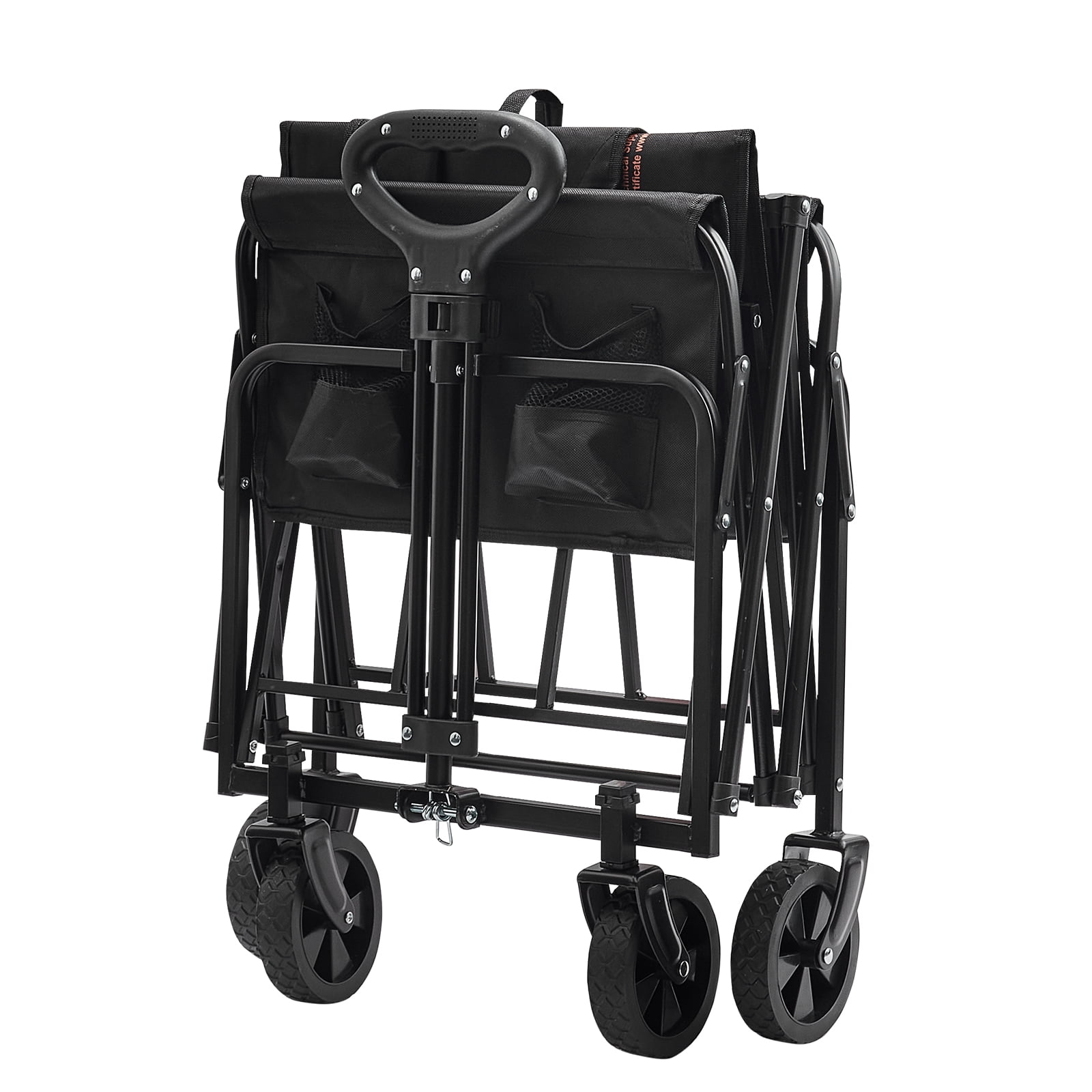 Product Description 220 lbs Weight Capacity Collapsible Foldable Wagon Built with a sturdy reinforced iron frame and premium powder coating for excellent rust resistance. Be your reliable helper for outdoor adventures, family picnics, or everyday use! Large Storage Capacity Crafted from durable 600D Oxford fabric, this heavy-duty wagon cart offers ample storage for camping essentials like medium-sized tents, sleeping bags, air mattresses, folding chairs, and cookware. Perfect for both quick getaways and longer outdoor adventures. All-Terrain Swivel Wheels Whether on rugged trails or soft grass, the 5-inch swivel wheels ensure smooth moving, with 360° bearings for effortless maneuvering. Adjustable Handle The ergonomic handle allows for easy pushing and pulling, with adjustable angles from 0° to 90° to accommodate users of different heights. Multiple convenient pockets hold water bottles and other small items, while the included elastic cord secures items during transport. Versatile Applications Easily fold and unfold for moving, shopping, camping, outdoor fishing, and more. The folding wagon cart not only saves space but also offers unprecedented convenience and flexibility. Quick Folding One-touch quick-folding design for easy and space-saving storage, making transportation safe and convenient. Multifunctional Outdoor Wagon With 220 lbs weight capacity and a sturdy iron frame, the wagon cart foldable is built for heavy-duty use. Made of durable 600D Oxford fabric, it can carry all your camping gear. Its swivel wheels and brakes allow smooth movement on any surface, while the ergonomic handle ensures easy and safe transport. Specifications Item Model Number: W11 Load Capacity: 220 lbs Fabric Material: 600D Oxford Cloth with PVC Coating Frame Material: Iron Tire Material: PVC Hub with Bearings Product Weight: 5.7kg/12.57 lbs Product Size: 755x495x885 mm/29.72 x 19.49 x 34.84 inch Package Content 1 x User Manual 1 x Bungee Cord