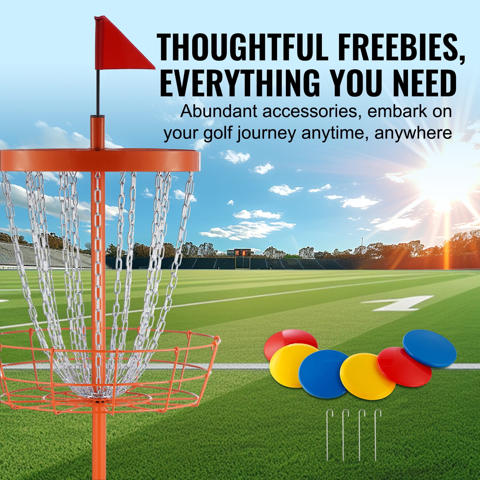 Product Description Disc Golf Basket Target Practicing with discs has never been easier! This disc golf basket features rust-resistant and weatherproof properties, dual-layer chain protection, and a sturdy, thickened design. With a simple assembly structure, you’ll have more time to focus on the game without worrying about weather changes. High-Quality Materials The practice disc golf target is constructed with coated steel frame and galvanized chains, allowing this target to maintain its charm even outdoors for extended periods. No more concerns about harsh weather, just focus on your practice and enjoy to the fullest! Peace of Mind Usage The inner frame of 12 & outer frame of 12 heavy-duty galvanized chains provide unparalleled dual-layer protection for your discs. Let your discs remain unharmed even during rapid flight and high-intensity collisions. Sturdy Base The base has been thickened and upgraded for double stability. Coupled with the support of four ground stakes, the basket can hold its ground even in adverse conditions. No need to worry about the basket tipping over, everything is under control! Easy Installation You can easily assemble the disc golf course basket without cumbersome tools, saving time and effort! It can be completed in minutes, bid farewell to complicated installation steps, saving your time, and enjoying the fun of the game! Versatile Applications This practice basket for disc golf is not only suitable for disc practice but also an excellent choice for outdoor activities! Whether it’s family gatherings, campus events, or park entertainment, it will bring you endless fun. Sweet Accessories Attach the included mini flags, and your golf basket will be even more eye-catching. Even from a distance, you can easily perceive the position of the basket. Additionally, 6 discs are included.