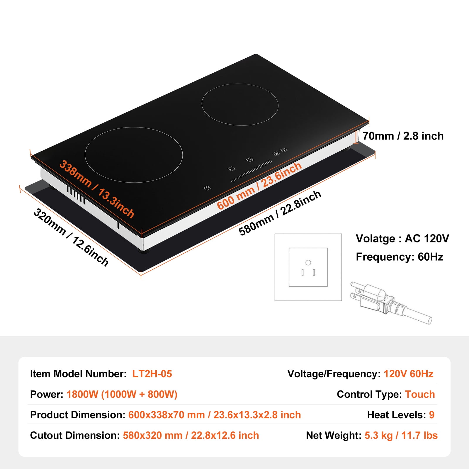 Product Description Electric Cooktop with Slider Control Panel Experience the convenience and versatility of our KFFKFF built-in electric cooktop. With its innovative slider control panel, you can effortlessly adjust the heat settings to achieve your desired cooking temperature. Whether you’re simmering a delicate sauce, frying crispy bacon, grilling juicy steaks, steaming vegetables, boiling pasta, or baking delicious treats, this cooktop has got you covered. It offers a wide range of cooking options, allowing you to prepare your meals quickly and efficiently. Powerful Electric Cooktop Introducing our KFFKFF built-in electric cooktop with a slider control panel that offers convenient one-touch access to your desired heat settings. Whether you’re simmering, frying, grilling, steaming, boiling, or baking, this cooktop ensures quick and efficient meal preparation. User-Friendly Slider Control Panel Experience the convenience of our KFFKFF electric cooktop’s highly sensitive slider touch control panel. With 9 levels of temperature control, each switch allows for independent adjustment. It also features a 1-99 minute timer and a pause function, giving you greater flexibility in the kitchen. Versatile Compatibility Our KFFKFF countertop stove is compatible with a wide range of high-temperature cookware. From aluminum pots to copper pans, cast iron skillets to non-magnetic stainless steel pots, this cooktop can handle it all. Enhanced Safety Features Safety is our top priority. The KFFKFF ceramic electric stove is equipped with 5 major smart protections, including child lock, overheat protection, residual heat warning, and anti-overflow features. It operates without emitting high-frequency radiation, ensuring the safety of pregnant women and the elderly. Space-Saving Built-In Design Designed for convenience and space-saving, our KFFKFF electric stove features a built-in installation design. It perfectly fits into your kitchen countertop, saving valuable space. It is suitable for 120V, 60Hz voltage and requires a cutout dimension of 580×320 mm / 22.8×12.6 inches. Easy to Maintain Cleaning up after cooking is a breeze with our KFFKFF stove. The high-hardness micro-crystal glass panel is not only durable and scratch-resistant but also easy to clean. Simply wipe away any grease or stains with a cloth, keeping your cooktop looking pristine. Specifications Item Model Number: LT2H-05 Voltage/Frequency: 120V 60Hz Power: 1800W (1000W + 800W) Control Type: Touch Heat Levels: 9 Net Weight: 5.3 kg / 11.7 lbs Product Dimension: 600x338x70 mm / 23.6×13.3×2.8 inch Cutout Dimension: 580×320 mm / 22.8×12.6 inch Package Content 1x Electric Cooktop 1x User Manual