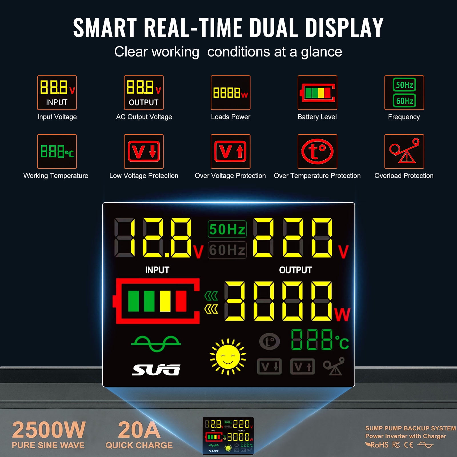 KFFKFF 2500W Battery Backup System for Sump Pump, Features LCD Screen, Automatically Shifts to Battery Inverter Power for Uninterrupted Sump Pump Functioning, Ideal for Emergencies and Power Failures