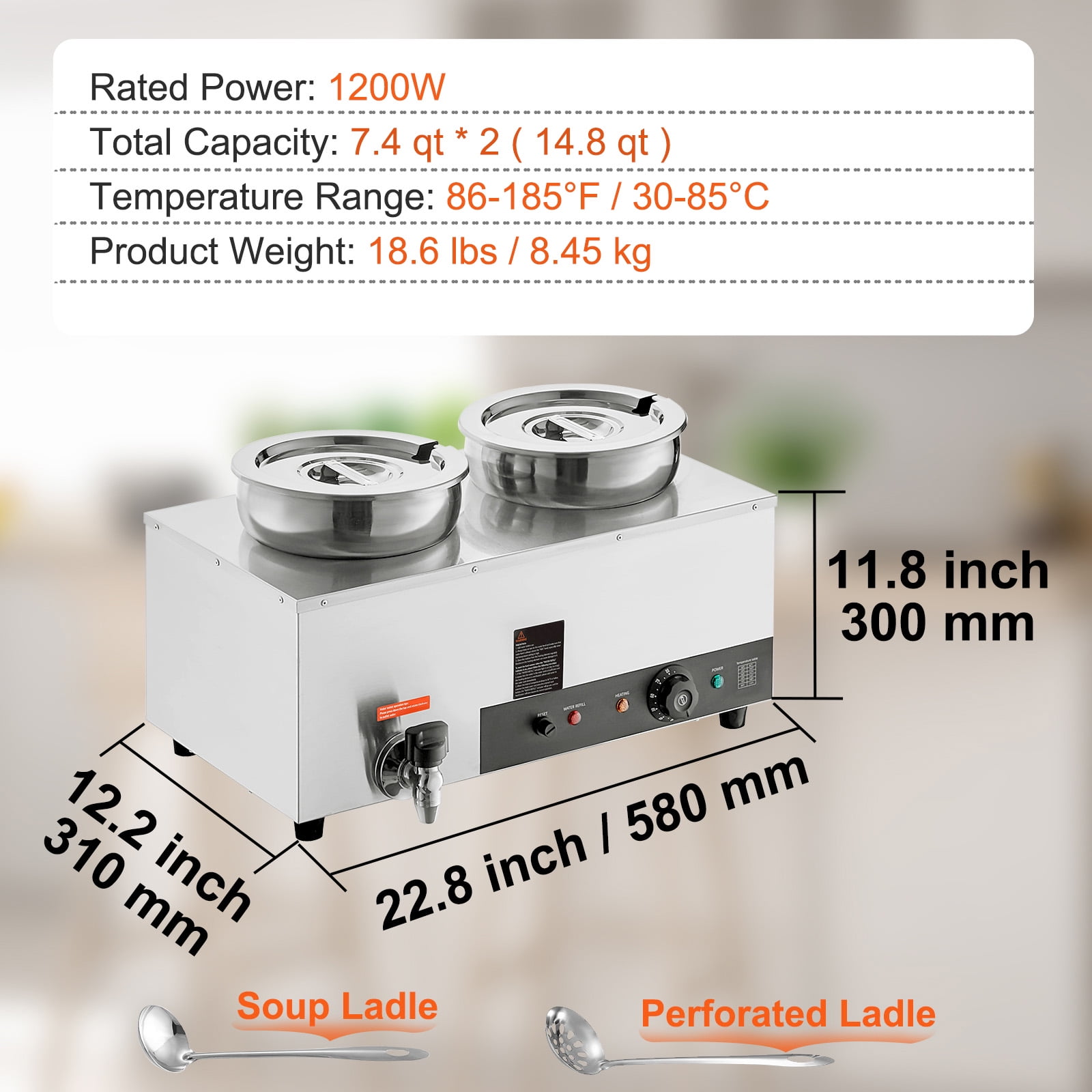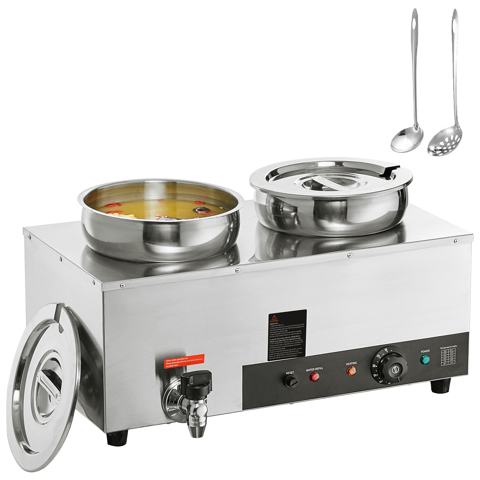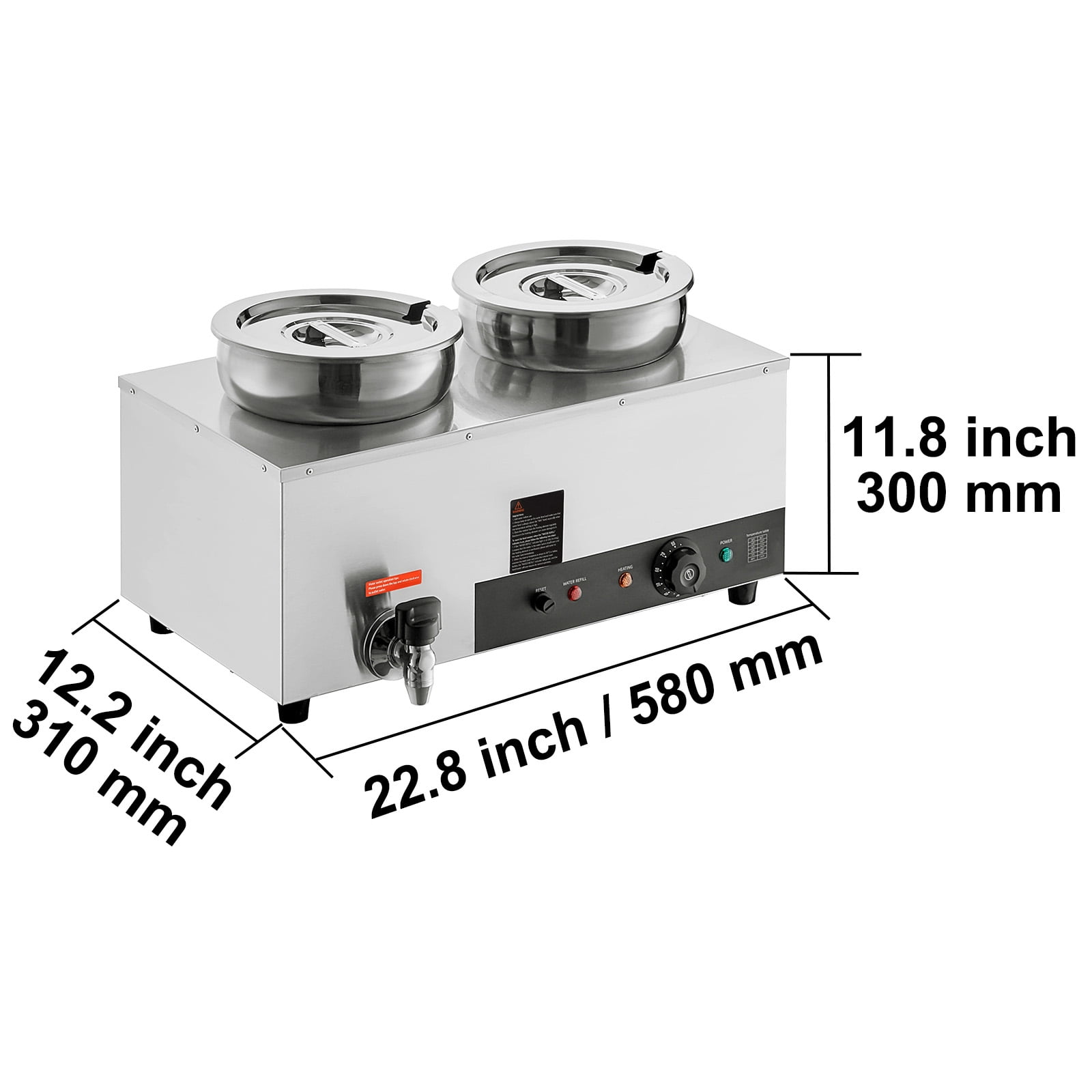 Product Description 2-Pot Commercial Soup Warmer A perfect solution to keep your food at a safe and consistent temperature for extended periods. Whether you’re looking to serve chili, baked potato soup, or pasta sauce, this electric countertop food warmer is an excellent space-saving addition to your catering or outdoor event setup. With its versatile features and compact design, it’s an ideal choice for buffet tables, concession stands, and backyard BBQs alike. Drainage Faucet The food warmer features a convenient drainage faucet that makes it easy to empty the water at the end of the day. Notched Lid The stainless steel lid is designed with a cutout, providing a perfect space for serving ladles. Water Level Markers The clearly marked water level indicators inside the unit make it easy to monitor and refill the water as needed. Dry Burning Indicator For added safety, the dry burning indicator automatically stops heating the food when the temperature exceeds 248?F (120?C). SUS 304 Heating Tube With 1200-watt power, it provides even heat distribution to ensure your food stays at the perfect temperature for longer. Thickened Material The inner wall has been upgraded with thicker material, ensuring sturdiness and maintaining a secure water seal. Specifications Rated Power: 1200W Total Capacity: 7.4 qt*2 (14.8 qt) Temperature Range: 86-185?F / 30-85?C Soup Pot Size: ?7.1″(bottom) x ?9.4″(top) x 8.7″(height) / ?180 x ?240 x 220 mm Product Dimensions: 22.8″ x 12.2″ x 11.8″ / 580 x 310 x 300 mm Product Weight: 18.6 lbs / 8.5 kg Package Content 1 x Soup Warmer 2 x SUS 304 Soup Pot with Lids 1 x Drainage Faucet 2 x Long-handled Ladles 1 x Roll of Sealing Tape