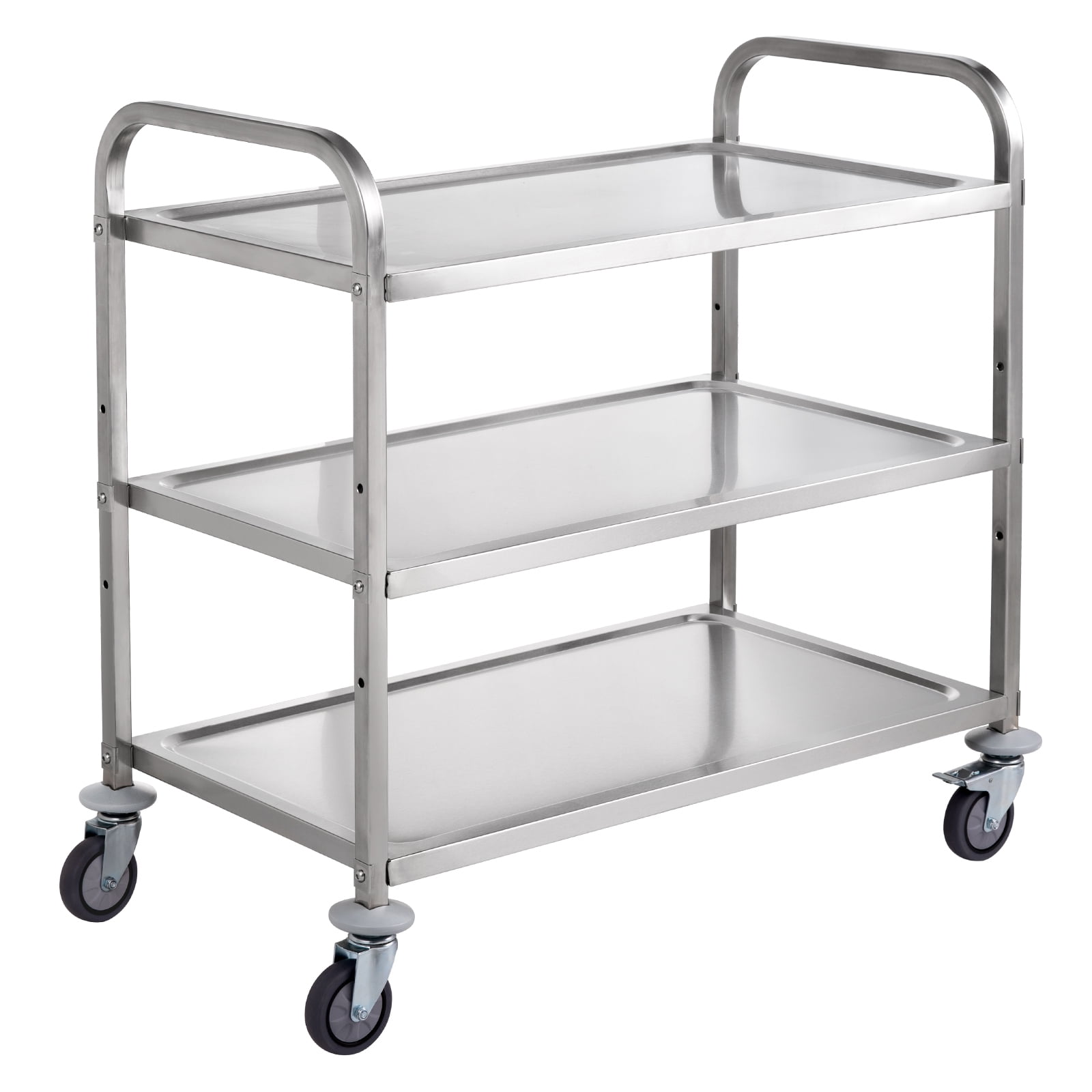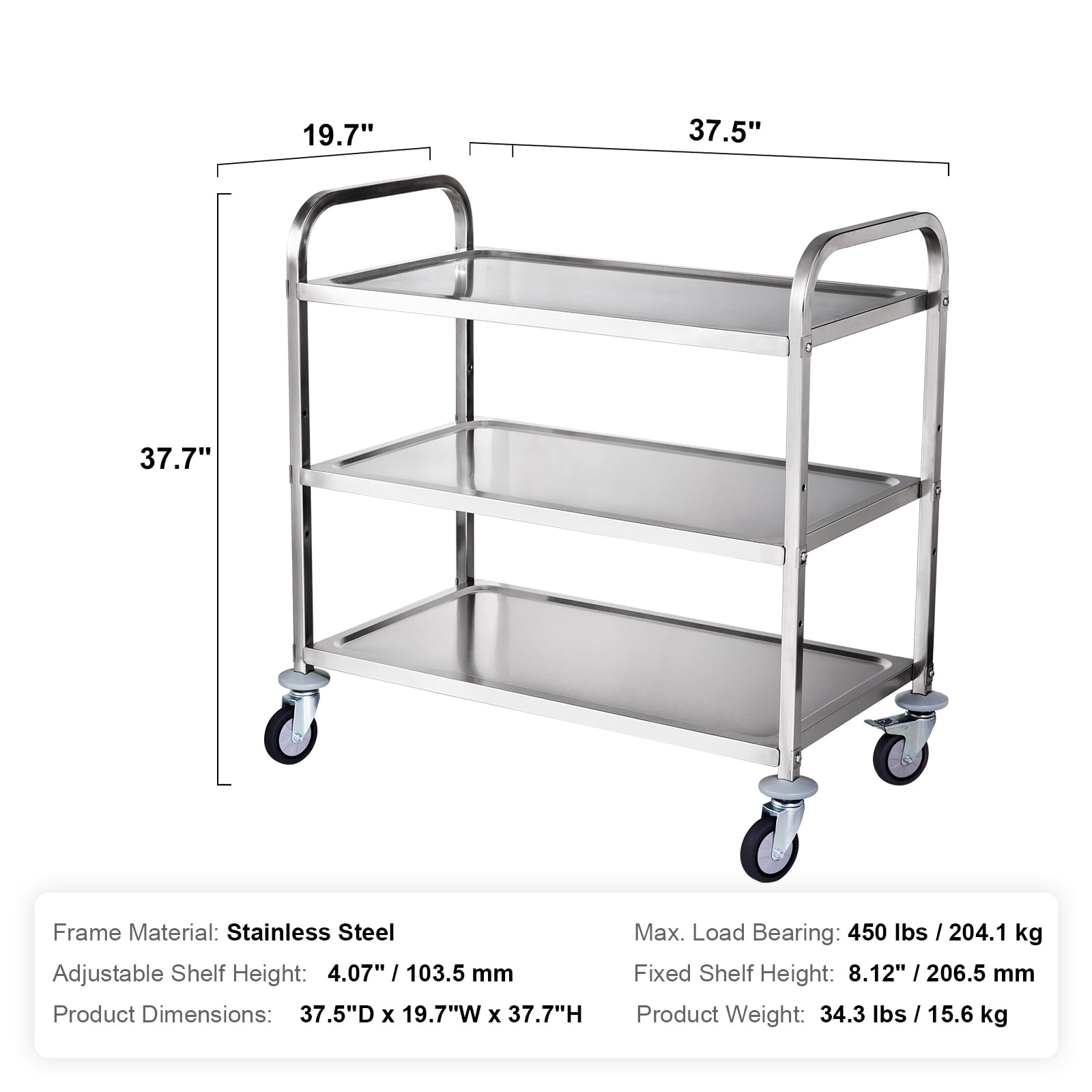 Product Description Mobile Storage Cart With a weight capacity of up to 450 pounds, this 3-tier trolley is designed to effortlessly hold heavy objects. It also features 6 additional hooks, allowing you to conveniently hang various kitchen items. The shelves are freely adjustable, making it easy to store large household appliances. To ensure stability, the cart is equipped with wheels that have a silent brake function. This enables you to transport items to your desired location and securely lock the cart in place. Whether it’s for your kitchen, restaurant, hotel, or outdoor use, this cart is a versatile storage solution. Assembly is hassle-free, and the cart includes thoughtful details to enhance your experience. KFFKFF Groove Ensure the security of your items by preventing them from shifting or slipping during movement. Dent-Proof Beam Reinforced to withstand high load bearing without any deformation, even when heavy objects are placed on it. Ergonomic Curved Handles Experience ultimate comfort and convenience with the ergonomically designed curved handles, making it easy to grip and use. Thickened Columns With a diameter of 1.06″ (26.88 mm), the columns are exceptionally strong, stable, and resistant to bending. Spacious 3-Tier Design Enjoy an extensive storage space with the ability to adjust the middle shelf in 3 height levels, allowing you to store bulky items effortlessly. Enhanced Load Bearing Capacity Experience the durability and strength of our product with a maximum loading capacity of 450 lbs (204.1 kg), making it perfect for storing a wide range of appliances and machines. Specifications Model: 100201 Frame Material: Stainless Steel Max. Load Bearing: 450 lbs / 204.1 kg Number of Shelves: 3 Number of Wheels: 4 Adjustable Shelf Height: 4.07″ / 103.5 mm Fixed Shelf Height: 8.12″ / 206.5 mm Product Dimensions: 37.5″D x 19.7″W x 37.7″H Product Weight: 34.3 lbs / 15.6 kg Package Content 1 x Stainless Steel Cart 1 x Set of Installation Tools 1 x User Manual
