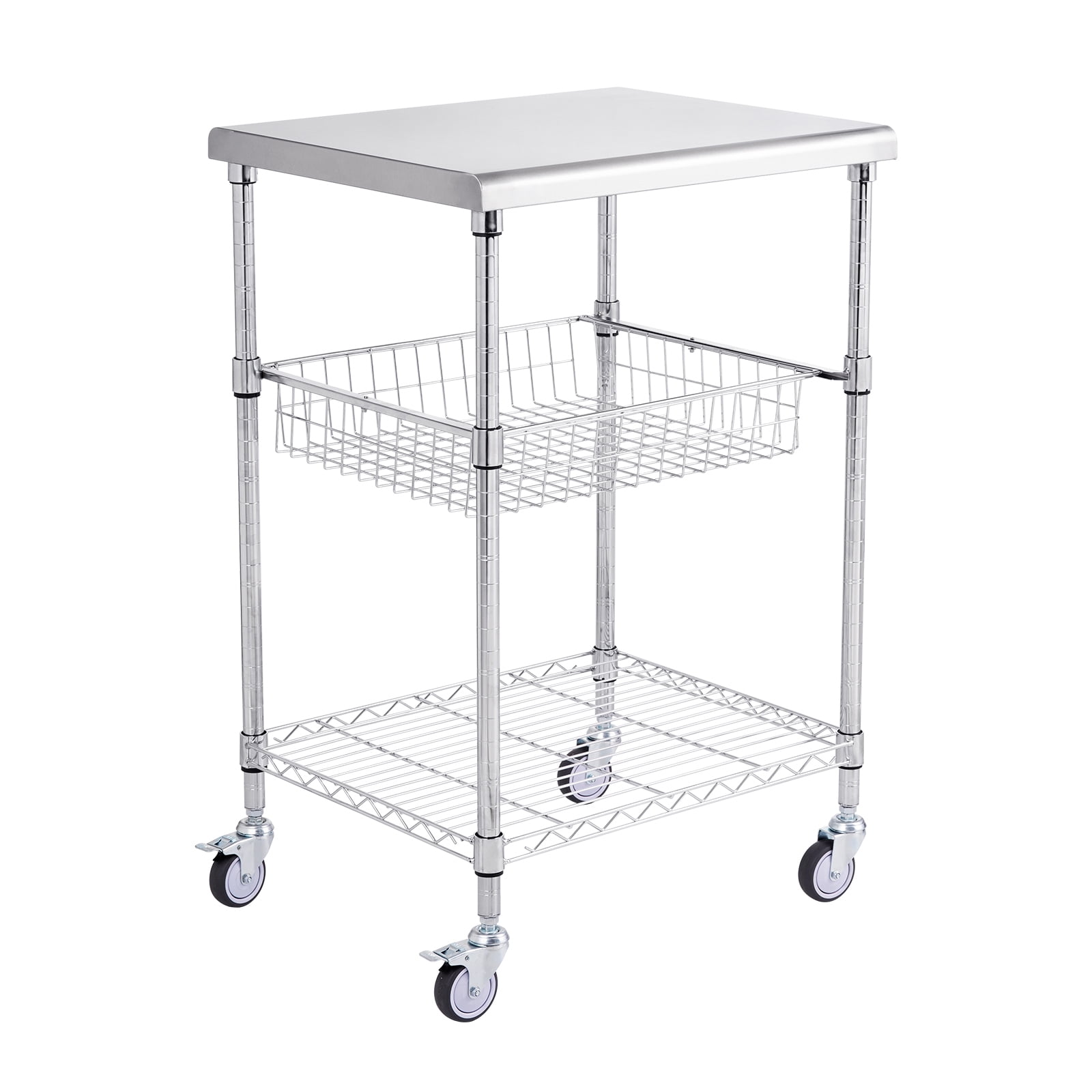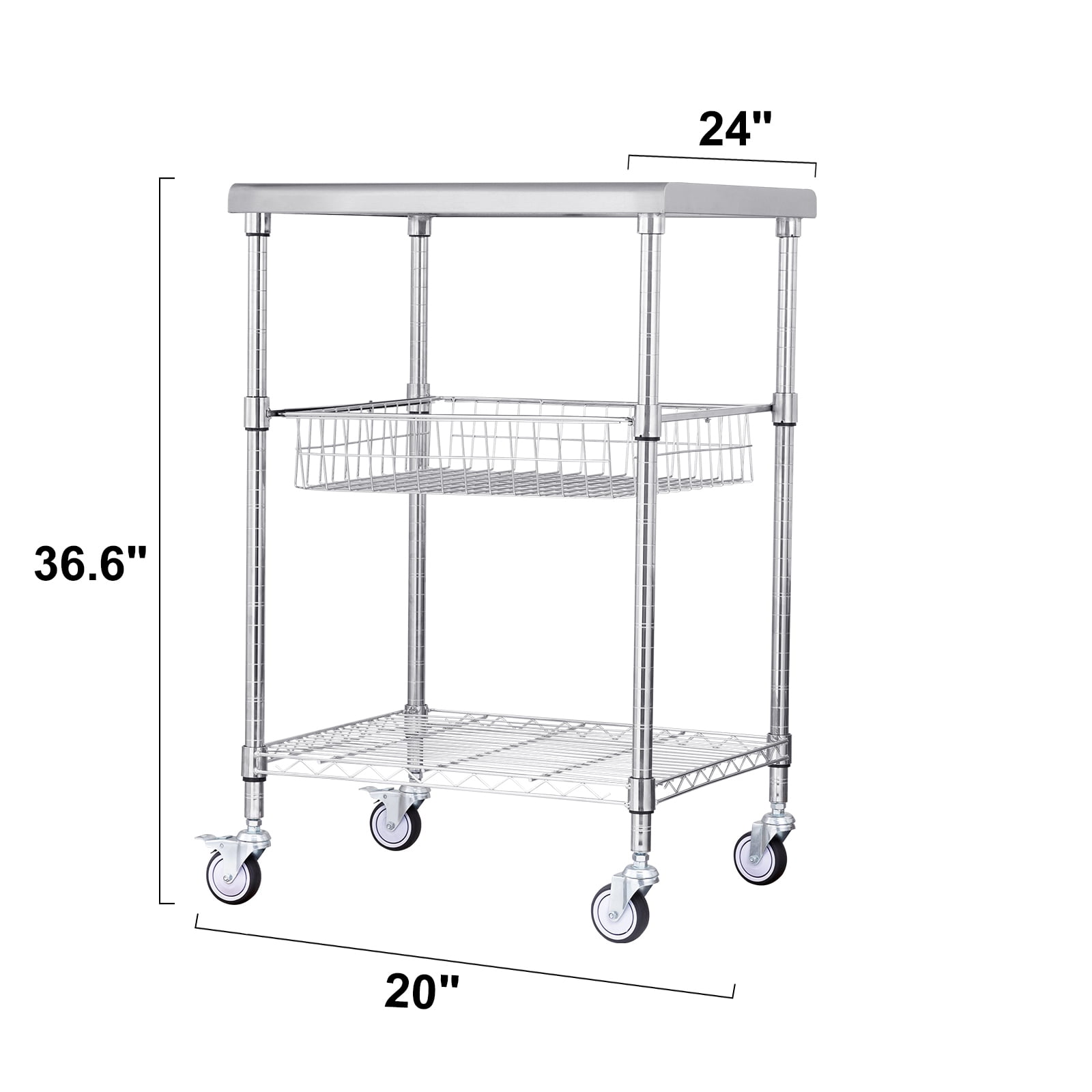 Product Description Deepen The Basket A depth of 4.2 “(107 mm). Getting objects out is easier. Grid Rack Good ventilation, store fresh vegetables. Thickened Columns Diameter 0.96 inches (24.5 mm). Strong, stable and not easy to bend. Avoid excessive pushing and pulling causing the basket to fall. The shelves can be adjusted inch by inch to easily accommodate large and small items. Safer to prevent cuts and collisions. Mobile Storage Van The three-tiered cart can hold up to 470 pounds. Thanks to freely adjustable shelves, large household appliances can also be easily stored. Wheels with silent brakes added to the bottom. You can ship various items to where you need them and then lock it up. It is perfect for kitchen, restaurant, hotel and outdoor use. Specifications Model: B1Q01001 Frame Material: Industrial-Strength Steel Tabletop Material: 443 Stainless Steel Max. Load Bearing: 470 lbs / 213.2 kg Number of Shelves: 3 Number of Wheels: 4 Wheel Diameter: 3″ Product Dimensions: 20″ x 24″ x 36.6” Product Weight: 20.9 lbs / 9.5 kg Package Content 1 x Utility Cart 1 x Set of Installation Tools 1 x User Manual