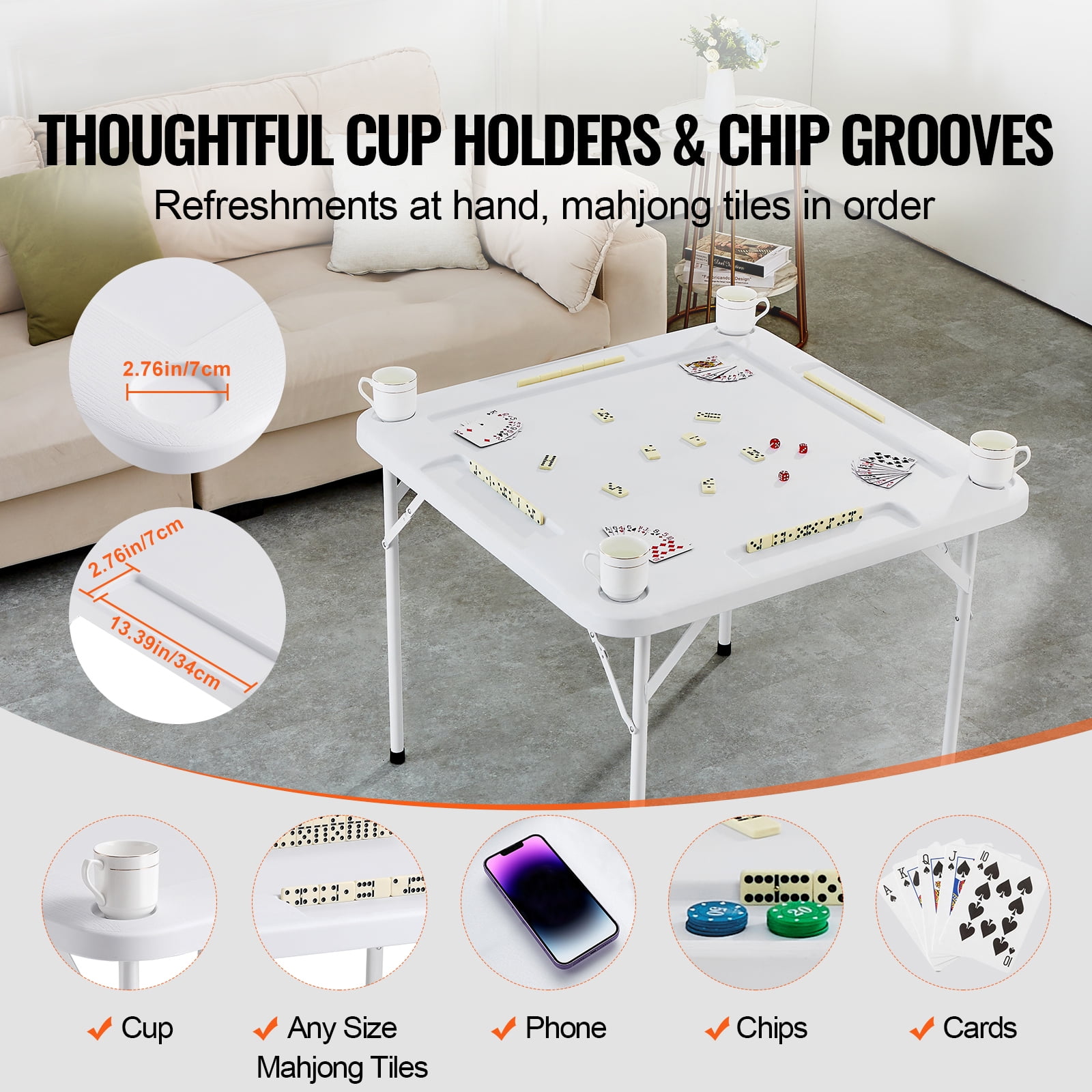 KFFKFF 35.4” Foldable Multifunctional Square Game Table Portable Domino Game Table with 4Cup Holders/4 Chip Trays/Dominoes for Mahjong Poke Puzzles for Mahjong Poker Game and Dice Game,White