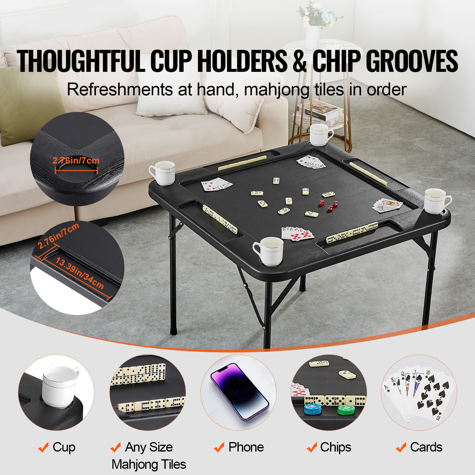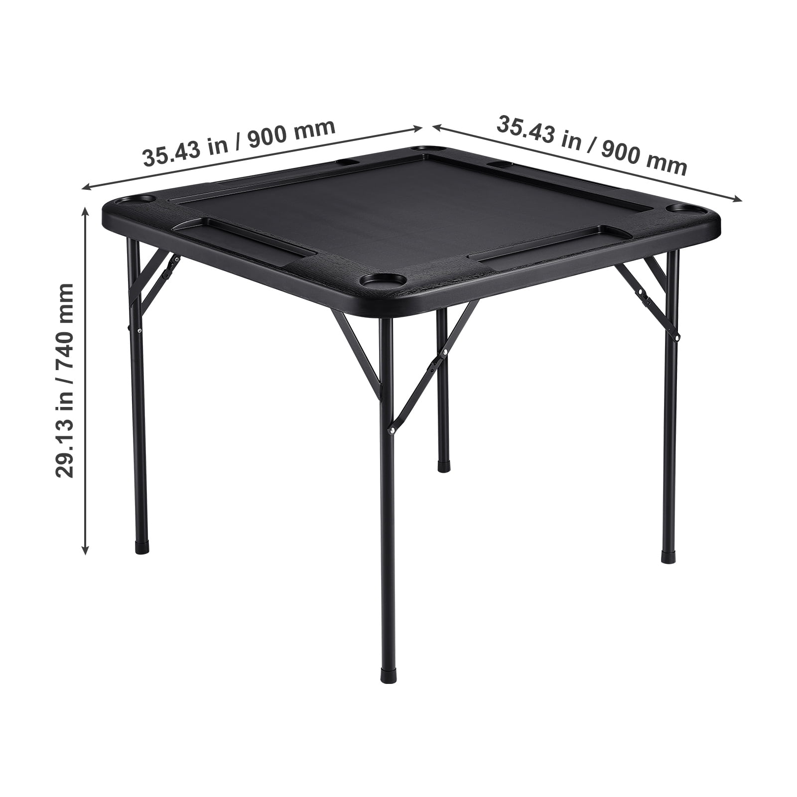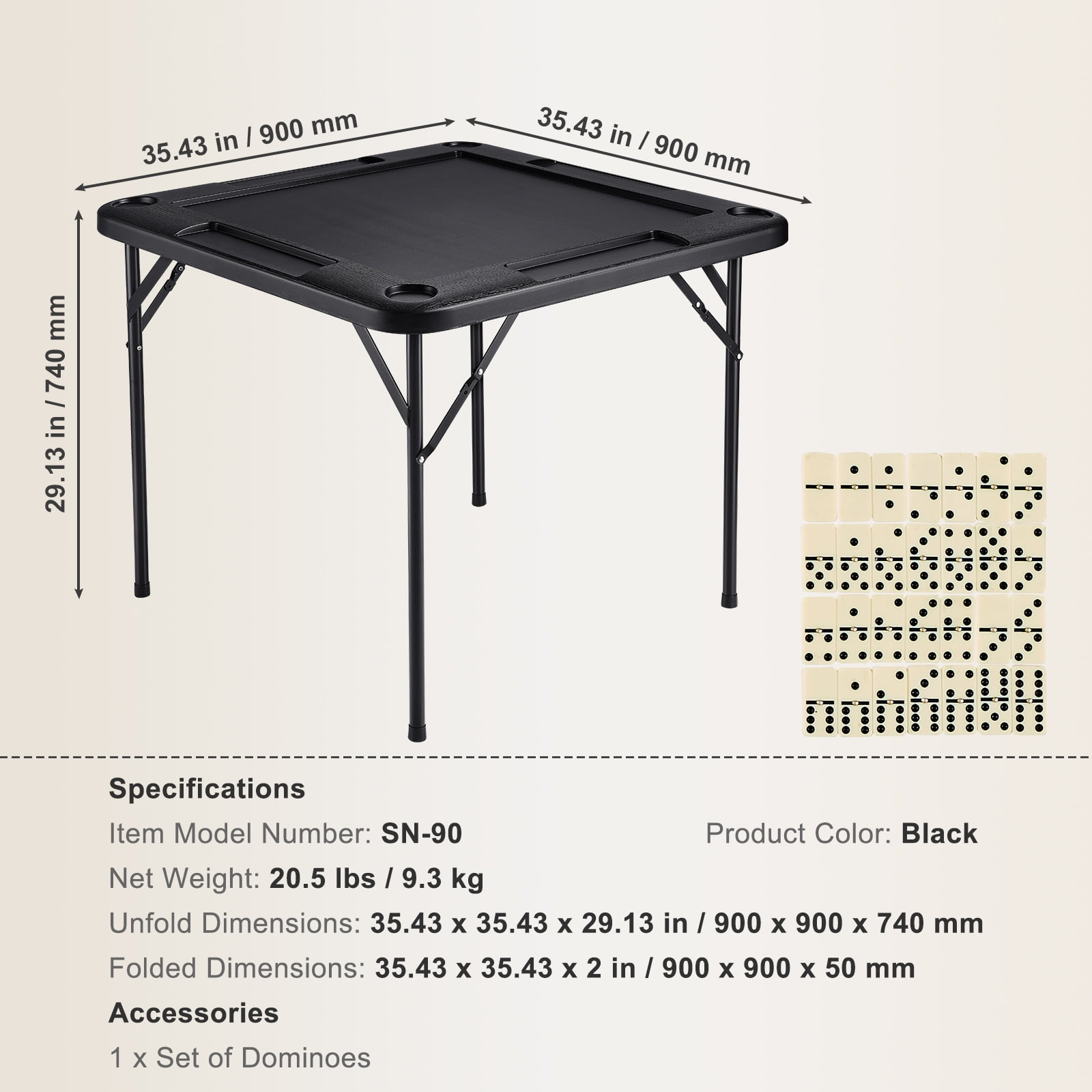 Product Description KFFKFF folding mahjong table Elevate your party atmosphere with the KFFKFF folding mahjong table, perfect for spending quality time with family and friends. With the convenient cup holder, you can easily keep your drinks handy. In addition, the chip tray keeps your phone, chips and cards organized and easy to retrieve and place. Easy folding The KFFKFF folding domino table folds into a compact size that effectively meets your storage needs without taking up too much space. Simply fold it up and store it next to stairs, in a corner, or in a suitcase for easy portability when needed. Widely used Invite your friends to try different activities such as mahjong, card games, dominoes and Lego puzzles. Use it as a computer desk or coffee table in leisure time, which is an efficient use of space. Excellent stability Thoughtful details ensure excellent stability: The square 4-player table with thickened HDPE panels, high-density seamless steel pipes and non-slip foot pads provides a solid and secure foundation for reliable play. Great gift choice Scratch-resistant, waterproof and easy to clean, our folding game puzzle tables are suitable for both indoor and outdoor use, providing endless relaxation and entertainment. It also offers thoughtful gift choices, uses high-quality materials, and provides a comfortable user experience. Easy to clean Made of high-quality materials, it is waterproof, stain resistant and easy to clean, adding wonderful surprises to your daily life. Wide table top With plenty of space to spread out the tiles and cards, you can fully immerse yourself in the game without being cramped or restricted. Specifications Item Model Number: SN-90 Product Color: Black Net Weight: 18.6 lbs / 8.45 kg Unfold Dimensions: 35.43 x 35.43 x 29.13 in / 900 x 900 x 740 mm Folded Dimensions: 35.43 x 35.43 x 2 in / 900 x 900 x 50 mm Package Content 1 x Set of Dominoes