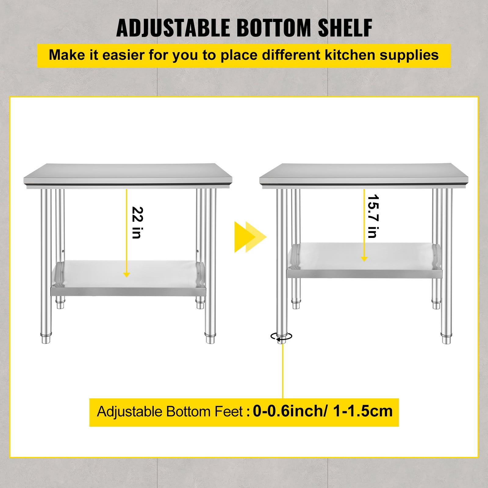 Made from high-quality 201stainless steel for superior rust resistance and a sleek appearance Sturdy and durable with an upgraded thickness of 0.8mm Ample storage with upper shelf supporting up to 400 lbs and lower shelf supporting up to 300 lbs User-friendly and practical with 3-level adjustable shelves Versatile applications for chopping vegetables, kneading dough, cutting meat, and more Perfect for use in bars, restaurants, hotels, buffets, and catering events Suitable for commercial kitchens, home renovations, and garage setups Designed for lasting performance and reliability products comply with NSF Standard for strict public health standards Easy to clean with a simple wipe Available in various sizes to fit your kitchen needs Measure your space before purchasing for the perfect fit