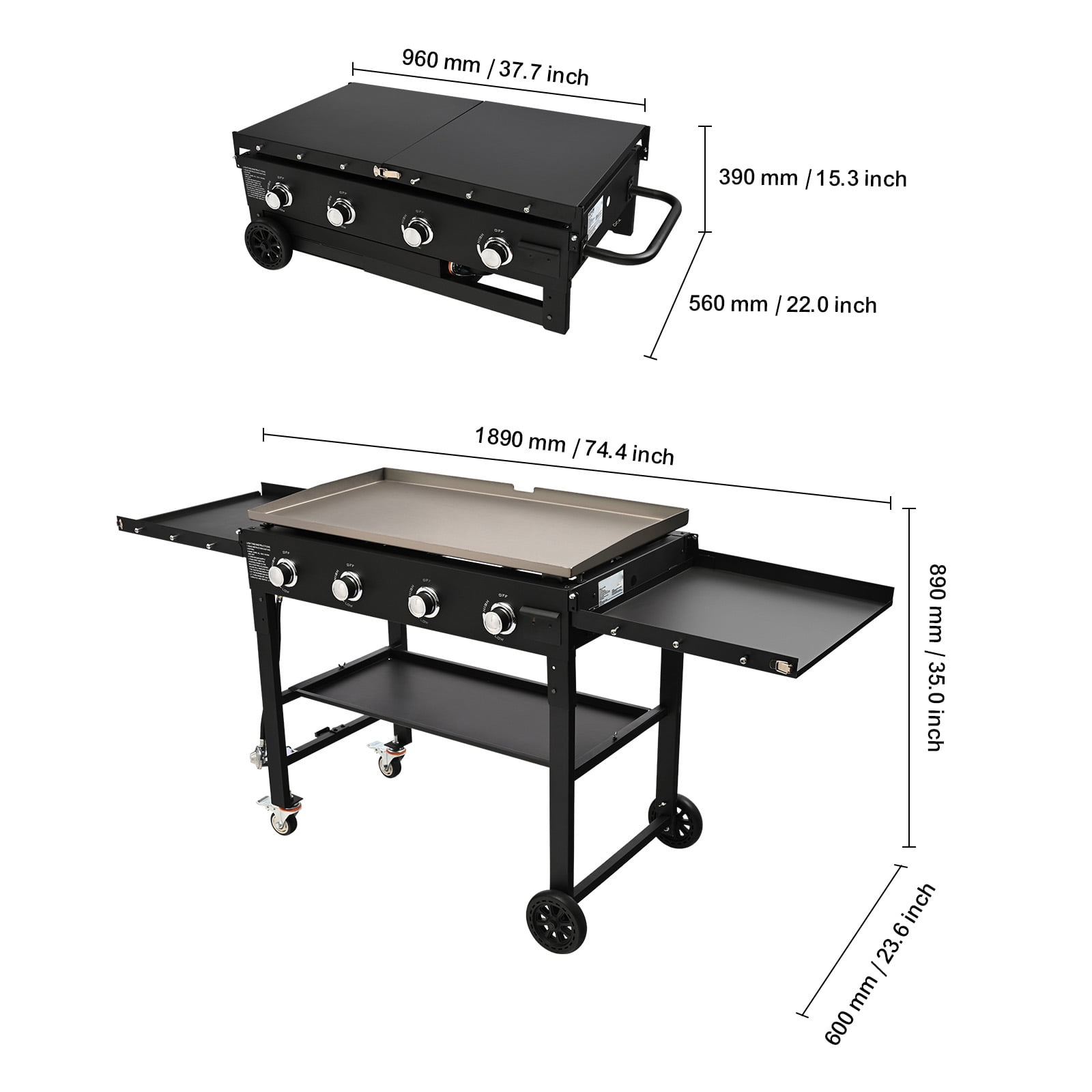 Product Description Multifunctional Grill This commercial flat-top grill can be used as a flip-top or for storage.It accelerates heating during use for fast and delicious cooking.Whether it’s camping, picnicking, or outdoor gatherings, it will enhance your outdoor cooking experience. Foldable Trolley Design Unlike other folding grills, this folding grill can be pulled directly like a trolley after folding, making it very convenient for outdoor adventures.Just take it out of your luggage and start moving.It has two lockable swivel wheels that provide stability during cooking. High-quality Hot-rolled Steel The griddle is made of sturdy hot-rolled steel and coated with a layer of vegetable oil to prevent rust and ensure healthy and worry-free cooking.It has passedTested toTested to UL StandardsStandardscertification and has undergone authoritative testing and evaluation to ensure the safety of you and your family. 36″ Large Baking Pan This 36-inch baking pan can accommodate large gatherings of food lovers and can cook a variety of dishes at the same time to satisfy big appetites.Equipped with 4 independent temperature control burners, different cooking areas can be realized, bringing a diverse cooking experience. Thoughtful Details 3 thoughtful design details make your outdoor cooking experience more enjoyable.Built-in grease collection system allows for better grease collection and easy cleaning.Pulse ignition ensures fast and easy cooking.The surface of the baking pan is coated with vegetable oil to prevent rust and allow for immediate cooking. UL Certified Rigorous safety testing and evaluation to ensure your peace of mind.It reduces the risk of fires and gas leaks, protecting you and your family. 4 H-type Burners With its unique design, it ensures even heat distribution and efficient combustion.Whether frying, grilling, sautéing or grilling, the H-burner delivers outstanding cooking results. Specifications Item Model Number: EGA94 Body Material: Q235 Carbon Steel Baking Pan Material: Hot-rolled Steel Weight: 42.2 kg / 93.03 lbs Baking Pan Size: 36″ Item Size: 1890x600x890 mm/ 74.4×23.6×35 inch Certification: Whole UnitTested toTested to UL StandardsStandardsCertified Package Content 1 x Commercial Gas Grill 1 x Hex Key
