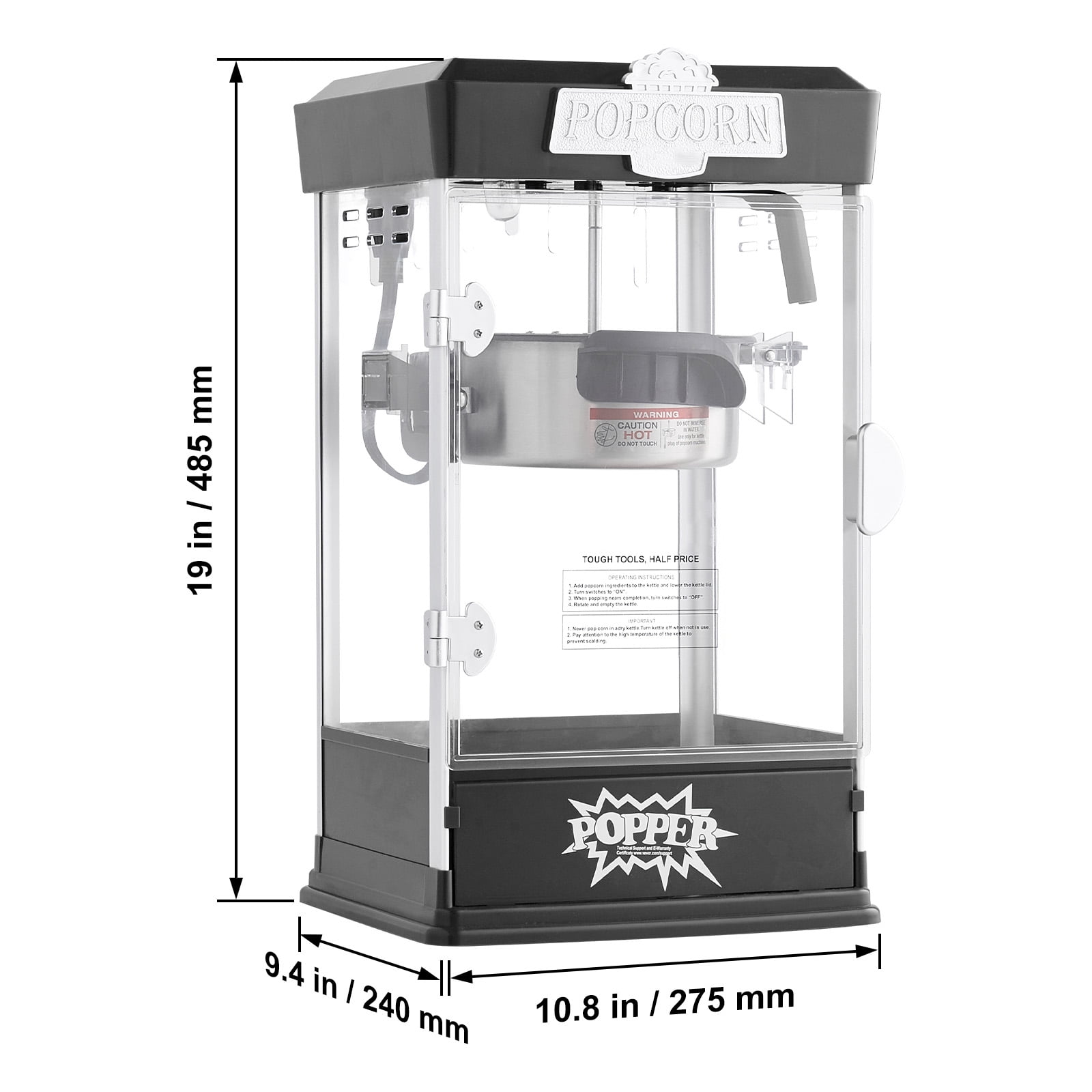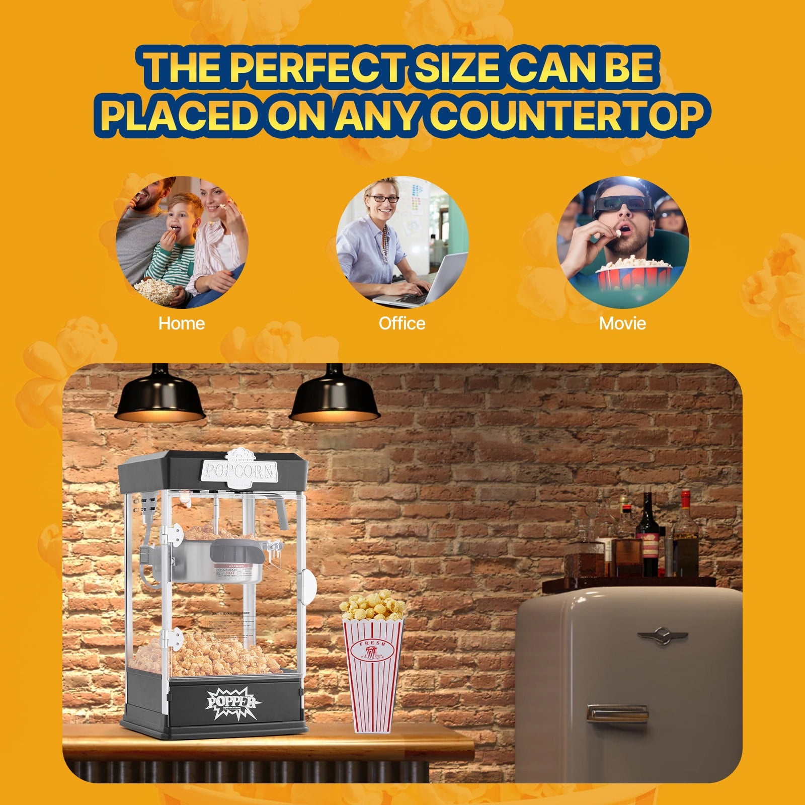 KFFKFF Commercial Popcorn Machine: With a 4 oz capacity, this popcorn machine can produce 1.5 gallons of popcorn per batch, perfect for busy families. The kettle preheats quickly, ensuring a steady supply of delicious popcorn for sports fans, festival goers, and party guests. Convenient Operation and Lasting Warmth: Our tabletop popcorn machine features an independent dual switch design, making it easy for any staff member to operate. The finished popcorn falls onto the warming tray, staying fresh and inviting with the help of a sparkling light that catches everyone’s attention. Durable structure and easy to clean: This popcorn maker features a cold-rolled steel frame and tempered glass panel, specially designed for frequent use. User-Friendly Design: When the heating tray fills up, simply open the hinged cover below to easily access the popcorn. The removable crumb tray keeps the interior clean, preventing scattered kernels. Collecting and disposing of dropped kernels has never been simpler. Complete Accessories: Our movie theater style popcorn machine comes with a corn scoop, an oil scoop, a popcorn spatula, a stirring stick assembly, a pot lid assembly, a popcorn shield (red), and a pot assembly. These accessories are ready to use right out of the box, making operation a breeze. Get ready to enjoy batch after batch of fresh and delicious popcorn!