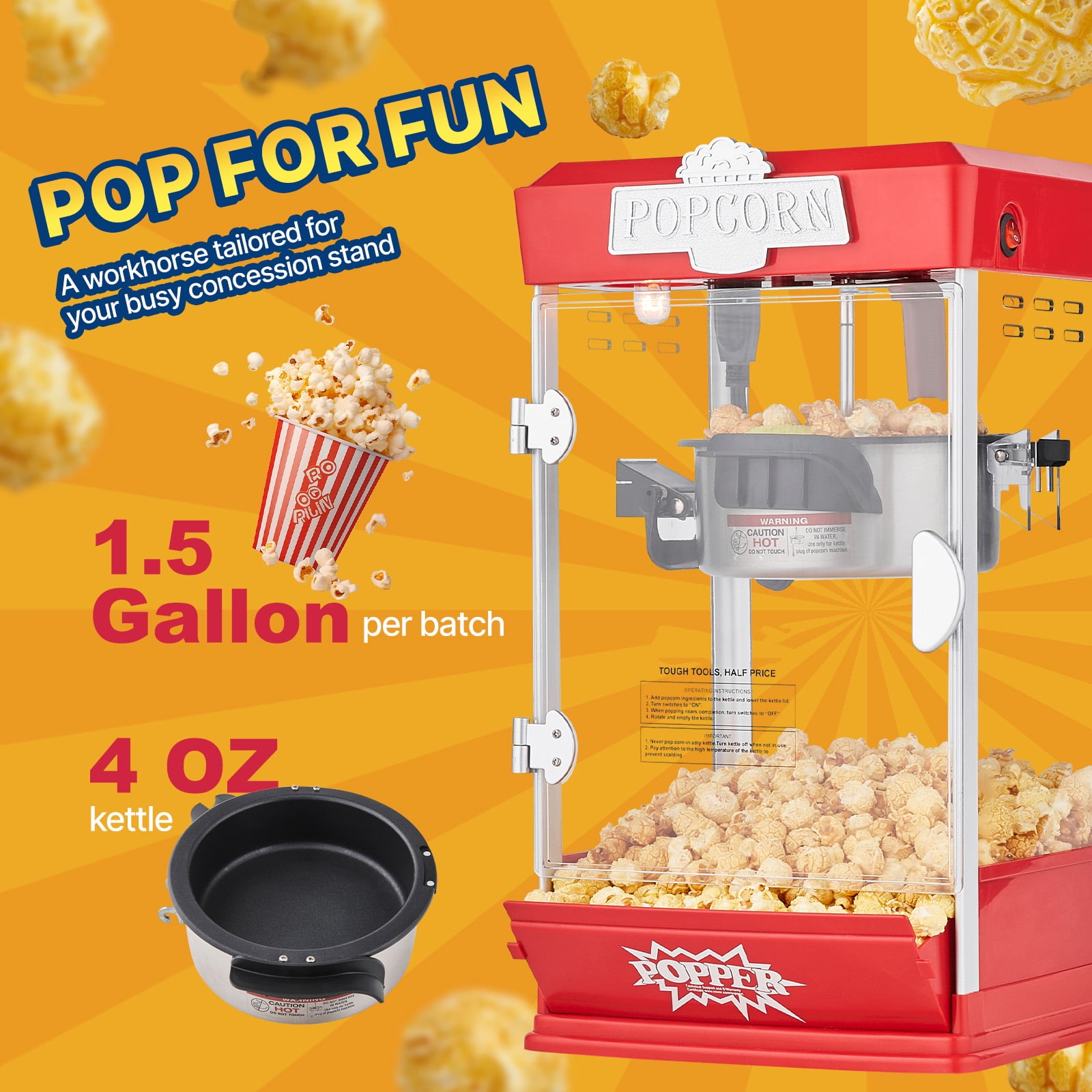 Small Machine, Big Output: With a 4 oz capacity, this commercial popcorn machine can produce 1.5 gallons of popcorn per batch, perfect for busy families. Get ready to satisfy sports fans, festival goers, and party guests with plenty to eat. Effortless Operation, Lasting Warmth: The independent dual switch design of this tabletop popcorn machine makes it easy for any staff to use. The finished popcorn falls onto the warming tray, staying fresh and sparkling under the light, attracting everyone’s attention. Durable structure and easy to clean: This popcorn maker features a cold-rolled steel frame and tempered glass panel, specially designed for frequent use. User-Friendly Design: When the heating tray fills up, simply open the hinged cover below to access the popcorn, ready to be scooped out. The removable crumb tray keeps the interior clean, eliminating scattered kernels. Collecting and disposing of dropped kernels has never been easier. Exciting Accessories: Included with this movie theater style popcorn machine are a corn scoop, an oil scoop, a popcorn spatula, a stirring stick assembly, a pot lid assembly, a popcorn shield (red), and a pot assembly. With these complete accessories, you can start making delicious popcorn right out of the box. Operation is a breeze, allowing you to enjoy batch after batch of fresh popcorn.