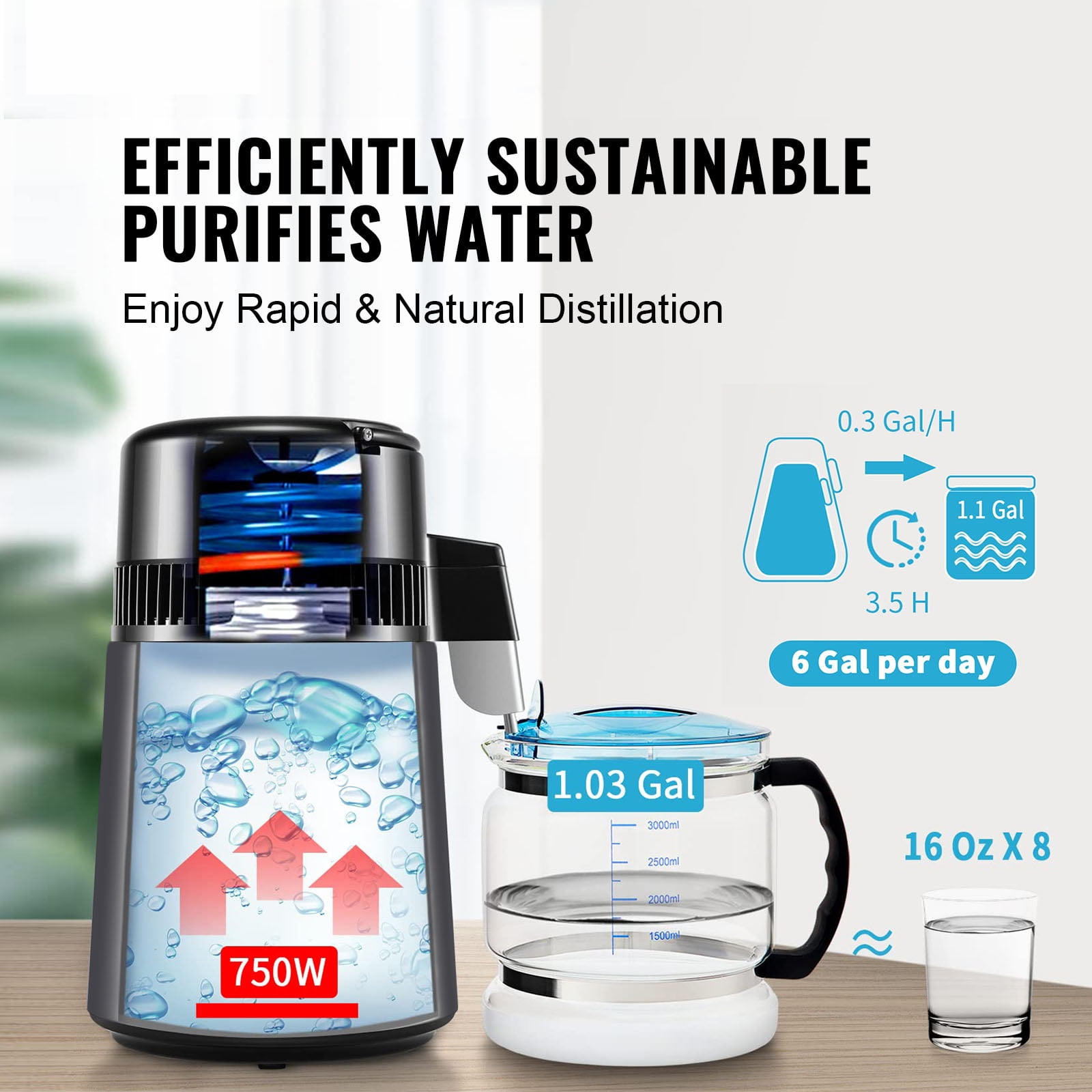 KFFKFF 4L/1.05Gal Water Distiller Purifier Machine Water Purifier Filter Countertop Stainless Steel 750W