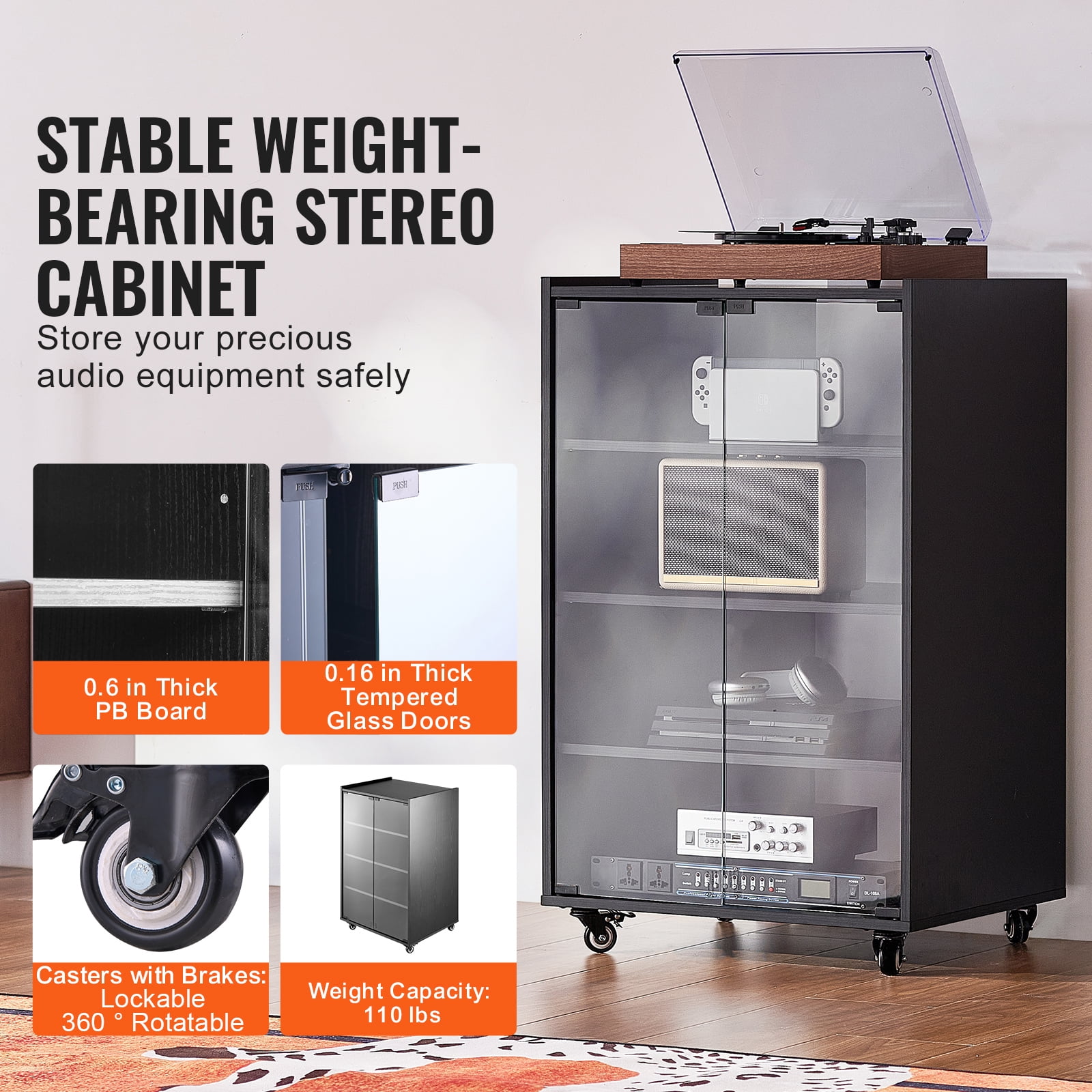 KFFKFF presents a durable floor-mounted stereo cabinet that can support up to 110 pounds. Made with sturdy PB board shelves, this cabinet ensures a secure and steady storage solution. Enhance your home decor with the elegant black oak wood design of this stereo cabinet audio rack. Its sophisticated black oak wood grain adds a touch of luxury to any space. Customize the height of the shelves to accommodate your audio and video equipment. With easy-to-adjust screws, you can create the perfect storage heights to fit your needs. Organize and store your recorders, DVD players, cable boxes, subwoofers, and turntables with ease. The av media stand offers ample storage space with its 5 layers of shelving. Designed for versatile use, this rack audio tower is perfect for living rooms, conference rooms, schools, hotels, and offices. Safely store your video players, recorders, radios, and stereo equipment.