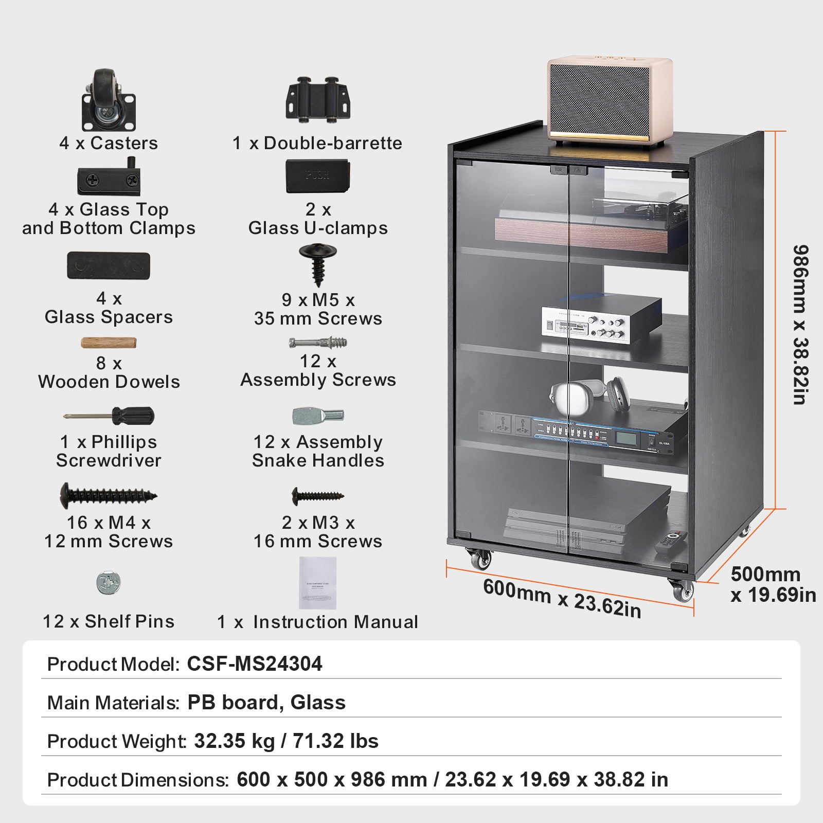 Product Description KFFKFF 5 Tiers AV Media Stand with Wheels-Organize Your Space! This versatile audio-video media stand is designed to support heavy loads and features durable PB board shelves. The impact-resistant tempered glass doors and abrasion-resistant casters with brakes ensure easy mobility. With its elegant black oak wood grain design, it adds a touch of sophistication to any space. The adjustable shelves allow for customizable storage heights, while the 5-layer design provides ample space for organizing various items such as recorders, DVD players, cable boxes, subwoofers, and turntables. Durable and Reliable Experience the ultimate durability with the KFFKFF audio-video media stand. Built to support up to 110 lbs, this stand is constructed with top-notch PB board, ensuring solid shelves that can withstand heavy equipment. The tempered glass doors provide added safety and impact resistance, making it a reliable choice for your audio and video needs. Additionally, the cabinet is equipped with sturdy casters featuring brakes, offering stability and preventing any unwanted movement. Efficient Cable Management Say goodbye to tangled wires and messy setups with the KFFKFF stereo cabinet audio. Featuring a smart rear cable management slot, this stand effectively hides and organizes your cables, creating a neat and clutter-free environment. Simplify your power connections and maintain a tidy appearance effortlessly with this innovative design. Customizable Shelf Heights Adapt the KFFKFF media stand to fit your unique needs with its adjustable shelves. The height of each shelf can be easily customized using screws, allowing you to accommodate audio and video equipment of various sizes. Whether you have tall recorders or compact DVD players, this stand offers the flexibility to create the perfect storage setup for your equipment. Spacious Storage Solution Discover the ample storage space provided by the KFFKFF av media stand. With 5 layers of shelving, this stand offers plenty of room for all your stereo equipment. From recorders and DVD players to cable boxes, subwoofers, and turntables, you can easily organize and display your devices in style. Keep your entertainment center clutter-free and enjoy quick access to your favorite media. Specifications Product Model: CSF-MS24304 Product Type: Floor-standing Color: Black Oak Number of Tiers: 5 Weight Capacity: 110 lbs Material: PB Product Dimensions: 600 x 500 x 986 mm / 23.62 x 19.69 x 38.82 in Product Weight: 34.25 kg / 75.51 lbs Package Content 1 x Instruction Manual 4 x Casters 1 x Double-barrette 4 x Glass Top and Bottom Clamps 2 x Glass U-clamps 4 x Glass Spacers 12 x Shelf Pins 9 x M5 x 35 mm Screws 8 x Wooden Dowels 12 x Assembly Screws 12 x Assembly Snake Handles 16 x M4 x 12 mm Screws 2 x M3 x 16 mm Screws 1 x Phillips Screwdriver