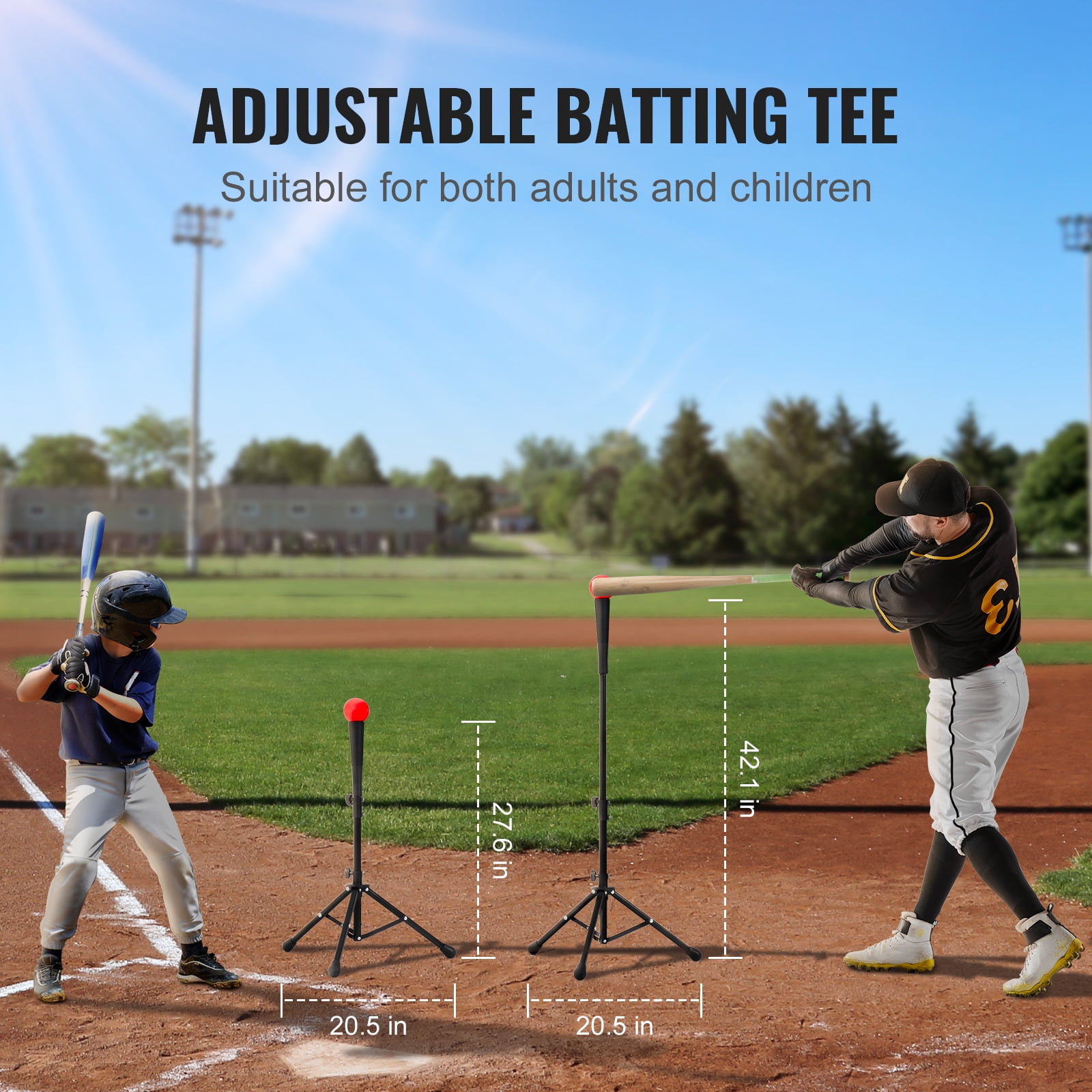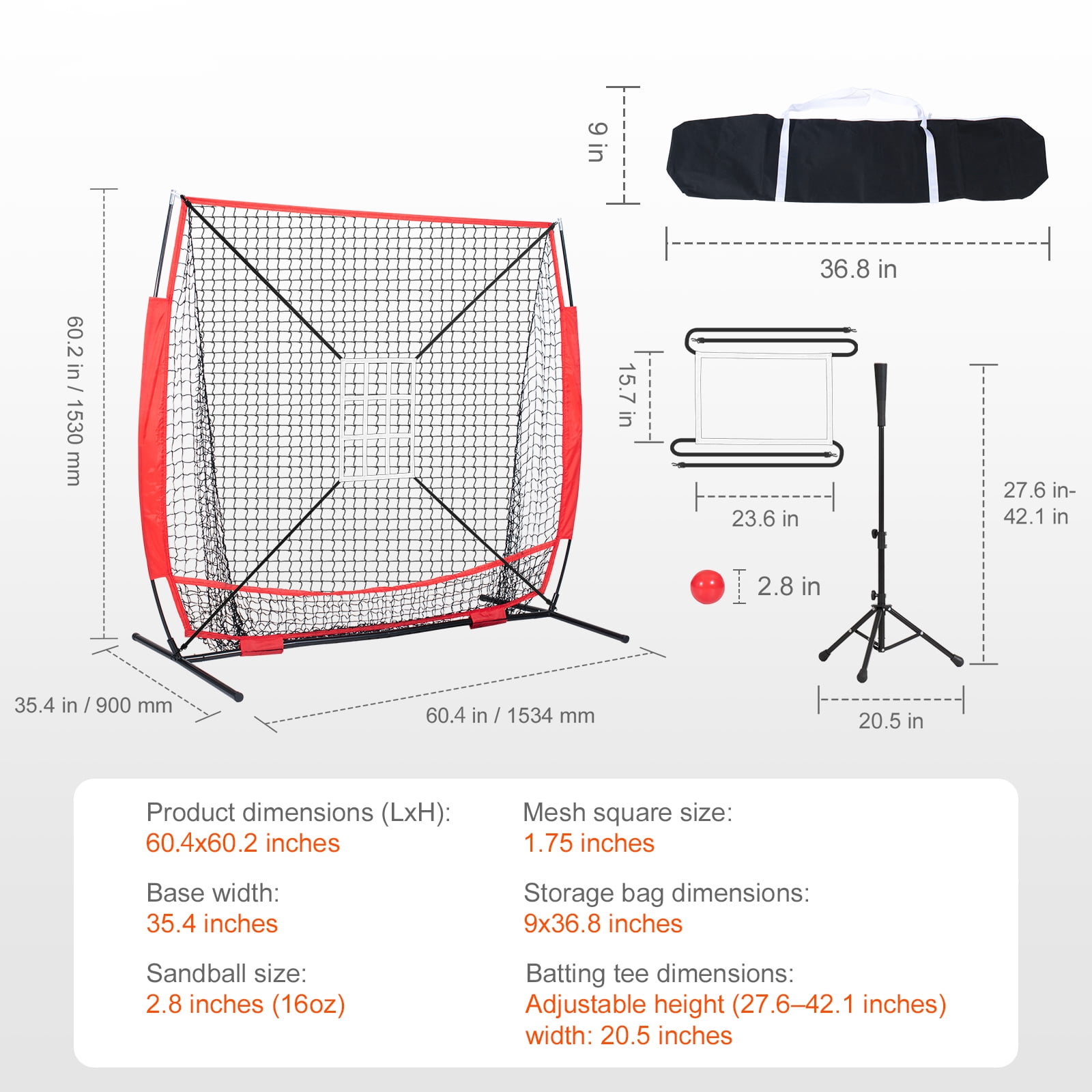 5x5ft Training Set: Beyond the basic net and support frame, this baseball softball practice net set also includes a square and nine-grid target frame, a tee stand, and a 2.8-inch sand-filled ball. Furthermore, it comes with a specialized storage bag for quick and easy packing. Suitable for both baseball and softball, the comprehensive accessories allow players to effectively practice pitching and catching, leading to rapid skill enhancement. Sturdy & Anti-Tipping Design: The supporting rods are crafted from 12.7mm thick fiberglass, boasting superior strength, flexibility, and weather resistance. Paired with a carbon steel support base, its robust structure offers powerful weight-bearing capabilities. This practice net for hitting and throwing resists aging and brittleness, ensuring a longer lifespan. Ideal for prolonged outdoor use! Tough & Wear-Resistant Netting: The baseball net is woven from high-strength, wear-resistant synthetic fibers like polyester and nylon. Its knotless weave renders a smooth and even surface, minimizing wear and breakage from ball-to-net friction. This results in a net that retains its shape over time and guarantees both high strength and durability. Enhanced Batting Training: The adjustable tee stand ranges from 27.6 to 42.1 inches, accommodating both adults and children. Paired with a 16oz sand-filled ball, it aids players in honing and enhancing their muscle strength and throwing techniques. Suitable for players of all skill levels, from beginners to seasoned pros. Dedicated Portable Storage Bag: Made from 600D Oxford fabric, its coarser and thicker weave offers superior wear resistance, enabling it to bear greater weights and wear. Additionally, it exhibits excellent resistance to weathering and aging, coupled with properties like chemical corrosion resistance, oxidation resistance, and flame retardancy. This results in a bag with enhanced stability, durability, and a prolonged lifespan.