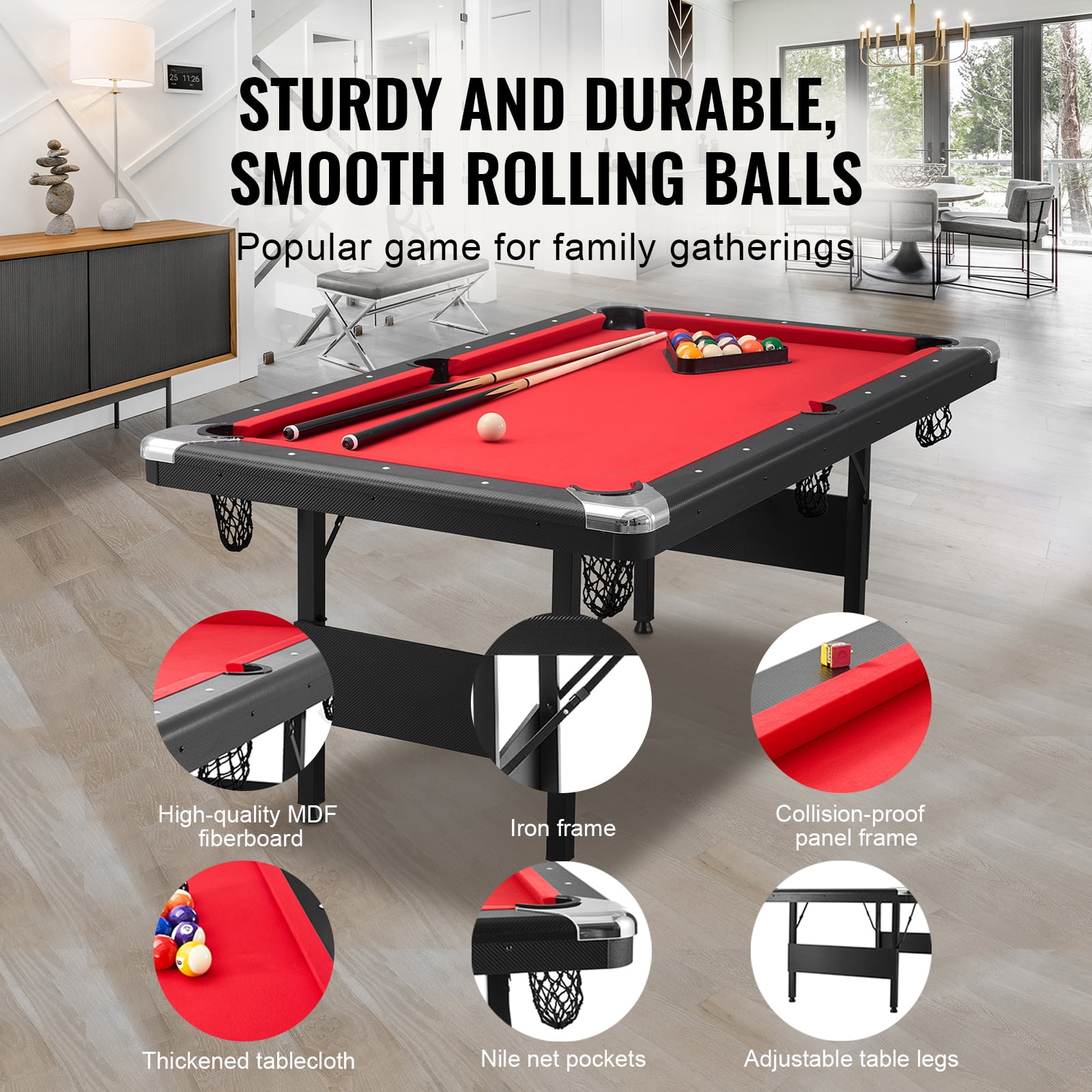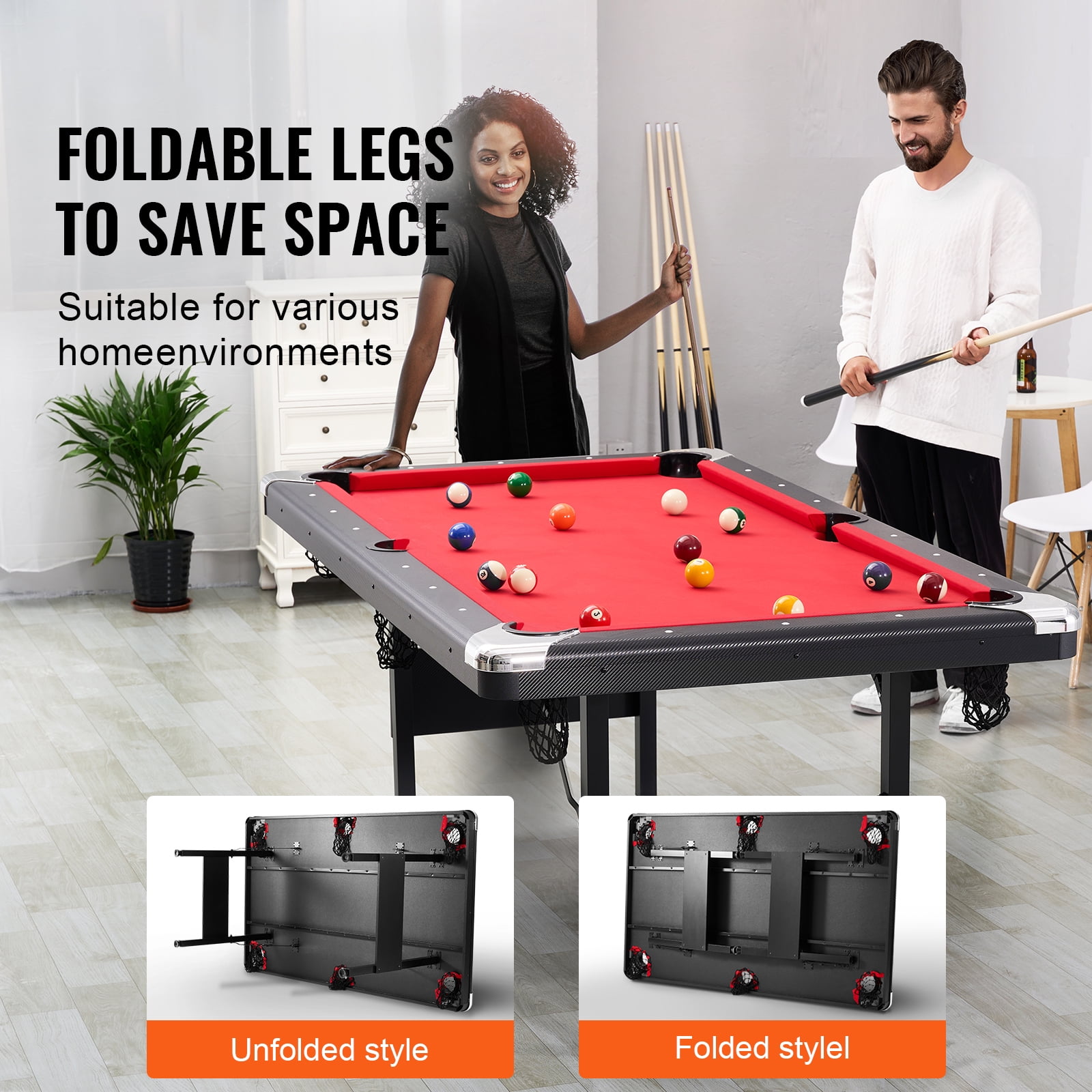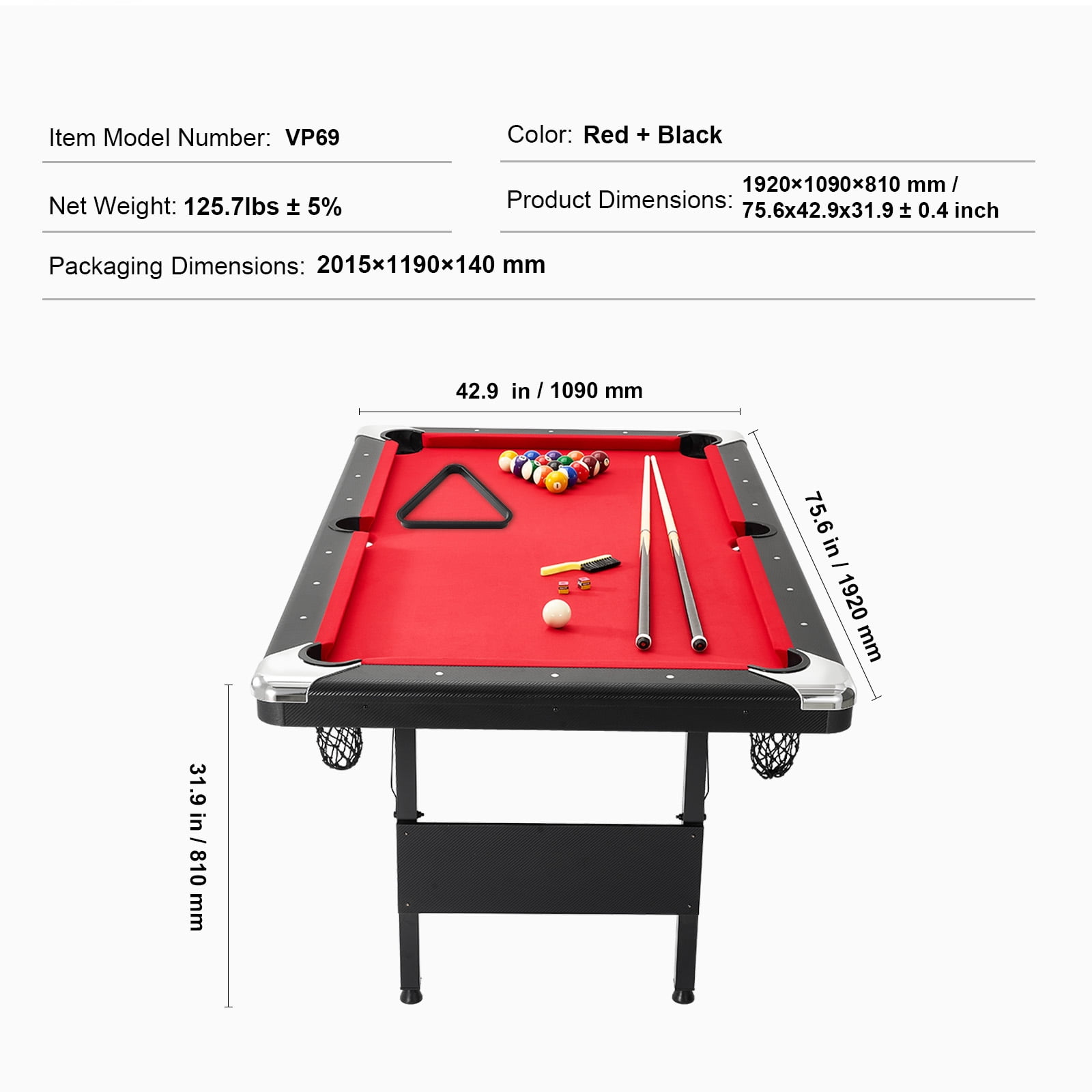 Foldable Billiard Table: Worried about not having enough space for a billiard table at home? We recommend a minimum room size of 12.5 x 16 ft. After playing, you can easily fold up the table to save space. Wide Application: A good billiard table significantly enhances the playing experience. Two Sizes Available: Choose from 6.3 feet and 7 feet table sizes to start a new, healthy lifestyle! Item Model Number: VP69 Color: Red and Black Net Weight: 125.7 lbs/57 kg ± 5% Product Dimensions: 75.6 x 42.9 x 31.9 ±0.4 inch/1920 x 1090 x 810 mm ±10 mm Package Content: 1 x Billiards Table, 1 x Set of Accessories