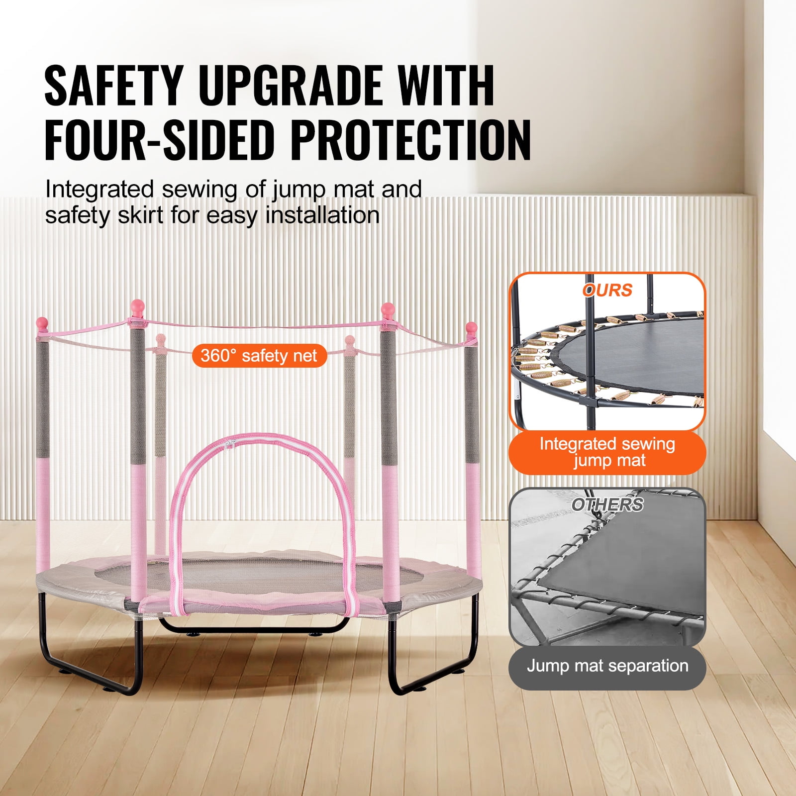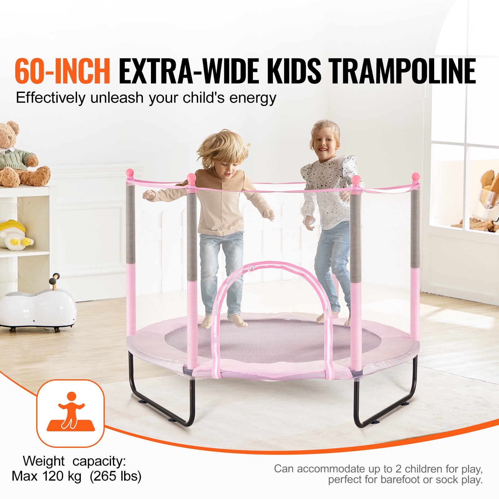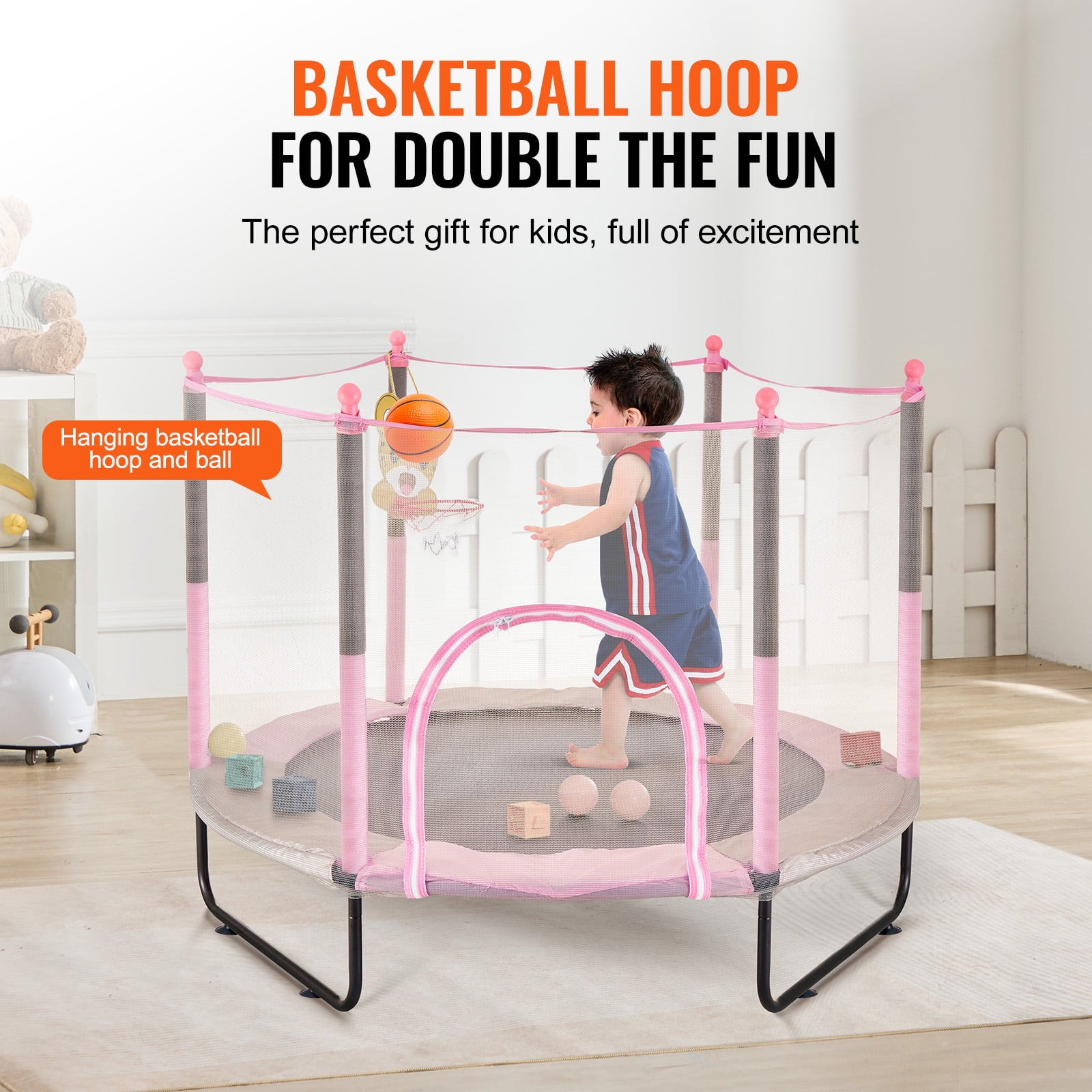 Larger and Spacious Kids Trampoline: Our 60-inch trampoline offers a generous jumping area, perfect for kids to release their energy and engage in a thrilling family activity. It allows two jumpers at a time, providing ample exercise and enhancing strength and endurance. Enhanced Jumping Mat: The jumping mat is designed with an integrated safety skirt, ensuring increased protection. Supported by 36 springs, this indoor outdoor toddler trampoline can hold a maximum weight of 120 kg (265 lbs), guaranteeing safety during every jump. The comprehensive safety features include six safety poles, a 360° enclosure net, and a U-shaped zipper. Double the Fun: Our mini baby toddler trampoline comes with exciting accessories like a hanging basketball hoop and ball, adding more excitement to the jumping experience. Whether it’s shooting hoops or bouncing, your child can enjoy endless fun indoors, outdoors, in the garden, or backyard. Durable and Stable Construction: We have upgraded the metal leg rods to be thicker, ensuring resistance to bending and deformation. The full steel structure provides exceptional strength and stability. The U-shaped legs feature six non-slip and quiet suction cups, allowing kids to jump without disturbing others. The wear-resistant and waterproof PP jumping mat is also easy to clean. Perfect Holiday Gift: This recreational trampoline is the ultimate source of bouncing entertainment for children, keeping them away from electronic devices and promoting physical growth. It is an ideal choice for holiday gifts, creating unforgettable memories for both kids and adults.