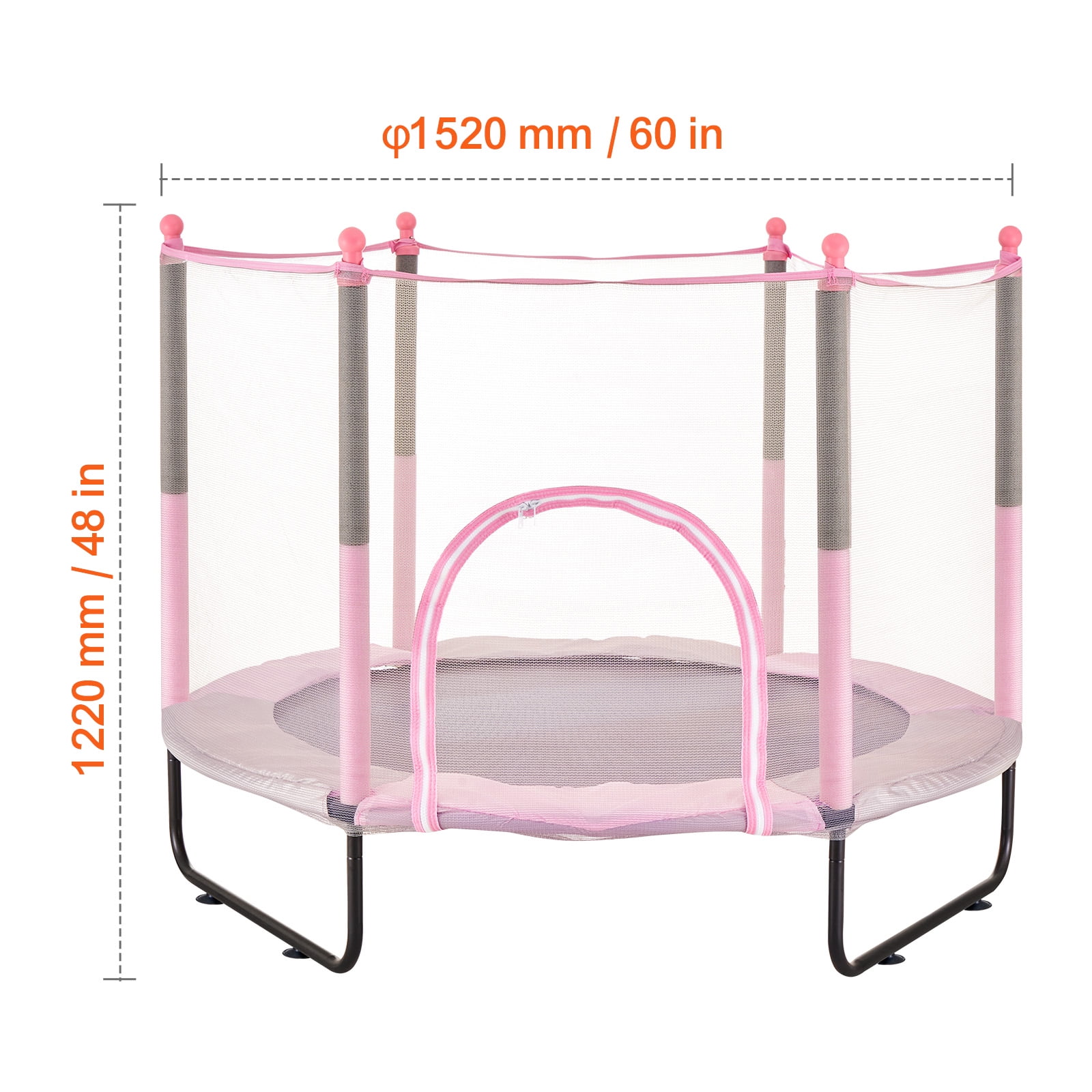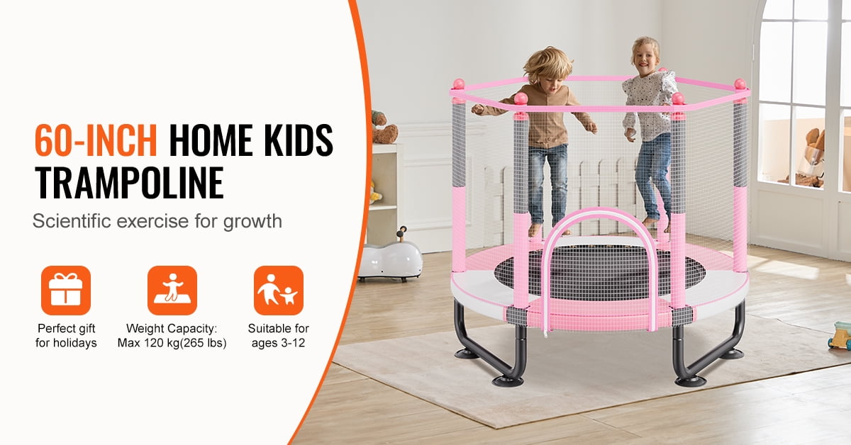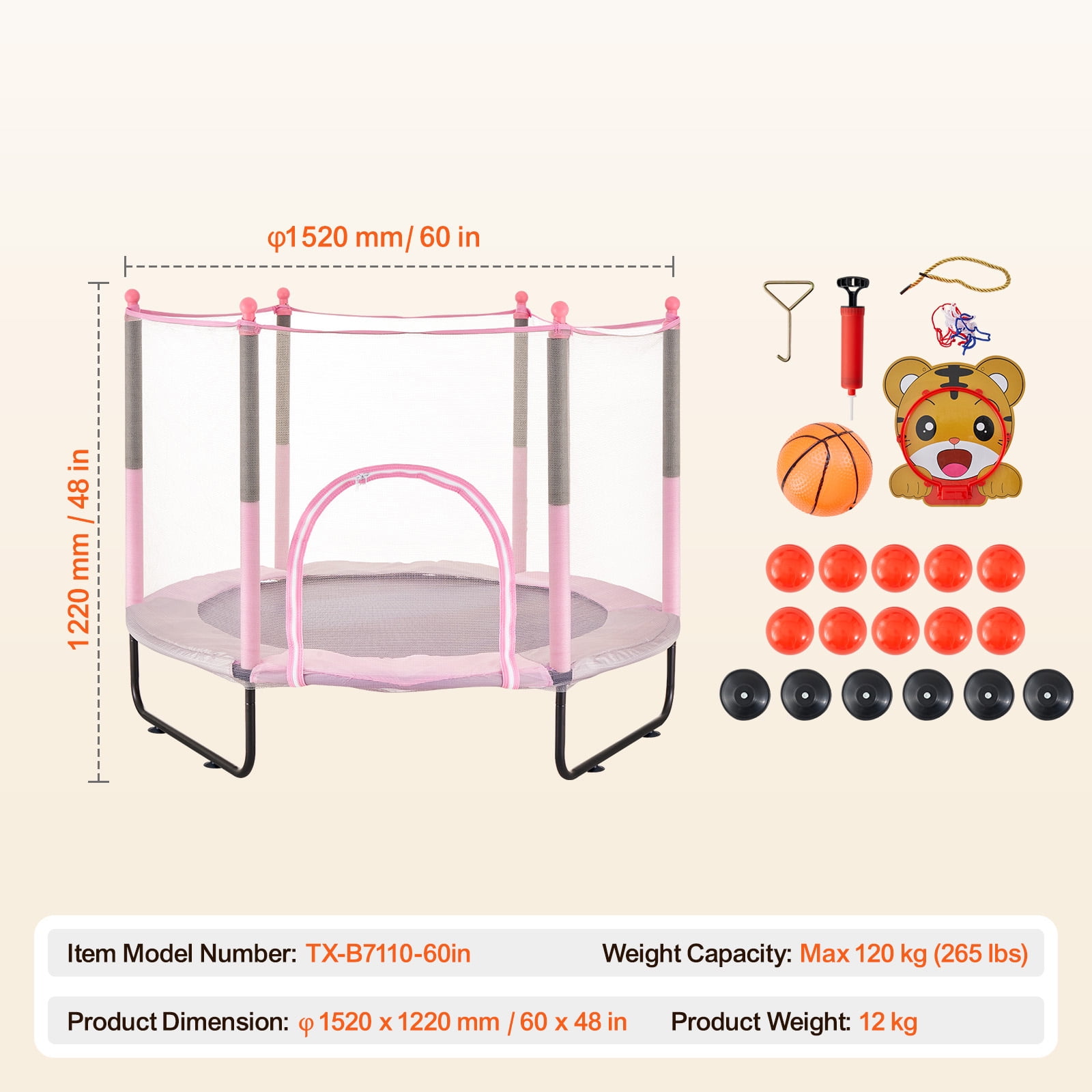 Product Description 60-inch Round Kids Trampoline with Net Experience the ultimate bouncing adventure with our 60-inch round kids trampoline. Designed to provide a safer jumping environment, this trampoline ensures endless fun for your little ones. With its spacious design, it can accommodate up to two children at once, making it perfect for kids aged 3-12. Whether it’s a holiday gift or a family bonding activity, this trampoline guarantees unforgettable moments and creates wonderful memories for both kids and adults. KFFKFF Larger and Wider Kids Trampoline This home toddler trampoline is perfect for both indoor and outdoor use, offering children a fantastic opportunity to engage in physical activities that enhance their strength and endurance. Additionally, it encourages fun-filled exercises that improve flexibility and coordination, ensuring a well-rounded playtime experience. Double the Fun with KFFKFF Our mini baby toddler trampoline comes with exciting accessories like a hanging basketball hoop and ball, providing endless opportunities for basketball and bouncing fun. Whether it’s indoors, outdoors, in the garden, or backyard, kids can enjoy a thrilling playtime experience with this versatile trampoline. Innovative Safety Design Featuring an integrated jumping mat and safety skirt, this trampoline ensures maximum safety during playtime. The elevated protective design guarantees stability under pressure, allowing for a higher weight capacity and reducing the risk of breakage. With every jump, children can feel secure and protected. Built to Last Crafted with a heavy-duty frame, a durable PP jumping mat, and a safety pad, this exercise trampoline is designed for long-lasting use. The stainless steel springs, rubber-headed leg tubes, and foam-covered handles further enhance its sturdiness and durability. Additionally, the suction cups on the legs provide cushioning and effectively reduce noise, ensuring a quiet and enjoyable playtime experience. Quick and Easy Installation Assembling the baby toddler trampoline is a breeze, requiring only one adult. Simply follow the provided instructions to assemble the frame, tighten the legs, and attach the mat to the jumping frame. The installation holes and threads are precisely matched, allowing for a hassle-free one-step installation process. The Perfect Holiday Gift This kids trampoline offers an exhilarating bouncing entertainment experience, diverting toddlers’ attention from electronic devices and promoting physical growth. It is an ideal choice for holiday gifts, creating unforgettable moments of joy and excitement for both kids and adults alike. Specifications Item Model Number: TX-B7110-60in Product Dimension: 60.8×47.6 inch / 1545×1210 mm Product Weight: 26.5 lbs / 12 kg Weight Capacity: Max 120 kg / 265 lbs Package Content 1 x Trampoline 1 x Set of Accessories