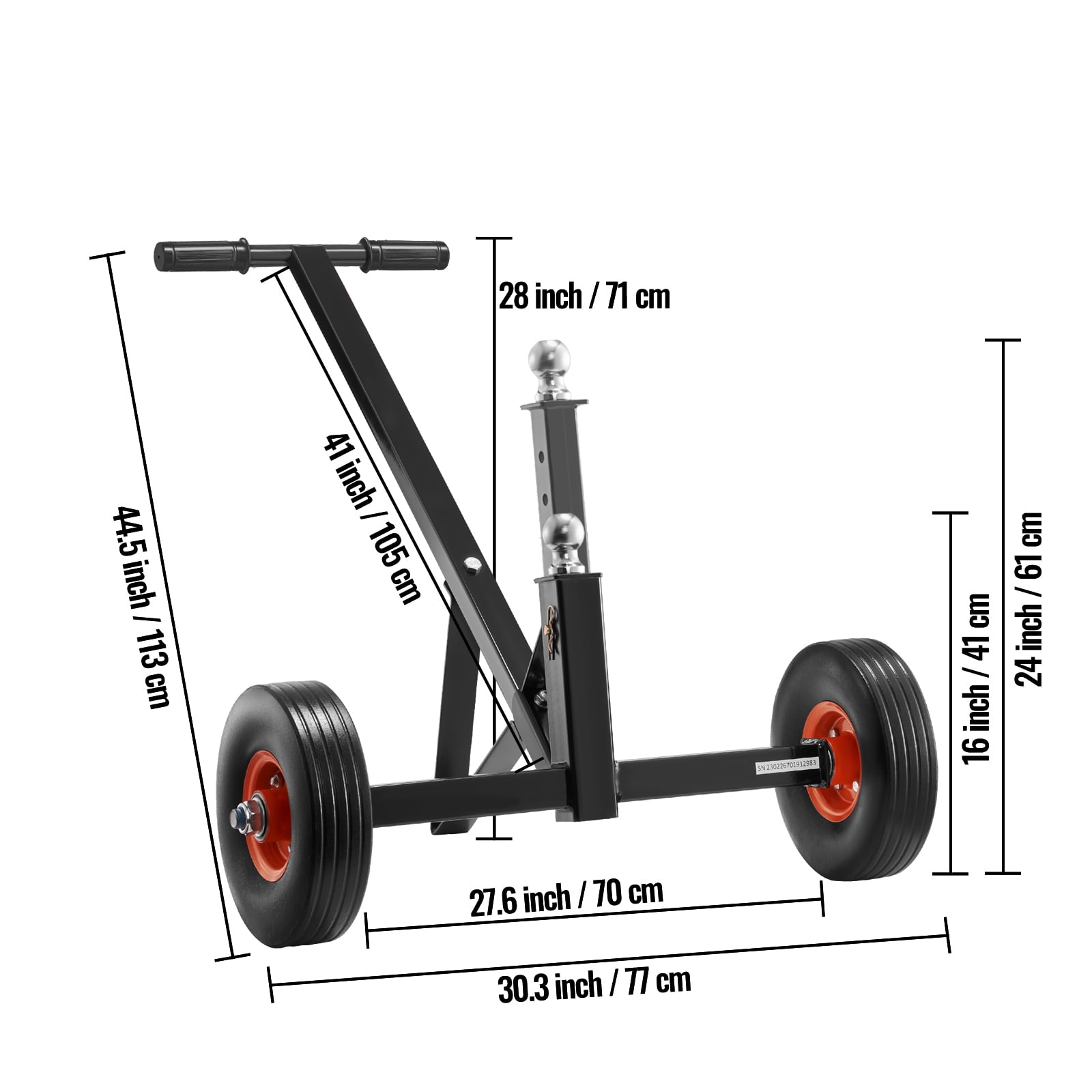 Strong Weight Capacity: Our adjustable trailer dolly has 600 lbs strong tongue weight capacity, allowing you to move various types of trailers up to 6000 lbs effortlessly. Adjustable Hitch Ball: It’s free for you to adjust the height of the hitch ball in the range of 16”-24” to accommodate different sizes of trailers. With a 1-7/8” diameter universal ball, you can perfectly connect the dolly with the coupler of trailers. Reliable Tires Design: This trailer mover dolly is equipped with 10” large-sized solid tires, capable of rolling smoothly on grassland, sand, gravel road, and so on without worries about a flat tire. In addition, the front triangle support can bring stability when the dolly moves. Excellent Quality: Made of high-quality carbon steel with a powder-coating surface, our trailer mover is rustproof and stylish for outdoor use. The 27.6” widened wheelbase makes your work stable and effortless on uphill and downhill roads. The 41” long handle with rubber sleeves is well-designed for pulling comfortably without bending over. Move All Kinds of Trailers: This trailer tow dolly is your ideal option to move your boat trailers, utility, cargo trailers, and other small and medium-sized trailers into storage, through tight areas, and in spaces where you can’t park them. It’s widely used on yards, carports, driveways, caravan parks, etc.