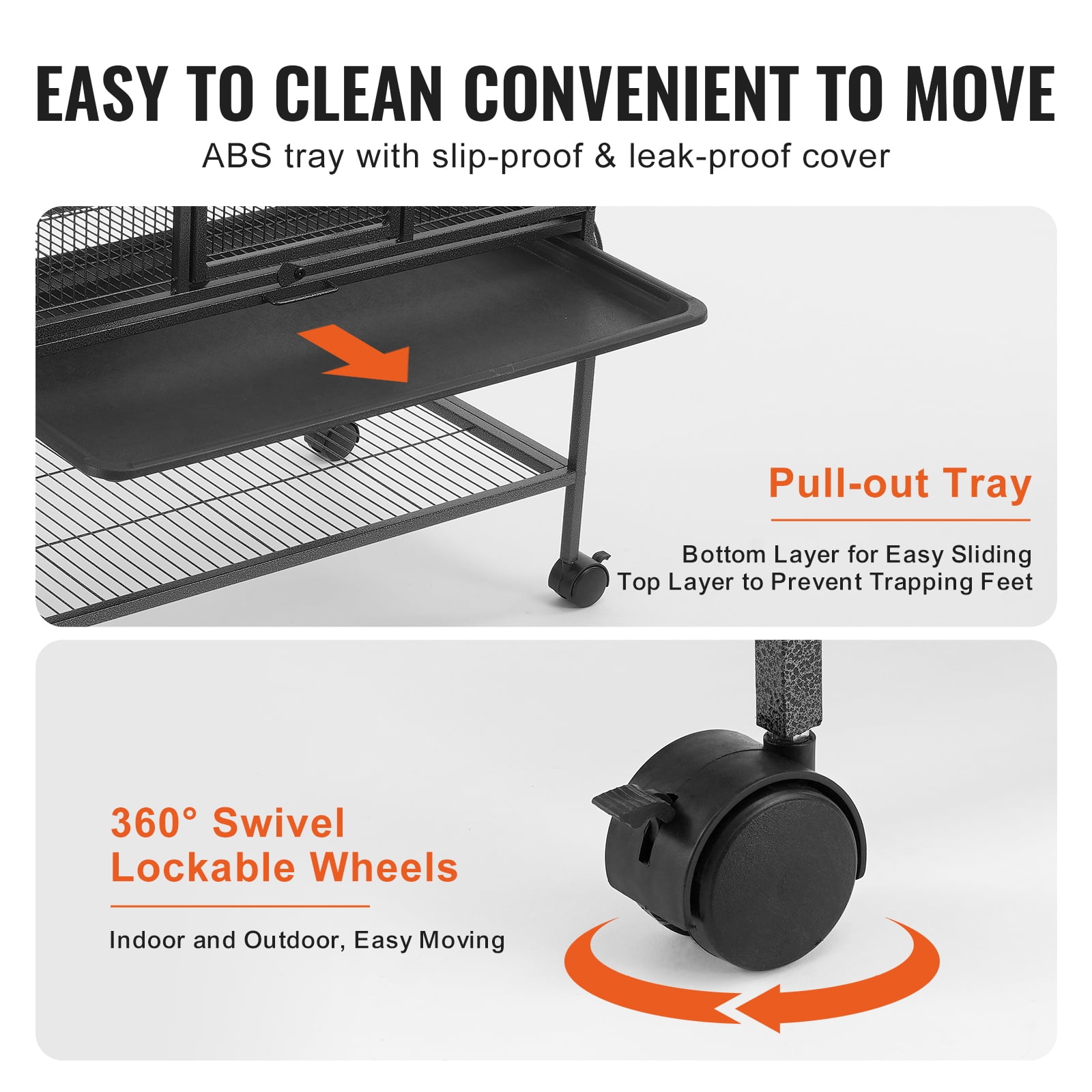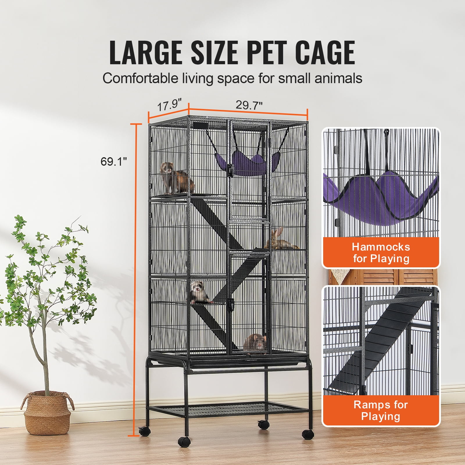 Product Description A Haven for Your Furry Companions! Crafted from durable 0.5″ metal square tubes and reinforced wire, this 4-tier small pet cage offers a waterproof and rust-resistant design. It offers a generous living space of 29.7″ x 17.9″ x 69.1″, perfect for mice, ferrets, chinchillas, guinea pigs, hedgehogs, and kittens. Ample Space The KFFKFF ferret cage measures 29.7″ x 17.9″ x 69.1″ and features 4 platforms of varying heights. It offers a spacious living area for one or multiple small animals, ensuring maximum comfort and endless fun. Versatile for Various Pets Not only suitable for ferrets, but also perfect for rodents, chinchillas, squirrels, flying squirrels, and other adorable pets. The narrow spacing of just 1/2″ ensures a safe and cozy living environment for all, promoting their well-being. Sturdy and Enduring Constructed with robust powder-coated metal mesh and 0.5″ metal square tubes, this small animal cage is built to last. Its rust-proof and wear-resistant surfaces guarantee long-lasting durability. The thickened wire mesh prevents bending and deformation, ensuring a cage that stands the test of time. Convenient Storage and Easy Cleaning Featuring a detachable storage rack at the bottom, this cage allows for separate placement. The rack provides space-saving storage for pet items. The pull-out bottom tray, wrapped in ABS material, prevents foot jamming and urine leakage, making cleaning a breeze. Intelligent Design Equipped with 3 non-slip ramps and 4 platforms, this critter cage offers easy access for small animals. The flannel-covered ramps ensure secure footing, while the added hammock provides extra variety. The double doors and top window allow for convenient feeding, and the lockable wheels ensure effortless mobility both indoors and outdoors. Enhanced Durability The KFFKFF metal rolling pet cage features multiple horizontal iron wires, reinforcing its structure and enhancing durability. These wires also provide additional surfaces for pets to grip, promoting their physical activity. Moreover, this design allows for easy attachment of various accessories. Specifications Item Model Number: JM-XC-085 Primary Materials: Iron + Plastic + Velvet Product Size: 29.7″x17.9″x69.1″/755x455x1755 mm Wire Spacing: 1/2 inch Color: Black Product Weight: 47.84 lbs/21.7 kg Package Content 1 x User Manual 1 x Metal Cage 2 x Plastic Wheels 1 x Plastic Tray 3 x Metal Ladders 3 x Metal Platforms 1 x Hammock 20 x Screws 1 x Hex Key 1 x Hex Wrench