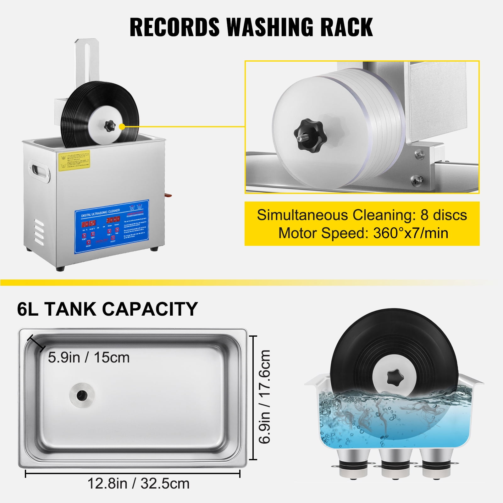 [Super Material] -The overall 304 stainless steel structure, internal water tank size: 11.8×5.9×5.9 “”. After long-term use, rust-proof, no liquid leakage. The stainless steel lid can prevent dust from entering when not in use. [Cleaning Ability]-Ultrasonic frequency: 40kHz, 3 x 180W converter. Ultrasound cleaning vinyl records can be cleaned at a time, 6 vinyl records, record size: 7 “-12”. [Adjustable Design] -Atfight according to different needs, the washing temperature can be adjusted between 20-80 ° C. You can also set up working hours: 0-30 minutes. [Control Panel] -D Number display and control panel for accurate washing time and temperature control. The button is adjusted, and the commercial ultrasonic cleaning machines are simple. [A Full Set of Accessories] -The packaging includes ultrasonic records of cleaner 6L, cleaning rack, drying rack, screwdriver, lid, power cord and plug, and the user manual guidance.