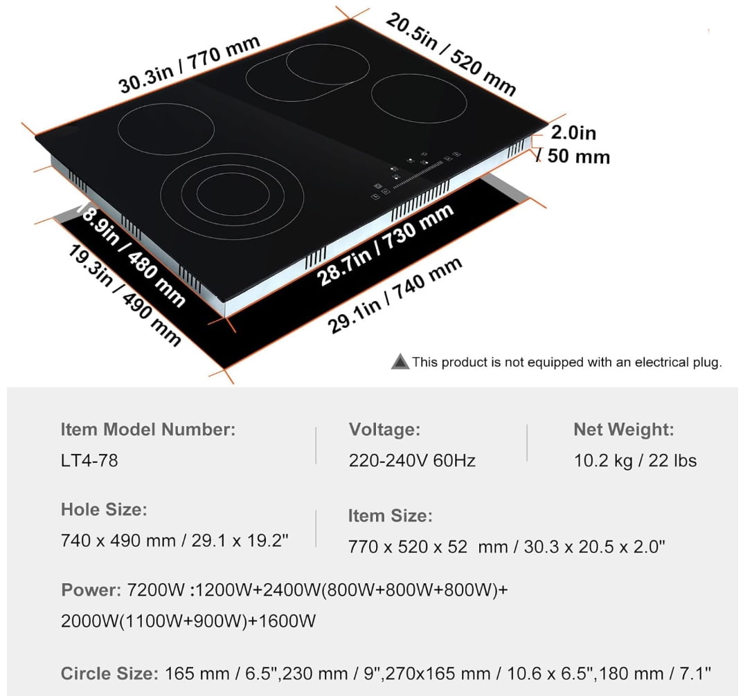 Product Description Built-in Electric Cooktop Our radiant cooktop adopts multiple burners with strong power, offering rapid and stable heating. It is equipped with sensor touch controls with ON/OFF switch. No high-frequency radiation, gravidas can also enjoy the fun of cooking. This built-in ceramic cooktop is your excellent cooking companion. Separate Heating Areas The vertical heat conduction promotes heating efficiency with less heat loss.With 4 independent heating burners, our electric cooktop reaches high power output of 7200W. Apply Anywhere It is suitable for most cooking styles such as boil, simmer, fry, stew, etc.Our ceramic electric stove can be used with any cookware in your home, such as aluminum pans, copper pans, cast iron frying pans, and non-magnetic stainless steel pans. Secure-Guarding Design Our radiant cooktop is equipped with several measures for use security, including child lock, overheat protection, spill-auto shutdown, and residual heat indicator, providing you with a reassuring and secure user experience. Ready to Use The built-in design, it is effortless for you to install this cooktop into your kitchen, and it also saves a lot of your cooking space.The cutout size of our electric cooktop is 29.1×19.2 inches. Sensor Touch Control The separate burner controllers allow you to operate single or multiple burners according to different demands.There are adjustable heating levels, precisely controlling the temp. Glass Surface Made of glass, the surface of our cooktop is heat-proof and easy to clean, presenting a stylish and beautiful appearance. Specifications Item Model Number: LT4-78 Voltage: 220-240V 60Hz Total Power: 7200W Time Setting: 0-99 Minutes Net Weight: 22 lbs/ 10 kg Item Size: 30.3 x 20.5 x 2.4 inch / 770 x 520 x 62 mm Package Content 1 x Cooktop 1 x User Manual