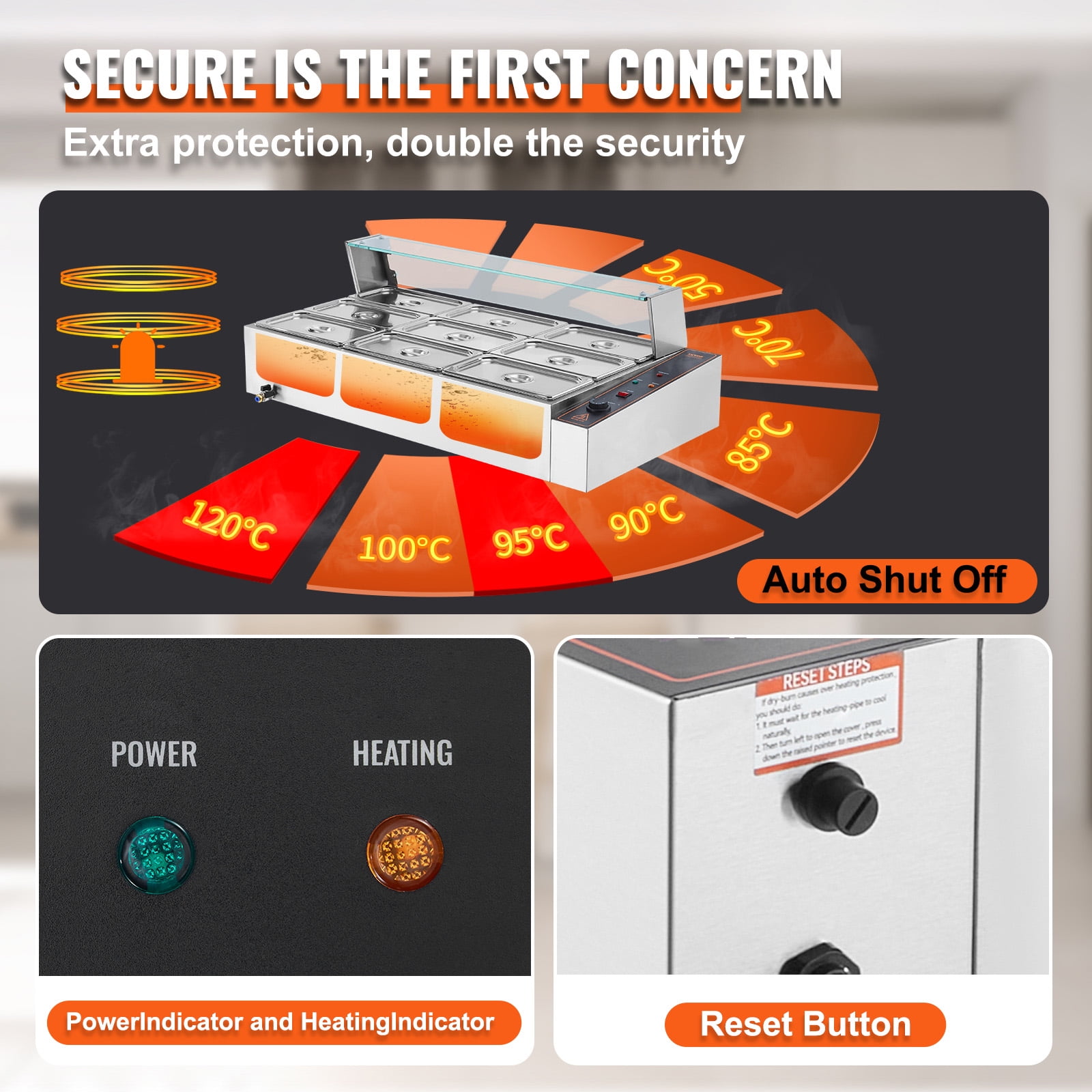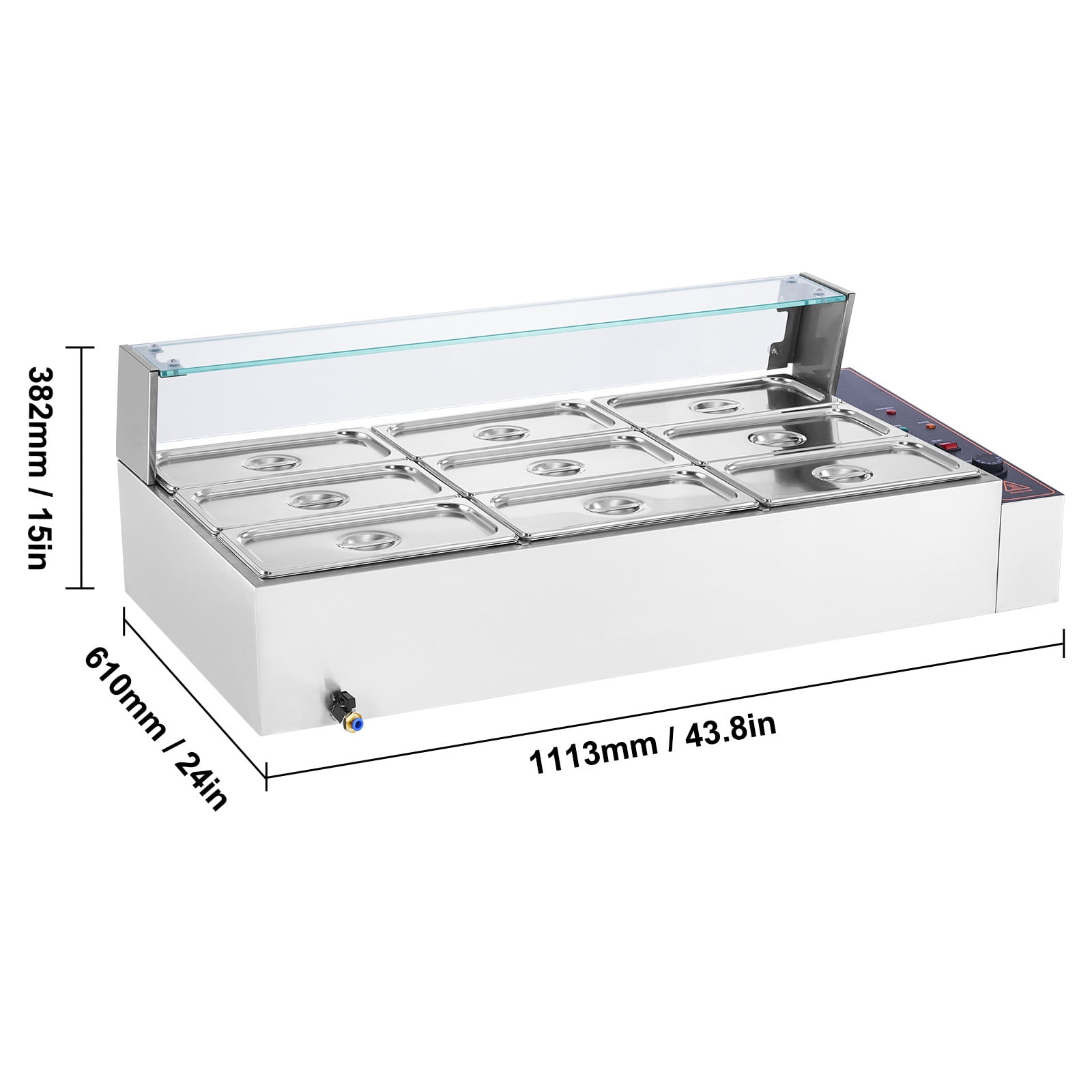 Product Description KFFKFF Food Warmer with Glass Cover Introducing the KFFKFF Food Warmer with Glass Cover, the ultimate solution for maintaining the perfect temperature of your food for extended periods. Whether you’re serving chicken strips, french fries, egg rolls, or side dishes, this electric countertop food warmer is a must-have addition to your catering or outdoor event setup. Its compact design and versatile features make it an ideal choice for buffet tables, concession stands, and backyard BBQs. Crafted with a robust stainless steel build, this food warmer ensures durability and long-lasting performance. The thoughtful detail design provides additional security and convenience. Plus, it includes pans for added convenience. Upgrade your food service experience with the KFFKFF Food Warmer with Glass Cover. KFFKFF Commercial Food Warmer with Glass Cover Introducing the KFFKFF Commercial Food Warmer with Glass Cover, a must-have addition to any professional kitchen. Crafted with premium stainless steel, this 9-pan food warmer is built to last. The sleek glass cover not only adds a touch of elegance but also keeps your food warm and protected. Say goodbye to dry-burned dishes with our innovative dry-burn prevention system and reset button, ensuring the longevity of your food warmer. Includes 9 Pan for Maximum Efficiency We understand the demands of a busy commercial kitchen, which is why our KFFKFF Commercial Food Warmer comes with 9 x 5qt food pans and their respective lids. This means you can heat more food at once, allowing you to serve your customers faster. Keep your delicious dishes consistently warm for extended periods, ensuring customer satisfaction every time. Experience Precise Temperature Control With our adjustable temperature feature, you have full control over the warmth of your food. The meticulously designed heating element provides quick and even warming, guaranteeing that every bite is as delightful as the first. Set the temperature between 86 – 185℉ / 30 – 85℃, and let our food warmer do the rest. Your food will stay at the ideal serving temperature, ready to be enjoyed. Innovative Dry-Burn Protection System We prioritize safety in our KFFKFF Commercial Food Warmer. Our dry-burn protection system automatically detects if the water level falls below the required level, preventing any damage. An indicator light will alert you to the dry-burn condition, and the heating process will stop automatically. Simply add water and press the “Reset” button to resume normal operation. Enjoy peace of mind knowing that your food warmer is equipped with the latest safety features. Versatile Usage for Various Settings The KFFKFF Commercial Food Warmer is not limited to just one setting. It is perfect for hotels, snack bars, cafeterias, and outdoor parties. Whether you’re hosting a large event or preparing meals for your guests, this food warmer will enhance your food preparation efficiency. Impress your customers with consistently warm and delicious dishes, no matter the occasion. Wide Application for Enhanced Efficiency Enhance your food preparation efficiency with the KFFKFF Commercial Food Warmer. Its wide application makes it suitable for hotels, snack bars, cafeterias, and outdoor parties. No matter the setting, this food warmer will elevate your culinary experience. Prepare and serve your dishes with ease, knowing that they will stay warm and ready to be savored. Specifications Item Model Number: SC-TC-319 Power: 1500W Capacity: 9 x 5QT Temperature Range: 86-185°F / 30-85°C Main Material: Stainless Steel Product Weight: 25 kg / 55.1 lbs Product Size: 1113 x 610 x 382 mm / 43.8 x 24 x 15 in Package Content 1 x Food Warmer 9 x Food Pans 1 x Soup Ladle 1 x Perforated Ladle 1 x Food Tong Installation Pack