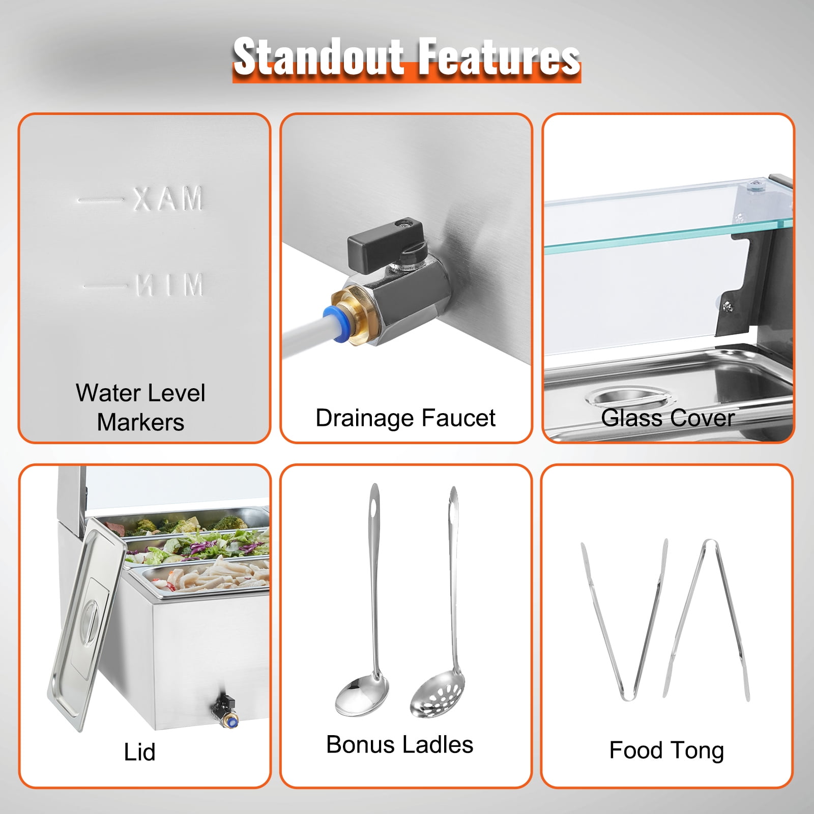 Experience Fast Heating and Lasting Warmth: The KFFKFF food warmer is equipped with a powerful 1500-watt stainless steel heating tube that quickly warms up your food, ensuring it stays hot and delicious. Adjust the temperature output to your liking, ranging from 86-185°F / 30-85°C, thanks to the temperature controller. Durable Stainless Steel Construction: Built to withstand constant use, this food warmer features a robust all-stainless steel build. It is not only sturdy but also easy to clean and maintain. The well has a thickened wall (0.03″ / 0.8 mm thick) for added strength and a secure water seal. Enhanced Safety Features: Our food warmer now includes a newly designed “Dry Burning Indicator” and “Reset Button” for additional security. The dry-burning indicator function automatically stops heating the food when the temperature exceeds 248°F (120°C). Simply press the Reset Button to resume operations. Convenient Design for Easy Use: The well of the food warmer is designed with water level markers inside, making water maintenance effortless. It also features a convenient faucet for draining water after use, reducing the hassle of cleaning the machine’s interior. Additionally, two extra long-handled ladles are included, perfect for deep pots. Versatile and Spacious: With nine 5QT food pans (9*1/3-Size) and their respective lids, our commercial food warmer allows you to serve a variety of dishes simultaneously. From soups and sauces to stew, nacho cheese, and even chocolate, feel free to change up your menu.