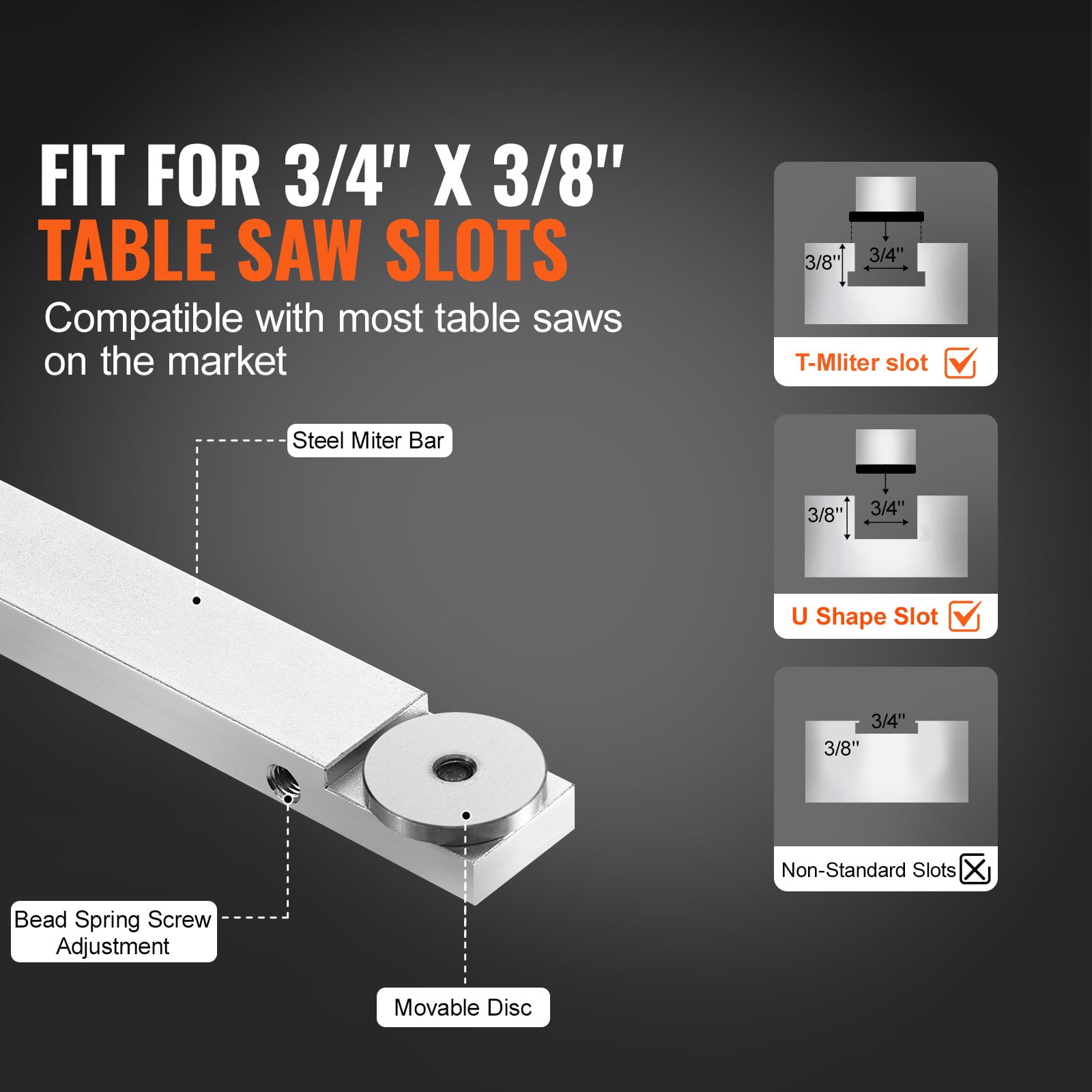 Designed to fit most standard table saw slots measuring 3/4 x 3/8 in (19 x 9.5 mm) Adjustable solid aluminum head with 15 positive stop holes for precise angle cutting Shipped partially assembled for easy setup Steel miter bar with adjustable bead spring plunger for simple adjustment Constructed from durable aluminum alloy with a retractable grating and laser-engraved angle plate scale