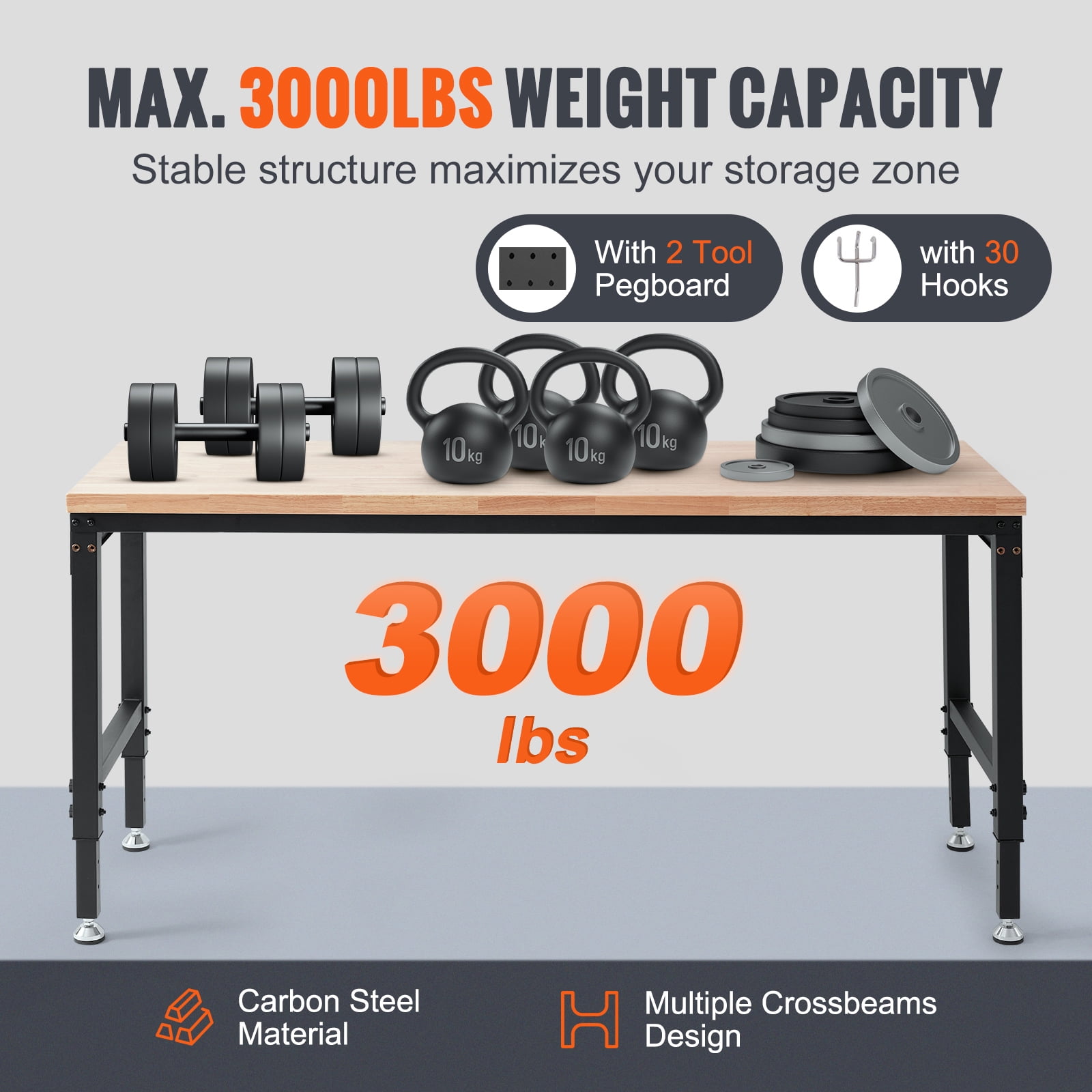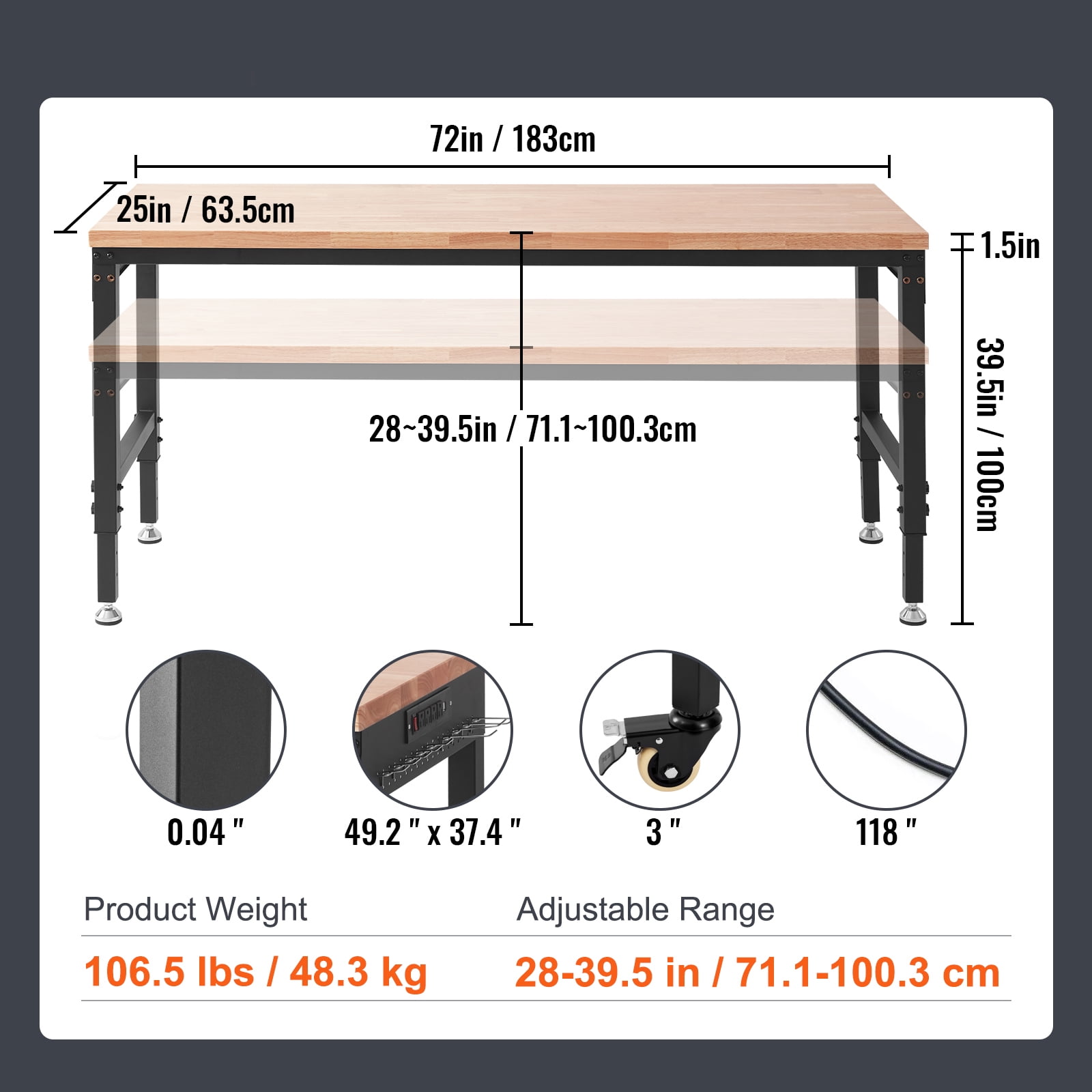 Product Description KFFKFF adjustable Work bench The height of the solid wood work bench is adjustable, and the stable structure can withstand a weight of up to 3000lbs. It is equipped with a built-in power board and a movable universal wheel that can follow you to any work place, making it more convenient and faster for you to complete your work. Universal Wheels The 360° Rotatable wheels can withstand 1543lbs weight and can move anywhere you want, with the braking function to stabilize the table legs. Rubber Feet The fixed feet can withstand 3000lbs weight and is suitable for various uneven grounds, making it more stable and sturdy during operation. Solid Wood Desktop The selected solid oak desktop, with 1.2” thick and stylish wood grain, is sturdy and durable to use, and easy cleaning after work. Multifunctional Sockets The built-in power board is equipped with 4 AC sockets and 2 USB ports, and a 118 “cable providing power at any time. Height Adjustable There are 10 height adjustment holes, allowing you to adjust the table to the suitable height by hand effortlessly without tools. Powerful Storage It contains 30 hooks and nail plates on both sides, which can neatly store all your tools, making tools easy to access and work faster. Specifications Model: SHFGM7225 Desktop Material: Oak Plank Frame Material: Carbon Steel Voltage: 125 V / 60 Hz Current: 15 A Cable Length: 9.8 ft / 3 m Certification: ETL Certification Adjustment Holes: 10 Weight Capacity: 3000 lbs / 1361 kg Bench top Thickness: 1.5 in / 38 mm ± 1 mm Bench top Size: 72 x 25 in / 1829 x 635 mm ± 3 mm Height Range: 28-39.5 in / 71.1-100.3 cm Product Weight: 48.3 kg / 106.5 lbs Package Content 1 x Adjustable Workbench 30 x Hooks (15 x Long Hooks, 15 x Short Hooks) 1 x Manual 8 x M8*12 Bolts 4 x M8 Nuts 8 x M8*50 Bolts 20+2 x Screws 1 x 5# Hexagon Bar