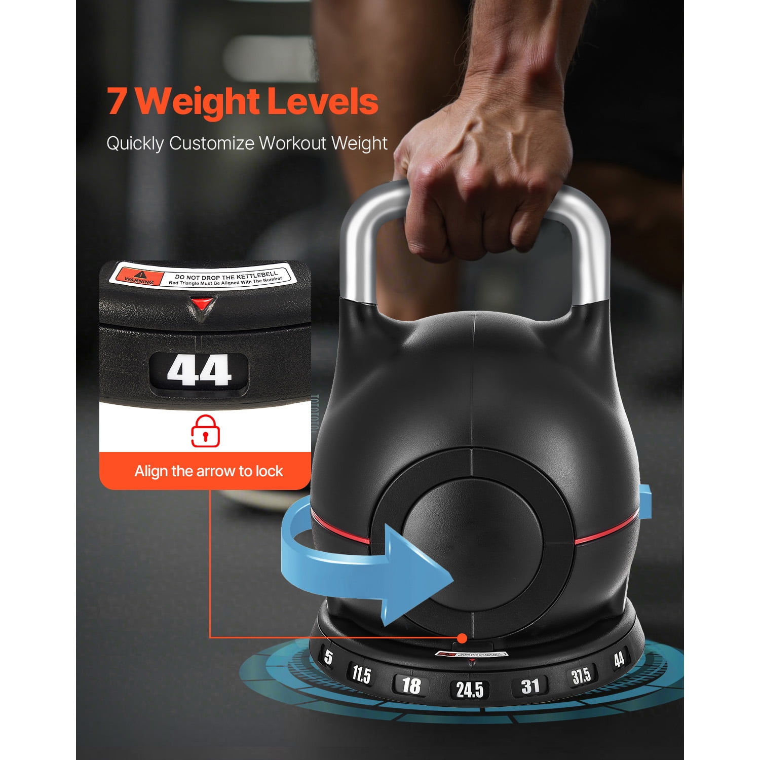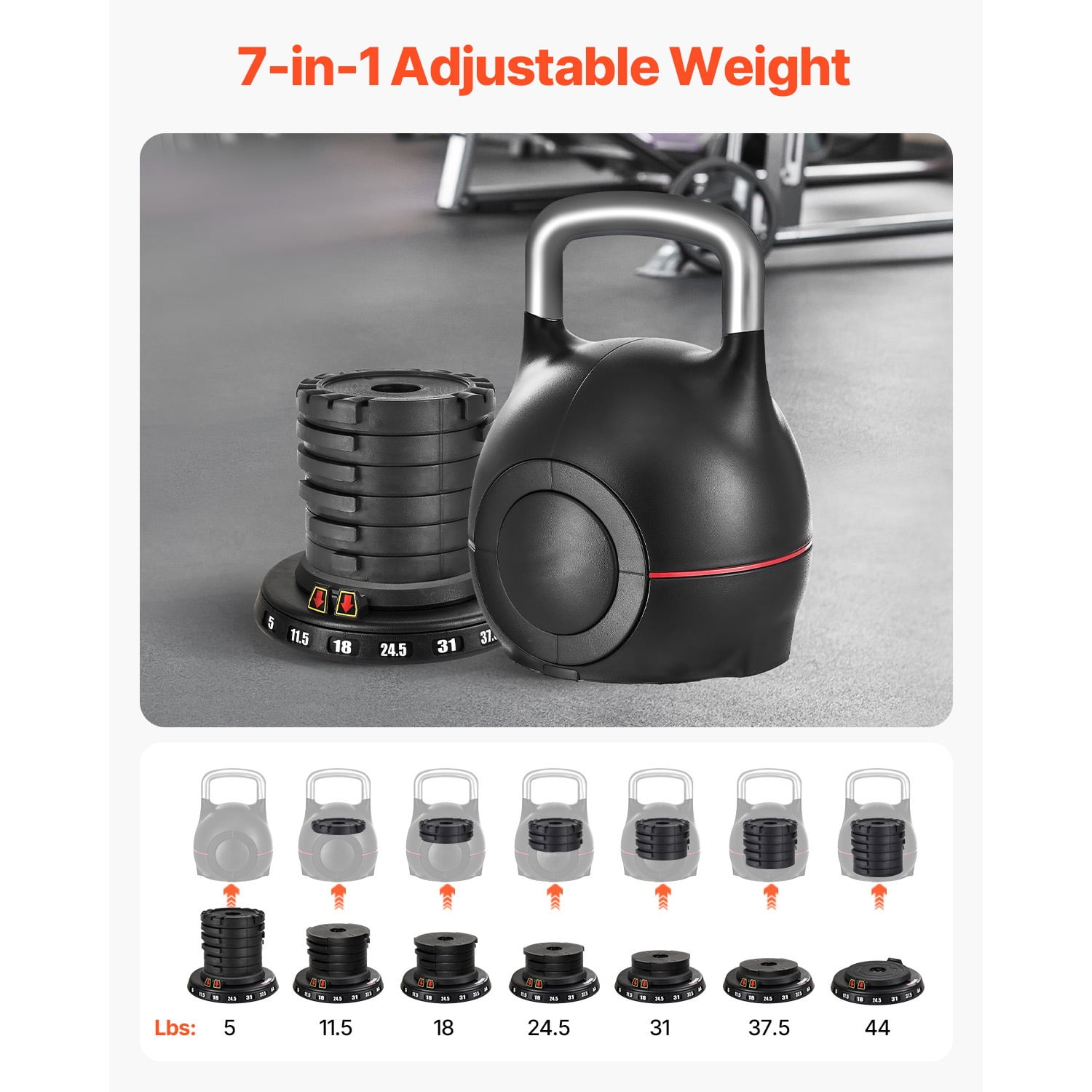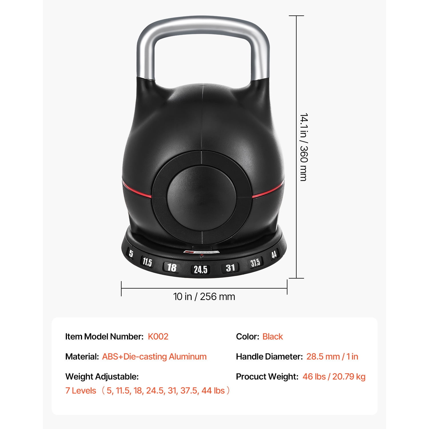 Product Description Multi-Functional Adjustable Weight Kettlebell This versatile kettlebell is perfect for comprehensive body workouts, helping to shape and tone muscles effectively. Constructed from robust materials, it features seven adjustable weight options and a compact design, making it suitable for a range of fitness objectives. Adaptable Exercise Options This versatile kettlebell is perfect for comprehensive strength workouts, focusing on your legs, core, and upper body to enhance body tone and definition. Long-lasting Construction Crafted from premium aluminum alloy and finished with electroplating, this kettlebell features a robust and long-lasting handle, perfect for supporting you in all your intense exercise sessions. Accurate Regulation This kettlebell offers seven different weight settings, enabling you to tailor your workouts for optimal precision and effectiveness. Compact and Efficient Layout This versatile kettlebell allows for easy weight adjustments, helping you save money and space while streamlining your workout routine. All-Inclusive Workout This kettlebell is designed to support your fitness journey, whether your goal is to shed fat, gain muscle, or enhance your strength and flexibility, providing a comprehensive workout solution. Versatile Usage This versatile 7-in-1 kettlebell is perfect for both gym sessions and home exercises, making it a valuable component of your regular fitness regimen. Specifications Item Model Number: K002 Material: ABS+Die-Casting Aluminum Color: Black Handle Diameter: 1 in / 28.5 mm Weight Adjustment: 7 Levels(5, 11.5, 18, 24.5, 31, 37.5, 44 lbs) Procuct Weight: 46 lbs / 20.79 kg Product Size: 10 x 10 x 14.1 in / 256 x 256 x 360 mm Package Content 1 x Kettlebell 1 x Base 1 x User Manual