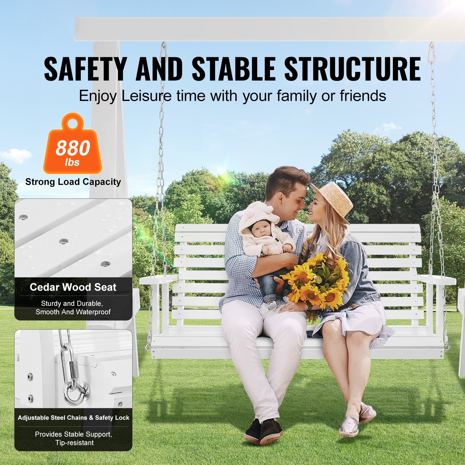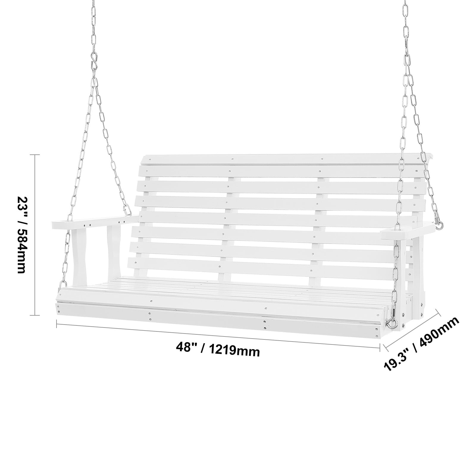 Sturdy & Stable: Made of pure fir wood and supported by galvanized steel chains, this porch swing ensures durability with a load-bearing capacity of 880 pounds Weatherproof Durability: Coated with three layers of PU paint, the swing surface is smooth, scratch-proof, and waterproof. Galvanized steel screws provide weather resistance, ensuring longevity without rust Comfortable Experience: Features an ergonomic design with a vertical backrest for knee comfort, adjustable chain length for a customized swing angle, and a safety lock system for added stability Easy Installation: Pre-drilled holes and included fasteners make installation straightforward, allowing setup in just 20 minutes with two people Classic Design: The timeless combination of hardwood and metal hooks adds vintage charm. Overall dimensions: 54 x 28 x 23.6 inches (1370 x 710 x 600 mm); seat size: 48 x 19.3 x 23 inches (1219 x 490 x 584 mm), comfortably seating 2-3 people