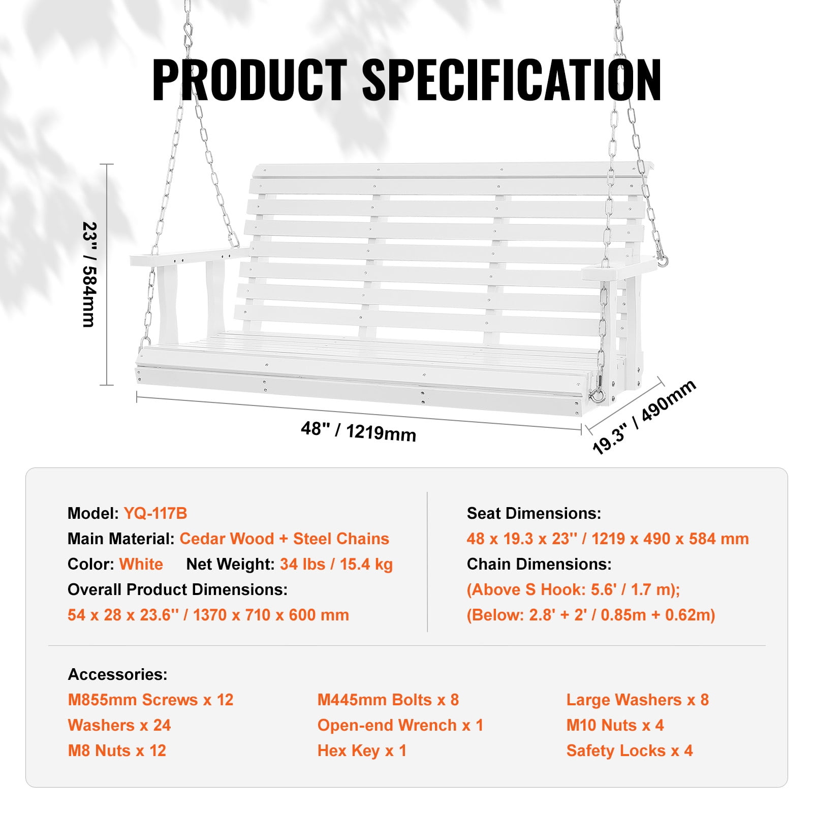 Product Description KFFKFF porch swing: Comfortable and relaxing Pure fir wood, coated with three layers of PU waterproof paint, our porch swing is supported by steel chains to ensure safety and stability. It easily holds a variety of items for quick installation in your yard, patio or patio. Come and start your adventure! Long-term quality Our porch swings have a sturdy design and sturdy weight to ensure stability and safety. Year-round supply With excellent water resistance and weather resistance, suitable for various occasions. Comfortable experience The user-friendly design provides a pleasant relaxing experience, perfect for talking with family. Easy to install Pre-drilling simplifies planning and makes installation easier. The use of precision materials Install a porch swing on your yard, patio or lawn and enjoy a variety of Spaces. Simple configuration Smooth waterproof wooden chair for easy cleaning and maintenance. Specifications Model: YQ-117B Main Material: Cedar Wood + Steel Chains Color: White Net Weight: 34 lbs / 15.4 kg Overall Product Dimensions: 54 x 28 x 23.6” / 1370 x 710 x 600 mm Seat Dimensions: 48 x 19.3 x 23” / 1219 x 490 x 584 mm Chain Dimensions: (Above S Hook: 5.6′ / 1.7 m); (Below: 2.8′ x 2 / 0.85 m x 2) Package Content Porch Swing x 1 M855mm Screws x 12 Washers x 24 M8 Nuts x 12 M445mm Bolts x 8 Open-end Wrench x 1 Hex Key x 1 Large Washers x 8 M10 Nuts x 4 Safety Locks x 4