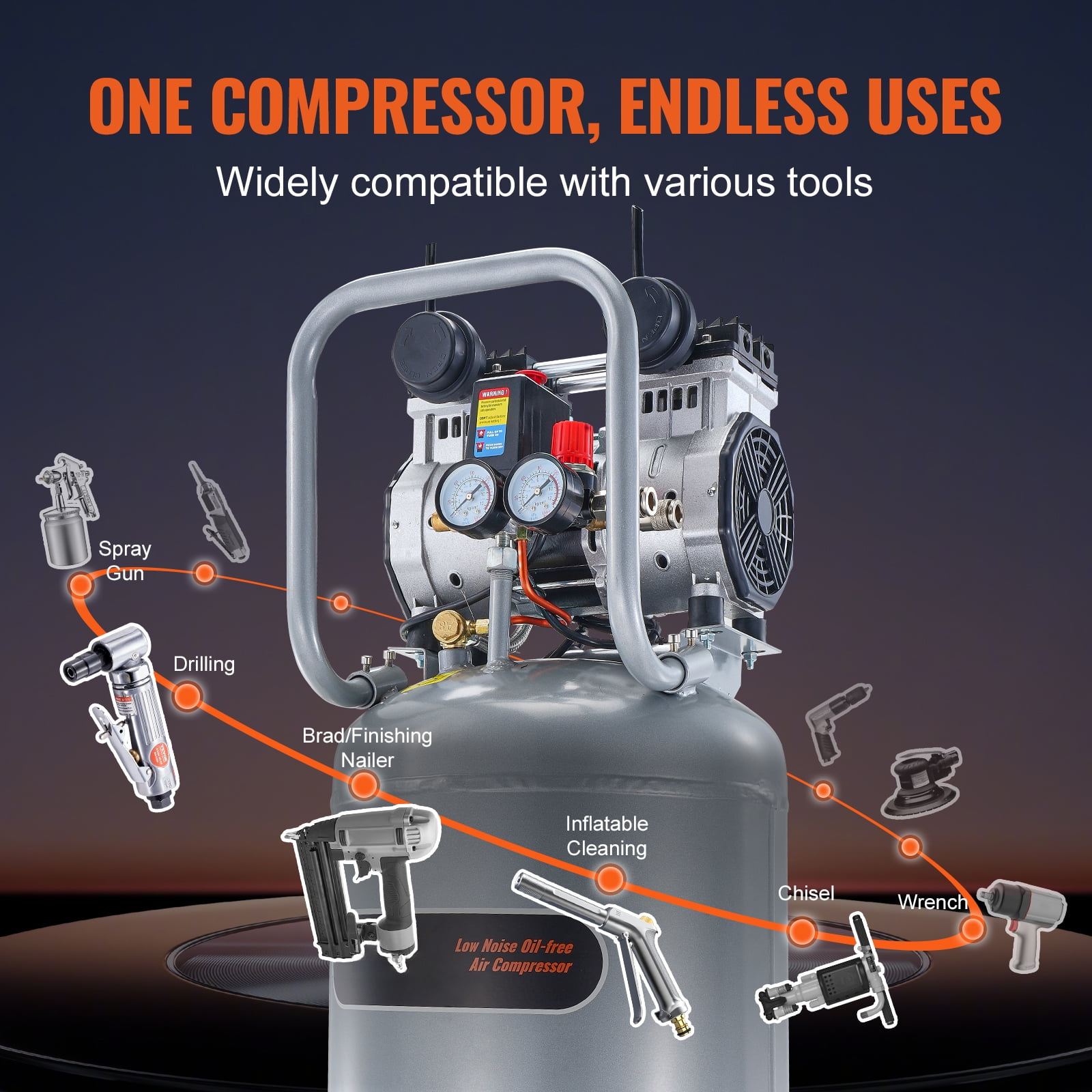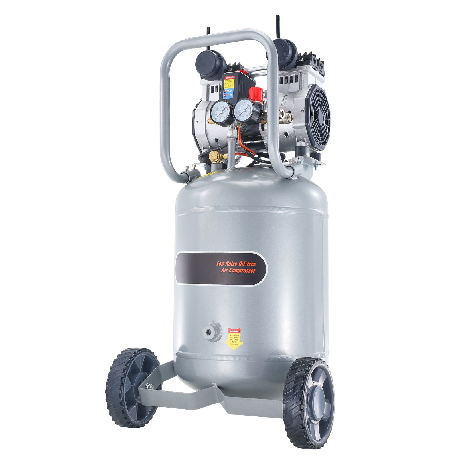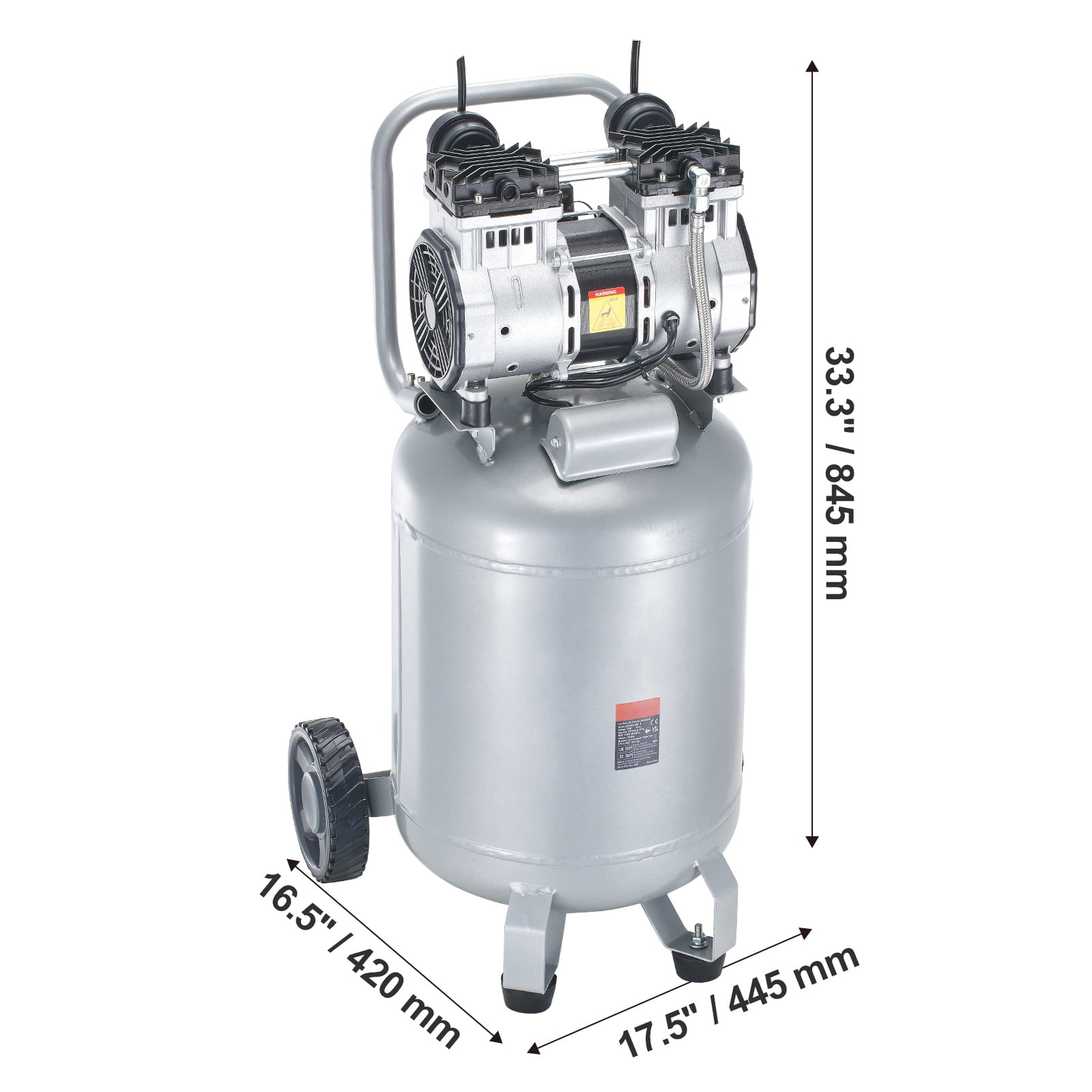 Product Description 13 Gallon Air Compressor Discover the ultimate efficiency with 13-Gallon air compressor. With 2HP powerful motor, 4.6 SCFM@90 PSI air delivery, and versatile applications, it delivers robust and efficient air compression, completing various tasks quickly, perfect for tire inflation, auto repair, and woodwork nailing. Efficient and Quiet Operation Experience the silence of efficiency with our oil-free air compressor. Its electric motor smoothly compresses air at a peaceful 66dB, providing necessary power with minimal noise and less maintenance. Mobile and Space-Saving Move with ease, save space with grace. Our electric air compressor comes with 7-inch rubber wheels for smooth mobility and a compact design that fits snugly even in tight spaces. Leak-Proof and Reliable Trust in our advanced leak-proof design. With top-notch sealing and an updated pipeline valve body, our air compressor offers secure and dependable gas storage. Home and Commercial Versatility A tool for every task. Ideal for a variety of applications like painting, automotive cleaning, and more, our compressor suits both home and commercial needs, compatible with a 120V/60Hz power supply. Low Maintenance, High Performance Say goodbye to frequent upkeep. Our electric air compressor requires minimal maintenance, ensuring uninterrupted high performance for all your compressed air needs. Safety Enhanced Work with confidence. The enhanced leak prevention and robust construction of our air compressor ensure a safe, reliable operation every time. Specifications Item Model Number: DOF1500-50V-Ⅰ Rated Voltage/Frequency: Single Phase 120V/60Hz Horsepower: 2HP Tank Capacity: 13 Gallon Noise Level: ≤66dB Maximum Working Pressure: 125 PSI Pressure Bearing Performance: 8.8 bar Cold State Air Flow: 4.6 SCFM @ 90 PSI Net Weight: 67.2 lbs / 30.5 kg Product Dimensions: 17.5” x 16.5” x 33.3” / 445 × 420 x 845 mm Package Content 2 x 1/4 Plastic Shell Air Filters 2 x 7-Inch Rubber Wheels 2 x Foot Pads 2 x Rubber Wheel Mounting Screws Kit 2 x Foot Pad Mounting Screws Kit 2 x Pressure Gauges 1 x Instruction Manual