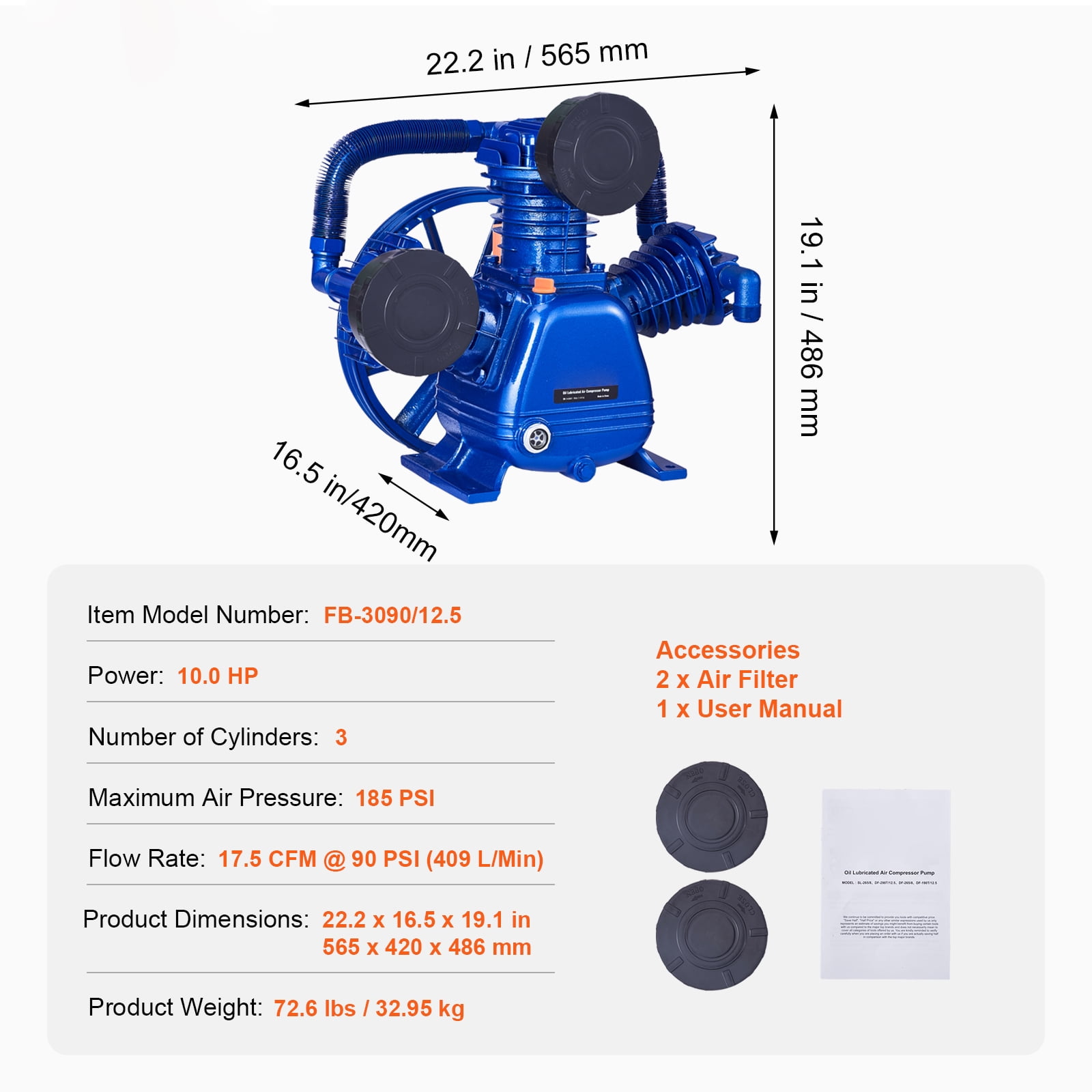 Product Description KFFKFF Air Compressor Pump Head Upgrade your pneumatic requirements with the KFFKFF 10HP 3-cylinder air compressor pump head. Experience a remarkable airflow of 17.5 CFM @ 90 PSI, a maximum working pressure of 185 PSI, and a dual-stage compression system. This pump head ensures a consistent and ample air supply for various applications. Efficient Belt-Driven Design Experience enhanced compression and smooth operation with our oil-lubricated piston pump head featuring a belt-driven design. Optimal Performance With a 3HP twin-cylinder air compressor pump head, enjoy a 5.8 CFM @ 90 PSI air delivery rate and a maximum working pressure of 116PSI, ensuring a continuous and sufficient air supply. Durable Construction Our compressor pump head boasts a seamless welding structure, providing excellent wear resistance and damage tolerance for long-term use. Convenient Oil Monitoring Monitor oil levels effortlessly with the equipped oil observation window, ensuring proper maintenance and performance. Easy Installation Ensure proper installation by aligning the motor pulley and belt pulley in a straight line, preventing any bearing displacement. Versatile Applications Experience reliable air supply for various needs in auto repair, woodworking shops, home garages, renovation projects, and more, boosting overall work efficiency. Specifications Item Model Number: FB-3090/12.5 Power: 10.0 HP Number of Cylinders: 3 Maximum Air Pressure: 185 PSI Flow Rate: 17.5 CFM @ 90 PSI (409 L/Min) Product Dimensions: 22.2 x 16.5 x 19.1 in / 565 x 420 x 486 mm Product Weight: 72.6 lbs / 32.95 kg Package Content 1 x User Manual