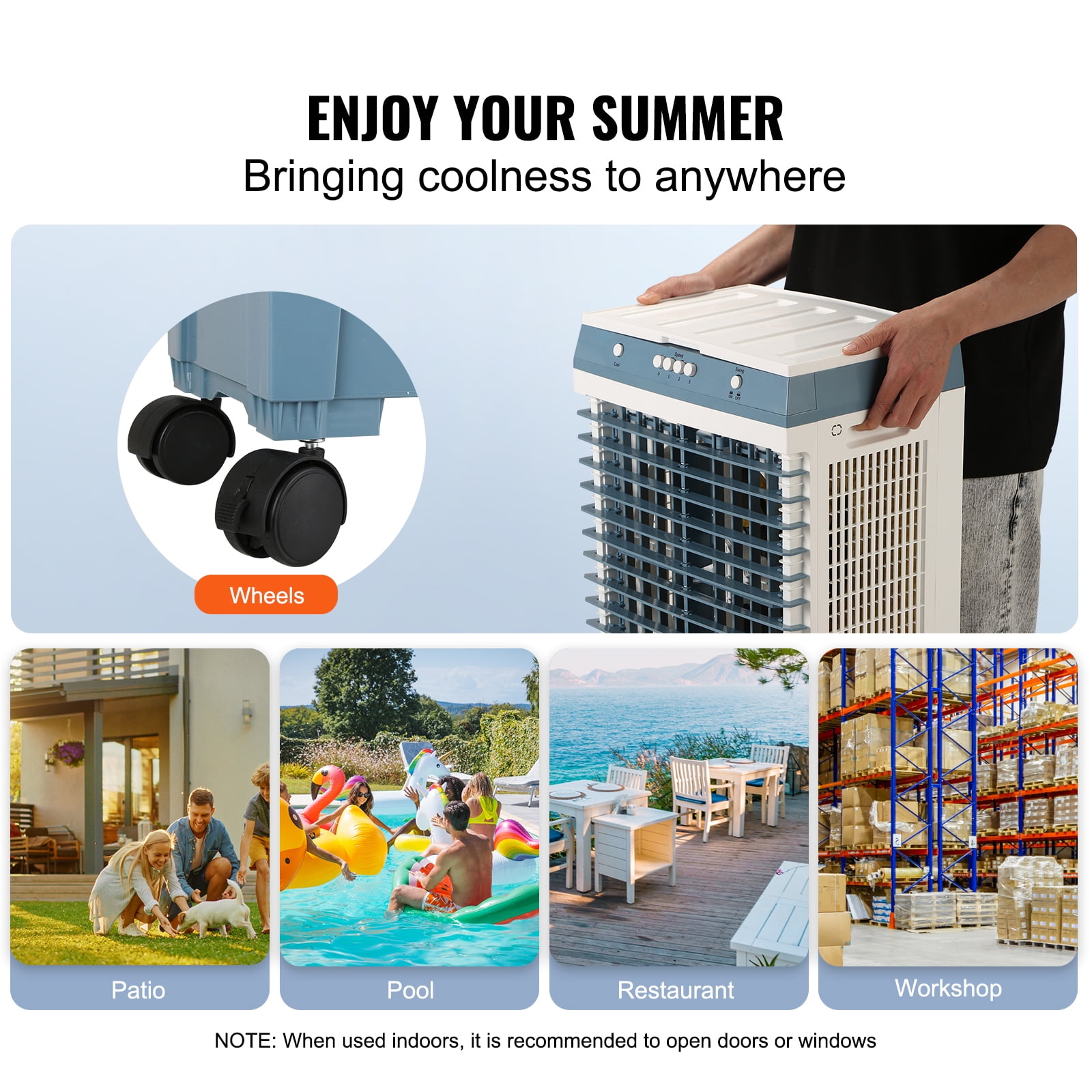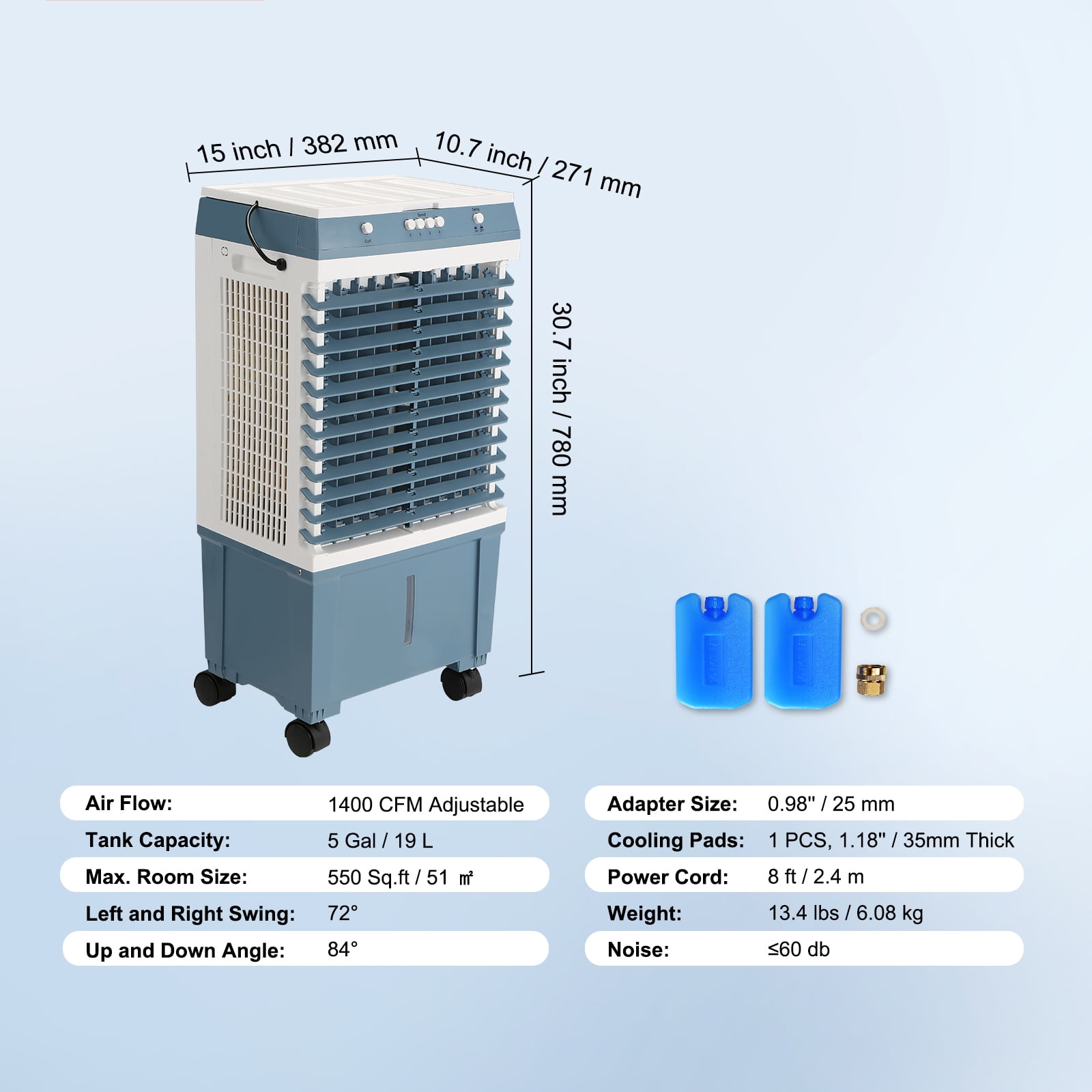 KFFKFF 3-in-1 Multi-function Cooler: Keep your home comfortable during hot weather with our versatile swamp cooler. It can blow, humidify, and cool the air. Move it around your outdoor patio effortlessly with its wheels and side handles. Oscillation & Adjustable Airflow: Experience maximum comfort with our portable swamp cooler. It covers a room of about 550 sq. ft. and offers adjustable airflow of up to 1400 CFM. The louvers can be manually adjusted for vertical angle, and it can also swing horizontally from 0° to 72°, ensuring a cool breeze from any corner of the room. Stays Cool: Enhance the cooling effect with the 2 included ice packs. Our evaporative air cooler features 1-sided rigid high-density cooling pads that increase the evaporative surface area, resulting in more cool air. Hassle-free to Use: Enjoy easy operation with mechanical buttons. The buttons won’t blur even with extended use, and you won’t forget the selected mode. The top cover can be easily opened for direct water addition, without any location restrictions. Manual and Continuous Fill: Our portable air cooler comes with a water shortage protection function. It has a large 5 gal tank that can be connected to a garden hose for uninterrupted cooling. Additionally, there is an option to refill water from the top, providing convenience for the elderly and pregnant women.
