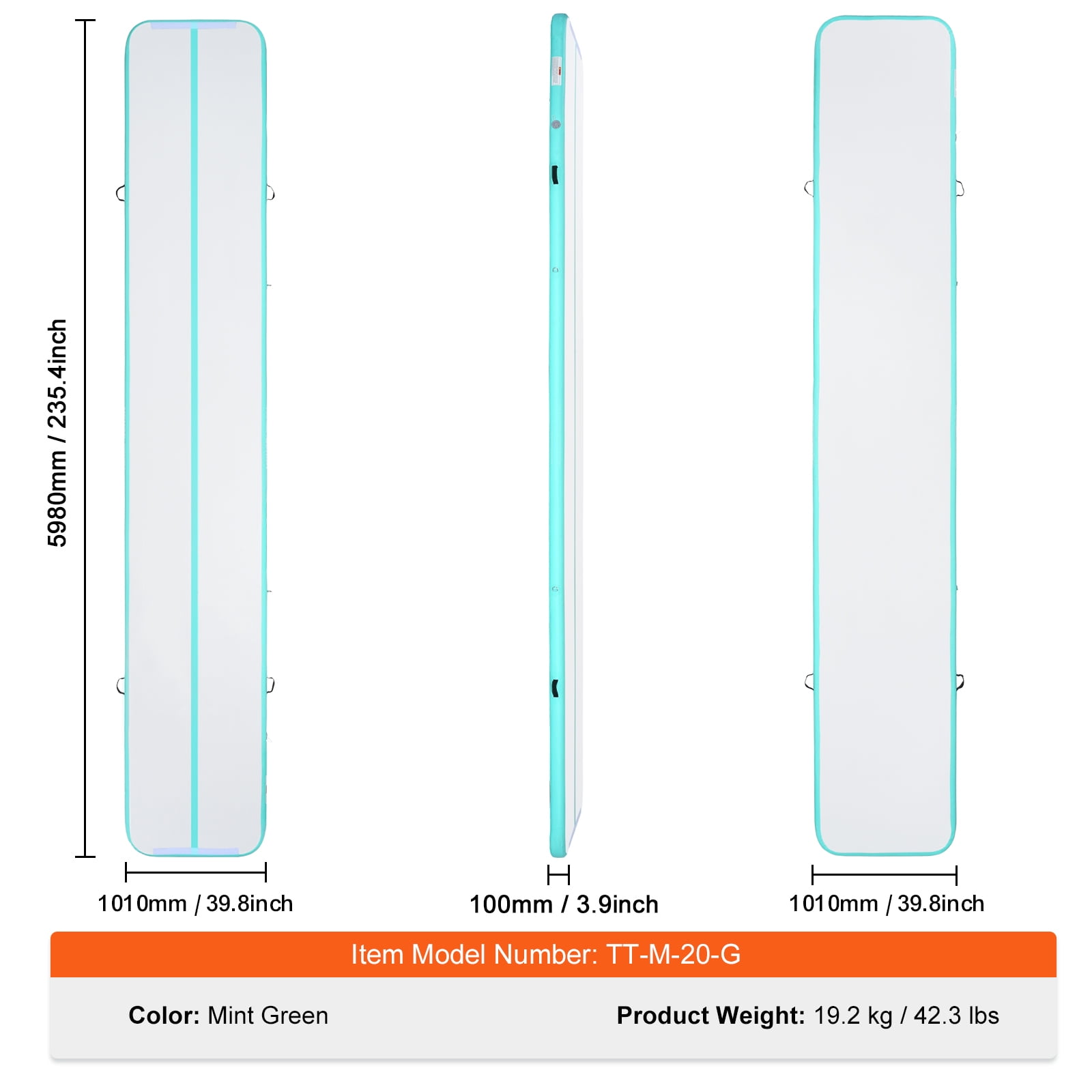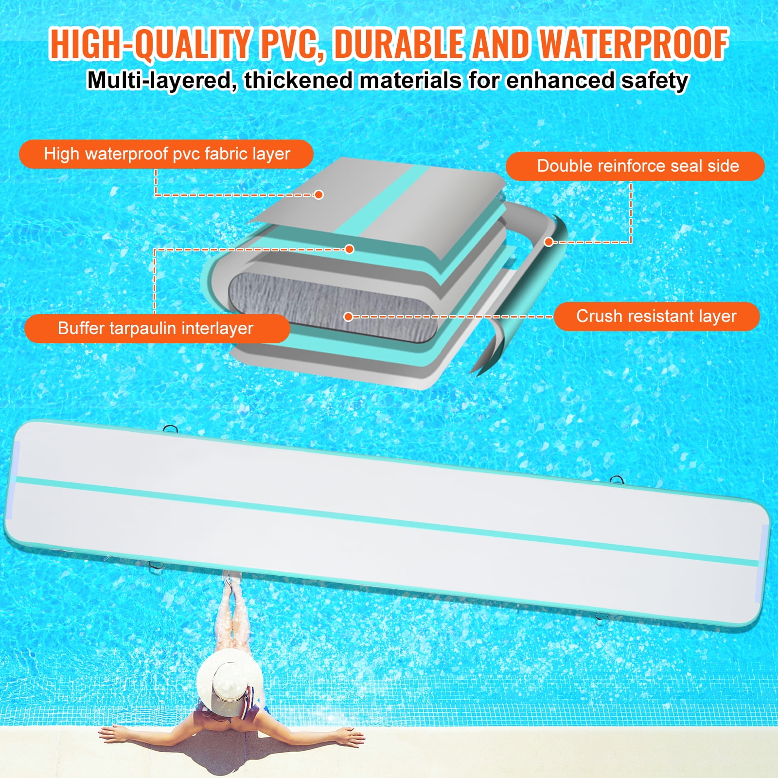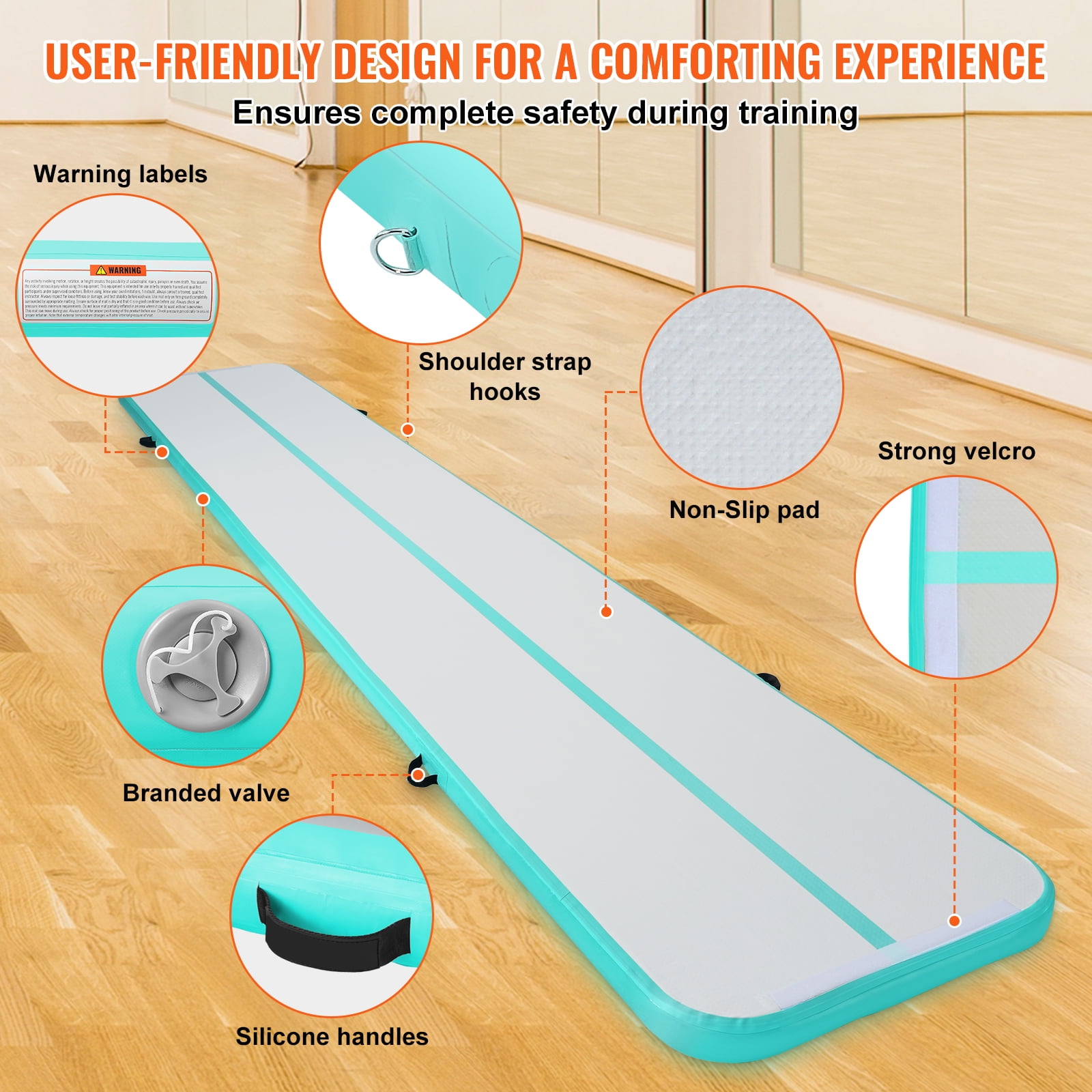 High-Quality Material:This inflatable gymnastics mat is made of multi-layer composite PVC material with reinforced seams for increased breathability and durability. The anti-slip material gives the inflatable gymnastics mat better traction and grip, making it wear-resistant, waterproof, soft and highly elastic, ensuring safe use during training. No noise during use. Easy Inflation and Deflation: This training mat comes with a 600W electric air pump, 3 nozzles and a hose. Maximum pressure reaches 3.2 PSI. It only takes 1 minute to inflate or deflate, and the pad can maintain pressure for days without removal, simplifying use. Thoughtful Design & Abundant Accessories:The gymnastics track has just been updated, using branded valves to effectively prevent air leakage and maintain shape under pressure. Comes with a thoughtful repair kit that includes a convenient wrench, round patching materials, and other patching materials, as well as square and round patching materials, allowing spot repairs on different carpets for comprehensive, worry-free maintenance. Variety of Sizes and Colors: Air rolling mats are available in 10′, 13′, 16′ and 20′ lengths to meet your specific needs. Available in a variety of colors to add pizzazz to your training and lifestyle. The mat is versatile and suitable for tumbling, gymnastics, yoga, art activities and can also be used at the beach, pool, patio or lawn – just avoid sharp objects. Easy to Move: The inflatable air mattress has an ergonomically designed silicone handle with logo, comfortable to hold and easy to move. Adding a shoulder strap makes it easy for one person to carry it without dragging it and saving effort. Equipped with a zipper storage bag that is slightly larger than the fitness mat to avoid storage difficulties and make storage and transportation easier and more economical. This carpet can be easily installed in the living room, patio, gym, school, etc.