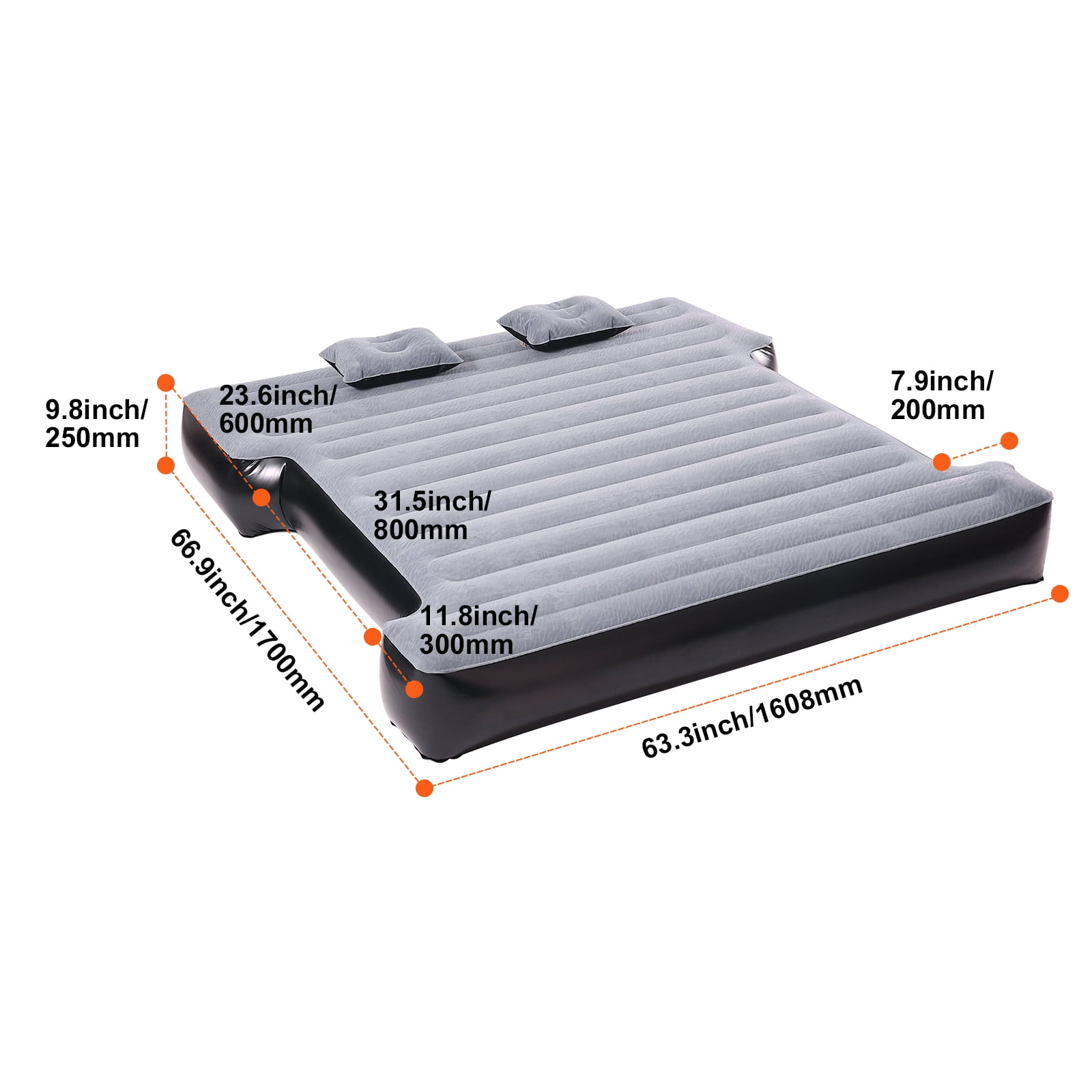 Product Description 5.5-5.8 ft Truck Bed Air Mattress The KFFKFF 5.5-5.8ft truck air mattress offers a spacious sleeping area measuring 66.93 x 63.31 x 9.84 inches. Crafted from top-notch materials, this mattress ensures exceptional durability and comfort. With its effortless inflation and deflation process, you can quickly set up or pack away the mattress. Supporting a weight capacity of up to 600 lbs, it comfortably accommodates 2-3 individuals. Whether you’re camping indoors or outdoors, this versatile mattress is an ideal choice. Premium Material for Ultimate Comfort Crafted from high-quality materials, this 5.5-5.8ft truck bed air mattress offers a waterproof and luxuriously comfortable surface. Its exceptional puncture resistance not only enhances comfort but also ensures long-lasting durability. Experience the utmost comfort and enjoy memorable outdoor adventures with your family. Effortless Inflation with 12V Air Pump Equipped with a convenient 12V DC air pump, this inflatable truck air mattress allows for quick and hassle-free inflation and deflation. The air valve’s innovative triple leak-proof design guarantees a tight seal, minimizing air leaks. This remarkable feature enables swift setup, saving you valuable time and energy. Unmatched Load Capacity With an impressive load-bearing capacity of up to 600 lbs, this truck bed camping mattress offers exceptional stability and prevents any sinking or discomfort even under heavy weight. Rest assured, its high load-bearing capacity ensures a safe and stable sleeping environment, providing you with peace of mind. Enhanced Safety and Convenience For added comfort, this mattress includes two air pillows that provide excellent head support. Additionally, it features a thoughtful head collision avoidance design, prioritizing your safety. The unique pattern design on the air mattress and pillows enhances your sleeping experience, making it truly exceptional. Furthermore, its portable and foldable design simplifies storage and transportation, making it a perfect companion for your outdoor adventures. Versatility for All Your Needs Designed to cater to a wide range of activities such as self-driving travel, outdoor camping, and picnics, this truck bed air mattress is compatible with popular truck models like Silverado, RAM, F Series, Sierra, Titan, and Tundra. It effortlessly meets diverse needs, ensuring unparalleled ease and comfort throughout your journeys. Optimal Comfort with Unique Body Support Experience optimal comfort with the truck bed mattress and pillows’ unique pattern, specifically designed to support your body contours and fit your body curves perfectly. This innovative design promotes proper spinal alignment and effectively relieves pressure points, allowing you to enjoy a truly restful and rejuvenating sleep experience. Specifications Item Model Number: PK001SS Applicable Truck Bed Length: 5.5-5.8ft Material: Pattern Embossed Flocking PVC (Top), PVC (Side), Polyester Taffeta PVC (Bottom) Pump Voltage: DC12V Pump Power: 70W Pump Wire Length: 196.9″ / 5 m Maximum Load Capacity: 600 lbs / 272.16 kg Net Weight: 14.3 lbs / 6.5 kg Product Dimensions: 66.93 x 63.31 x 9.84 inch / 1700 x 1608 x 250 mm Package Content 1 x Truck Bed Air Mattress 1 x Air Pump + 196.9 in/5 m Wire 2 x Patches 1 x Non-woven Bag 1 x 3-in-1 Inflator Nozzle 2 x Inflatable Pillows