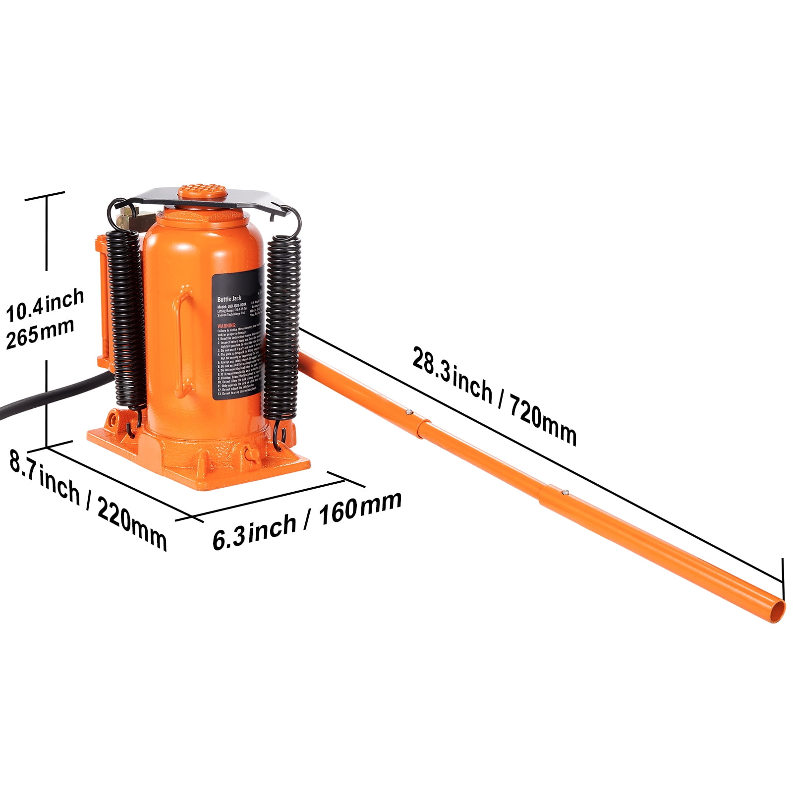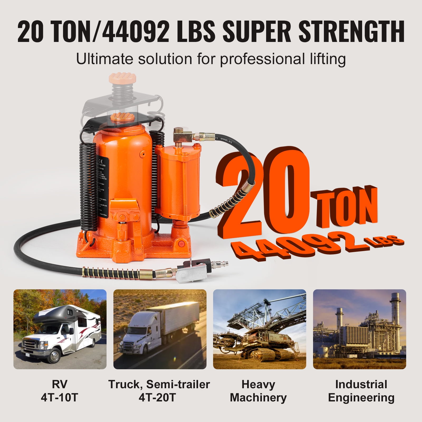 KFFKFF Air/Hydraulic Bottle Jack: This professional-grade bottle jack has a lifting capacity of 20 tons/44,092 lbs, providing efficient assistance for a wide range of lifting tasks. It effortlessly handles heavy loads with ease, making it ideal for heavy machinery, engineering construction, and large trucks. Versatile and Adjustable: This jack offers versatility with a minimum height of 10.4″ (265 mm) and a maximum height of 19.7″ (500 mm). The extendable screw allows for precise adjustments up to 2.4″ (60 mm). Its built-in handle design ensures easy transportation and storage. Quick and Effortless Operation: Connect the air compressor for pneumatic lifting and control with a simple press of the pneumatic switch. The air hydraulic bottle jack takes the effort out of lifting heavy objects. Its double-heavy spring allows for swift and stable lowering and resetting, greatly improving work efficiency. Leakage-Proof Construction: This bottle jack is built with a robust welding structure and tightly sealed with high-quality rings, guaranteeing exceptional strength and preventing any oil leakage. It comes packaged with upgraded and thickened pearl cotton for added protection during transportation. Reliable and Secure: The hydraulic bottle jack features a built-in safety valve system to prevent overloading and minimize the risk of accidents. The integrated molding of the hydraulic cylinder and piston rod, along with the outer rust and corrosion-resistant coating, ensures long-term reliability and durability.