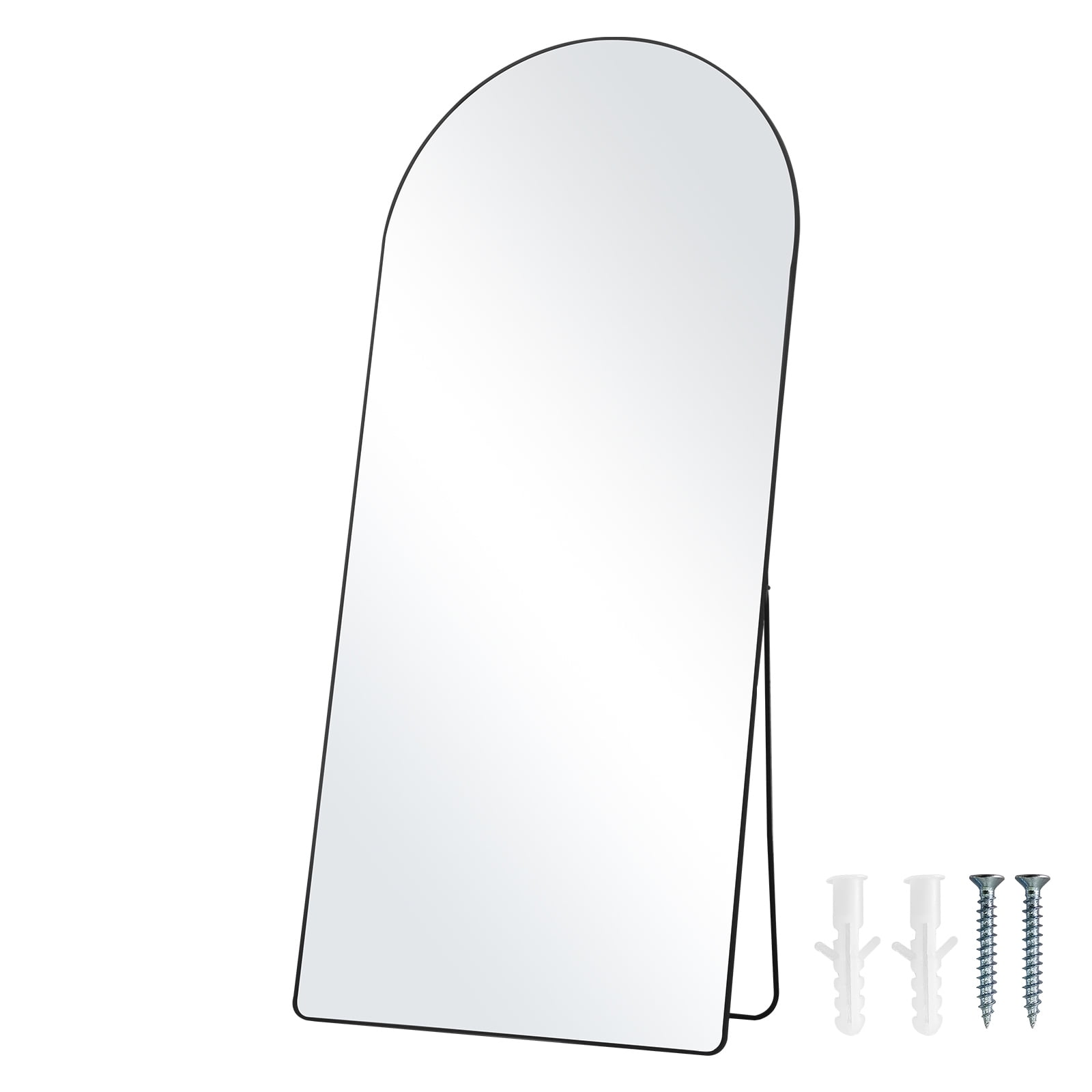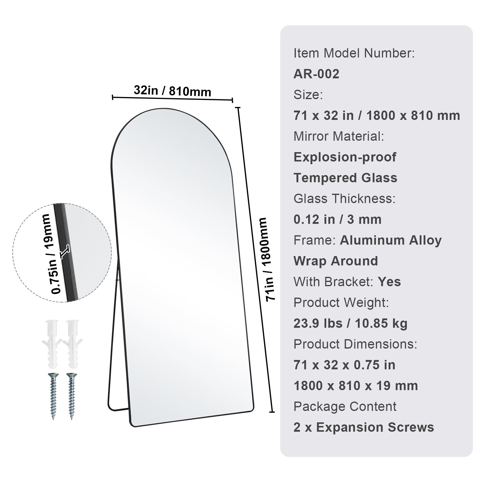 Product Description 71 x 32 in Arched Full-Length Mirror with Stand Our modern design arched floor mirror is crafted with high-quality explosion-proof glass for your peace of mind. Equipped with multiple installation options, allowing you to place it in any desired location. Whether minimalist chic or a trendy d??cor, it seamlessly complements your home aesthetic. Explosion-Proof Floor Mirror Crafted with explosion-proof tempered glass, our arched full length mirror boasts exceptional impact and bend resistance, ensuring its durability and security. Even in the event of an accident, our mirror won’t shatter into dangerous shards. Clear & Spacious Reflections Experience crystal-clear imaging with our full-scale design, meticulously crafted with high-definition glass, to ensure impeccable reflection. Whether it’s for a flawless selfie or an effortless makeup application, our arched floor mirror’s clarity perfectly captures and enhances your beauty. Durable High-Quality Design Our arched full length mirror is built to last, featuring a sturdy aluminum alloy frame wrapping around all four sides for enhanced protection against impacts while maintaining an aesthetically pleasing appearance. It ensures both functionality and longevity. Versatile Installation Options Our oversized arched floor mirror offers multiple installation methods, providing you with the flexibility to tilt it against the wall, hang it using the hooks on the back, or utilize the stand to place it anywhere you desire. Wide Application Our oversized arched mirror boasts a stylish and elegant design, seamlessly blending into a variety of spaces with ease. Whether it’s in your walk-in closet, bedroom, or living room, it effortlessly enhances the ambiance, creating an elegant and sophisticated atmosphere. Stylish Design The sleek and graceful curved lines surrounding the oversized full length mirror add a touch of modern elegance to your living space, elevating it to new heights of sophistication. More than just practical, it serves as a true work of art, enhancing the aesthetic appeal of any room it graces. Specifications Item Model Number: AR-002 Size: 71 x 32 in / 1800 x 810 mm Mirror Material: Explosion-proof Tempered Glass Thickness: 0.12 in / 3 mm Frame: Aluminum Alloy Wrap Around With Bracket: Yes Product Weight: 23.9 lbs / 10.85 kg Product Dimensions: 70.87 x 31.89 x 0.75 in / 1800 x 810 x 19 mm Package Content 2 x Expansion Screws