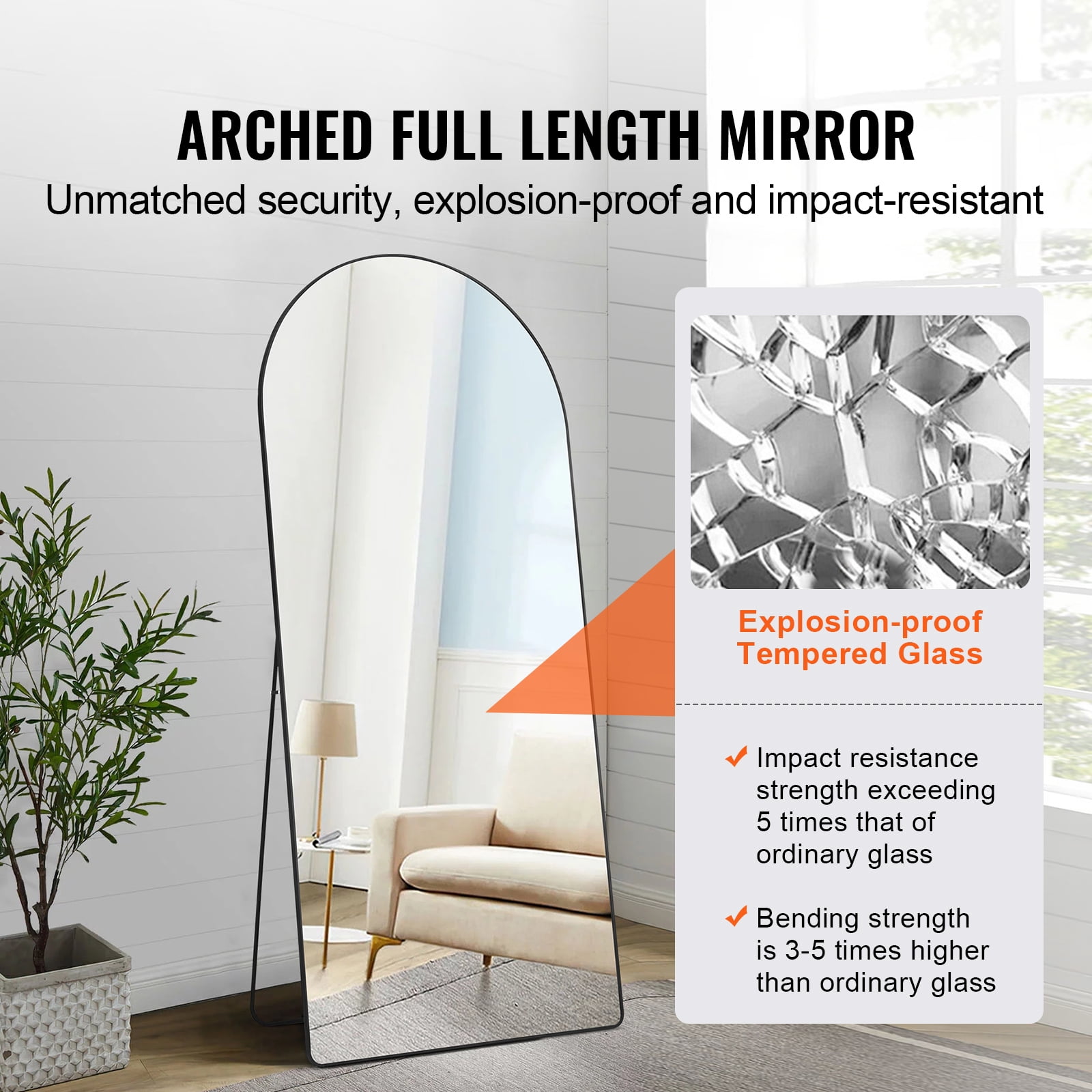 Explosion-Proof Tempered Glass: Our arched full length mirror is made of explosion-proof tempered glass, boasting an impact resistance strength exceeding 5 times that of ordinary glass, and a bending strength 3-5 times higher. Even in the event of accidental impact, the mirror won’t shatter into dangerous shards, significantly enhancing safety during use. Crystal Clear Reflection: Our arched floor mirror is crafted with high-definition glass, ensuring a crystal-clear and pure reflection. Free from distortions, color shifts, or double images, it makes every selfie or makeup session effortless and enjoyable. With each reflection flawless and immaculate, perfection is always within reach. Durable and Sturdy: Our oversized arched floor mirror is encased with aluminum alloy framing all around, providing not only robust durability but also solid protection for the mirror itself, enhancing its overall sturdiness. It also adds to the aesthetic appeal, making the mirror not just practical but also a piece of home decor art. Flexible Installation: Our oversized arched mirror comes with a stand, allowing it to stand independently in any location. When the stand is closed, it can also be tilted against the wall. Additionally, there are hooks on the mirror back, enabling vertical installation on the wall. Our full-length mirror is suitable for various scenarios, catering to your diverse needs. Multi-Scenario Application: The oversized full length mirror is not only perfect for creating elegant spaces in walk-in closets, bedrooms, and living rooms, but it’s also suitable for offices, hotels, gyms, and more. Its adaptability ensures it seamlessly enhances various environments, catering to a wide range of needs.