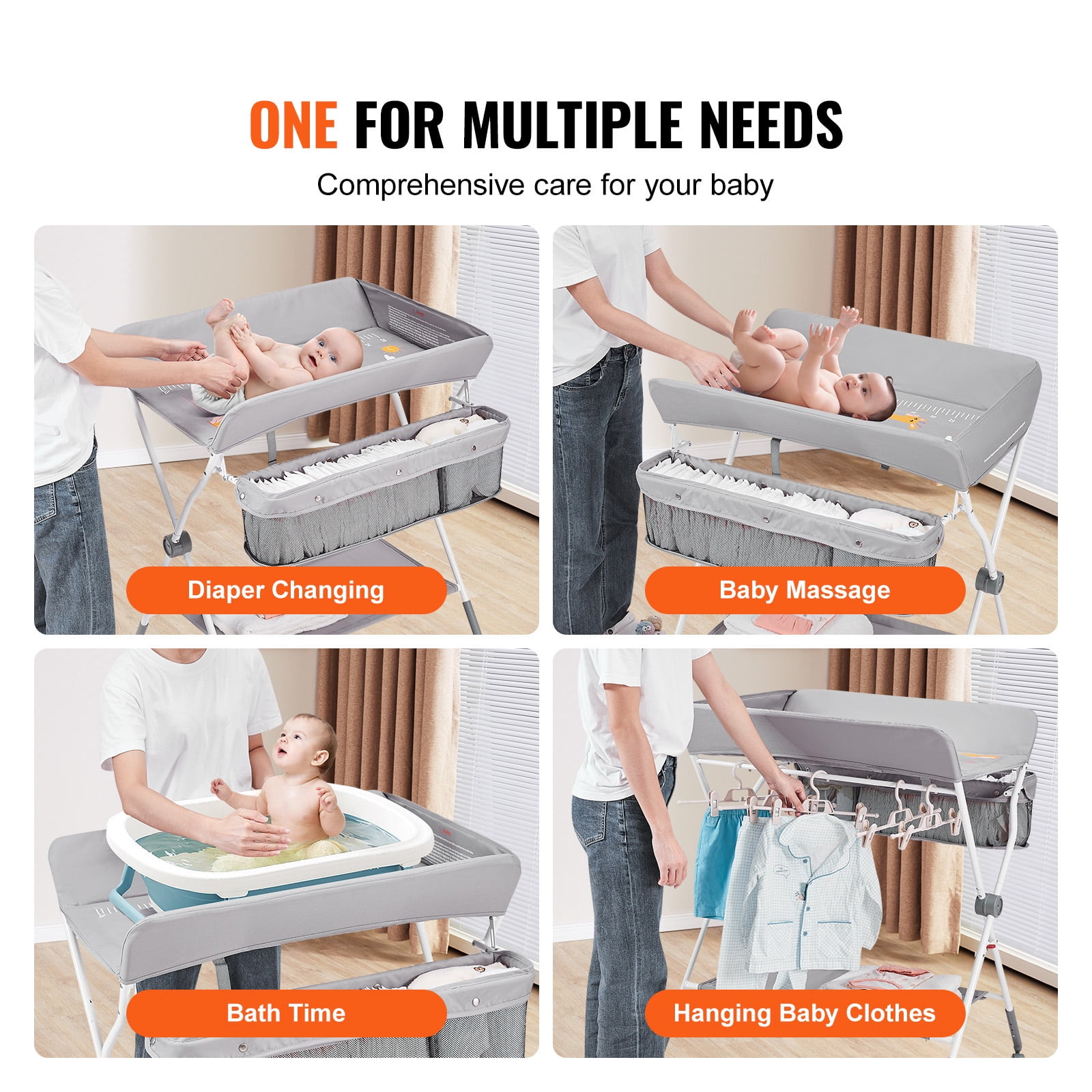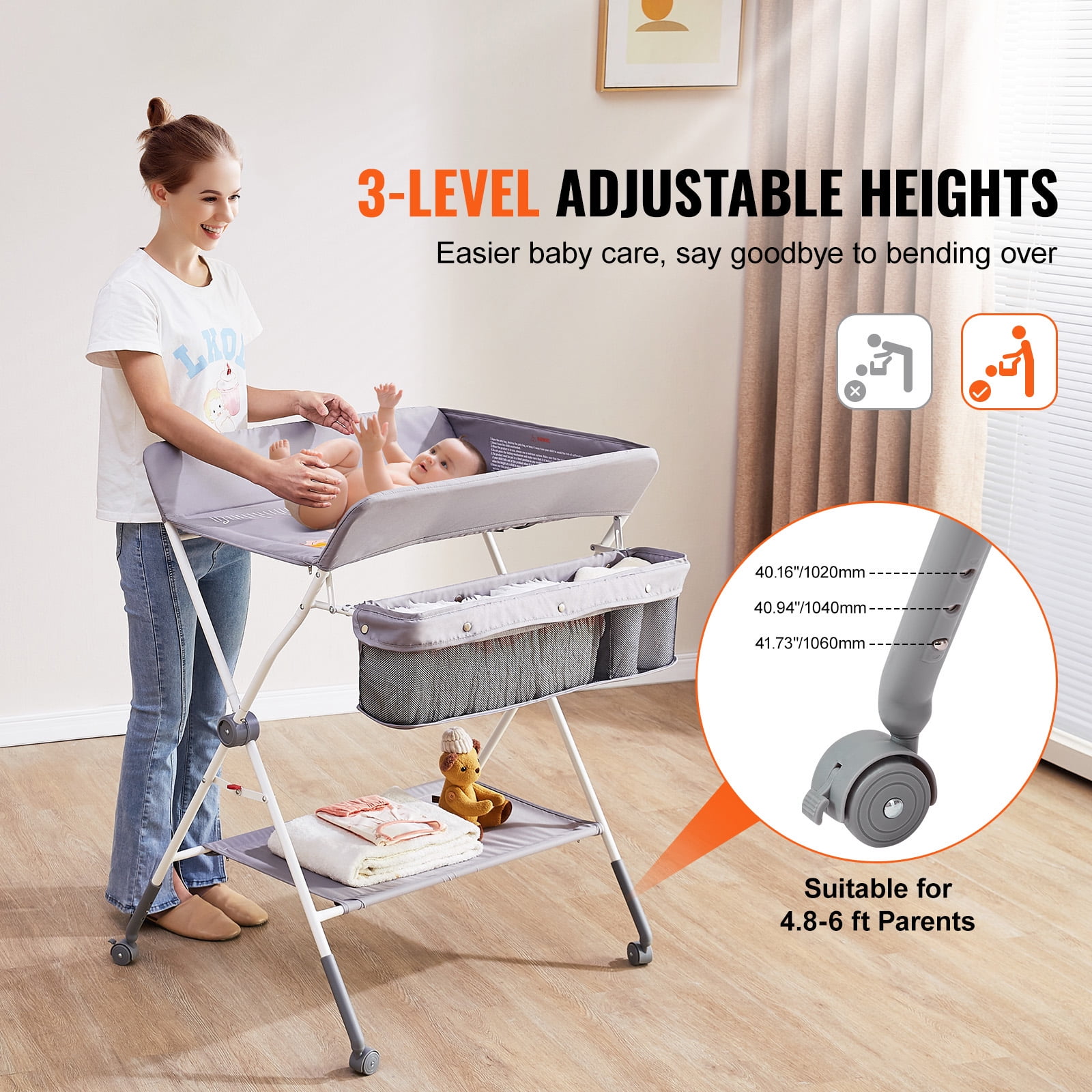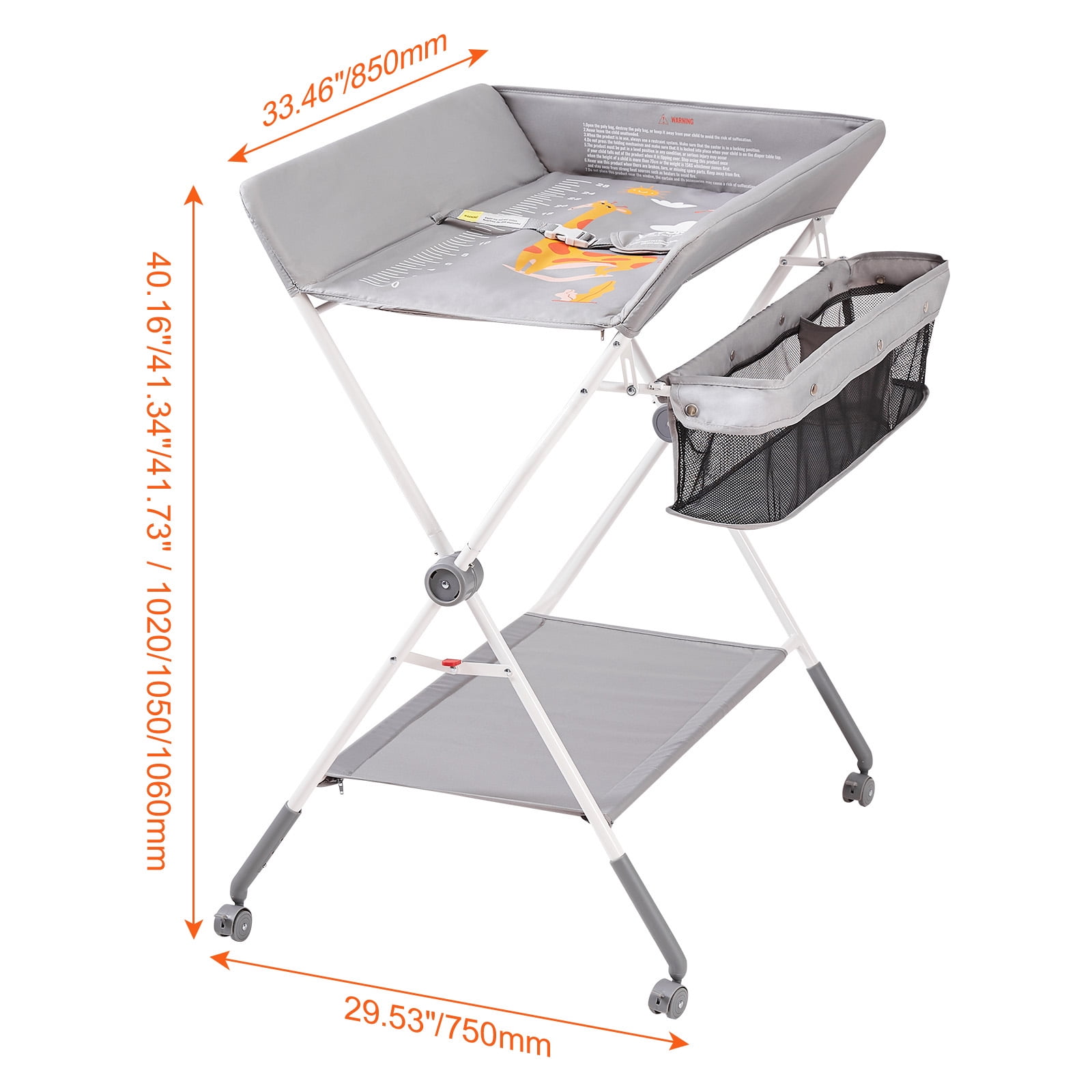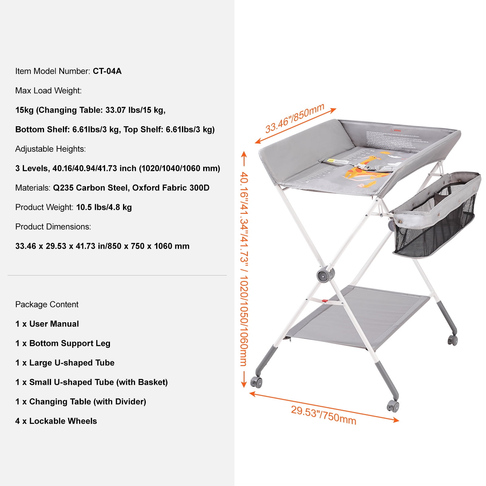 Product Description Folding and Portable Changing Table The quick-folding design and four lockable silent wheels make it easy to store and transport. Be your reliable assistant at home or traveling.Our changing table features a 3-level adjustable height to fit parents of different heights, providing comfortable baby care and reducing back fatigue. 3-Level Adjustable Height This not only effectively prevents back pain and uncomfortable bending positions but also makes diaper changing more relaxed and comfortable.Designed with three adjustable heights, the changing table accommodates parents of different heights, eliminating the need to bend over or kneel. Portable Folding Design Whether for use at home or during travel, it provides comprehensive protection for your baby. Use it with peace of mind!The baby changing table is equipped with a quick-folding design and four lockable silent swivel wheels, allowing you to quickly store and transport. Ample Storage Space This convenience ensures quick access without searching for items all around.Whether it’s diapers, wet wipes, powder, or other items, we’ve considered ample storage space for you. Quality Ensured Be a great helper for baby care!With CPC certification and featuring a waterproof Oxford fabric panel, our portable changing table is not only more wear-resistant but also easy to clean. Multi-Functional Design It also accommodates various other needs such as massage, breastfeeding, and more, providing you with a comprehensive parenting solution.Our foldable changing table is not limited to changing diapers and clothes. 360? Safety Protection The folding changing table creates a 360? safety table that effectively protects the baby, with raised edges on all sides of the table. Specifications Item Model Number: CT-04A Max Load Weight: 15kg (Changing Table: 33.07 lbs/15 kg, Bottom Shelf: 6.61lbs/3 kg, Top Shelf: 6.61lbs/3 kg) Adjustable Heights: 3 Levels, 40.16/40.94/41.73 inch (1020/1040/1060 mm) Materials: Q235 Carbon Steel, Oxford Fabric 300D Product Weight: 10.5 lbs/4.8 kg Product Dimensions: 33.46 x 29.53 x 41.34 in/850 x 750 x 1050 mm Package Content 1 x Baby Changing Table 1 x User Manual 1 x Bottom Support Leg 1 x Large U-shaped Tube 1 x Small U-shaped Tube (with Basket) 1 x Changing Table (with Divider) 4 x Lockable Wheels