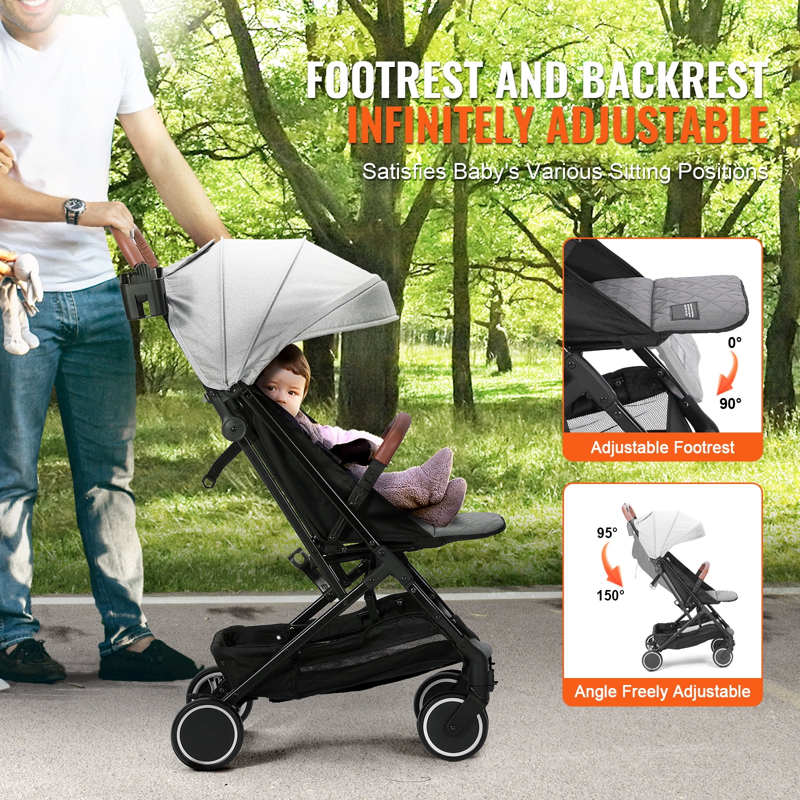 Adjustable Seating Positions: Easily adjust the seat back from 95° to 150°, providing optimal comfort for your baby. The footrest angle can also be adjusted to 0° or 90°. Convenient One-Hand Folding: With just one pull, this stroller folds and stores effortlessly. Its compact dimensions of 18.3 x 22.2 x 9.2 inches make it perfect for Disneyland, airplane luggage compartments, and car trunks. Smooth and Stable Ride: Equipped with 5-inch EVA solid front and rear wheels, this stroller offers excellent suspension and stability. The toggle lock swivel wheels and step-on brake ensure safety and prevent slipping. The built-in spring suspension and 5-point safety harness provide a smooth and secure pushing experience, even on bumpy roads. Versatile and Long-Lasting: Suitable for babies from 0 to 3 years old, this stroller has a maximum weight capacity of 33 lbs. Its patented carbon steel frame guarantees durability, sturdiness, and easy maintenance. No need to replace it as your baby grows. Perfect for On-the-Go Families: Weighing only 14.6 lbs, this lightweight stroller is designed for families on the move. It features a convenient cup holder for easy portability and offers maximum storage capability with ample space under the seat.