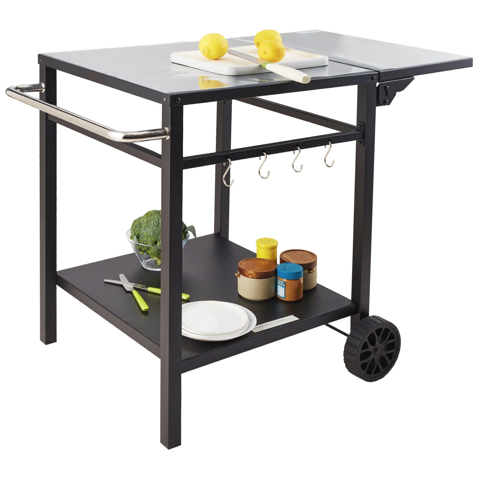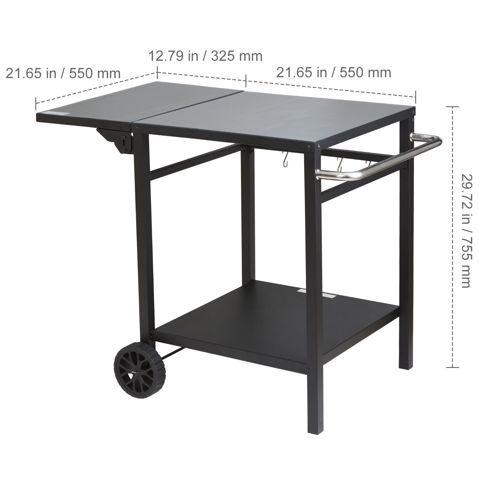 Product Description Double-Shelf Outdoor Grill Dining Cart It can be used as a grill table or pizza oven, and can also be used for cooking, storage, outdoor dining, and more. Can be used It provides a convenient and practical workspace for outdoor cooking. Versatile Usage Scenarios Not only does this outdoor grill kitchen serve as a stand for a grill or pizza oven, it also doubles as a storage unit and cooking workstation. Whether it’s a party, camping or picnic, this table can meet your every need. Expandable and Foldable Cart This side table has a folding function for your convenience. When expanded, it can provide more space to accommodate additional items. When not in use, it can be folded up to save storage space. In addition, we carefully polish the edges of the table to avoid sharp edges that may hurt your hands. Practical Design with Multiple Accessories The outdoor prep cart features a two-tier shelving design that can store large kitchen equipment such as stoves, firewood, and grills. You can also hang various small kitchen utensils and tools on the four hooks to organize your kitchen. In addition, we have also prepared PVC table mats, which can enhance the beauty of your kitchen and effectively reduce surface scratches. Better Load Capacity Our tires are manufactured using high-quality injection molding technology and have a higher load capacity than commonly used pneumatic tires in similar products on the market. User-Friendly Assembly Design The package includes clear installation instructions and parts list, making assembly easy with no additional tools or labor required. It saves you from the tedious setup process, allowing you to enjoy a stress-free experience. In addition, the tabletop is very smooth and easy to clean. Can be wiped with a damp cloth to quickly remove stains and dust. Thoughtful and Practical Features The double frame outdoor prep cart is equipped with two guide wheels for increased portability and flexibility. In addition, the stainless steel side handle is designed to facilitate moving the cart and hanging necessary tools. Specifications Item Model Number: TB0100001 Table Top Size: 21.65 x 21.65 inch/ 550 x 550 mm Item Size: 38.26 x 25.19 x 29.72 inch/972 x 640 x 755 mm Item Weight: 23.25 lbs /10.55 kg Package Content 1 x Outdoor Grill Dining Cart 4 x Hooks 1 x PVC Table Mat