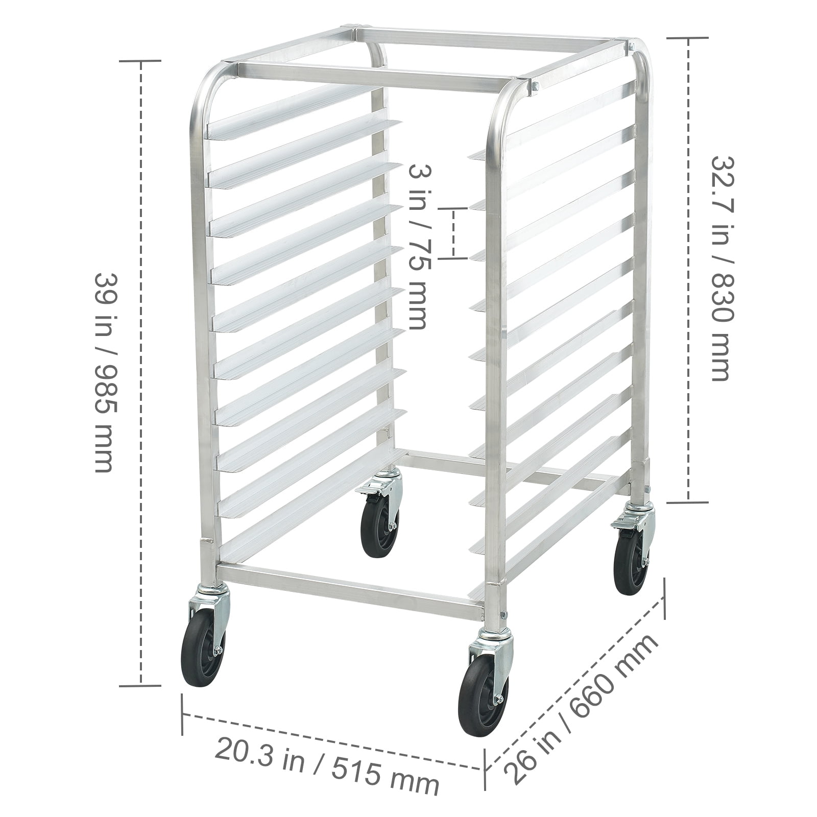 Product Description 10-Tier Aluminum Bakery Rack on Wheels The KFFKFF 10-Tier Aluminum Bakery Rack on Wheels is a versatile and reliable solution for all your baking needs. With its sturdy construction and ample space, this rack can hold up to 10 full size or 20 half size sheet pans, with a remarkable 75 lb capacity per tier. This means a total capacity of 530 lb, providing more than enough room for all your baked goods or other prepared food. The KFFKFF Bakery Rack is products comply with NSF Standard, ensuring the highest standards of security and quality. Its premium aluminum alloy shelf is not only durable but also easy to clean, making maintenance a breeze. One of the standout features of this rack is its convenient rear brake wheels. These wheels allow for easy mobility and positioning, while the brakes ensure stability and safety when the rack is in use. Assembly is quick and hassle-free, and the rack also offers optional wheel mounting for added convenience. Whether you need to move it around your kitchen or keep it stationary, this rack has got you covered. Upgrade your baking experience with the KFFKFF 10-Tier Aluminum Bakery Rack on Wheels. Its robust load capacity, versatile usage, and easy assembly make it the perfect choice for professional bakers and home cooks alike. Bread Cooling Rack with 10 Tiers Introducing the KFFKFF Bread Cooling Rack, a versatile bakery rack designed to hold up to 10 full size or 20 half size sheet pans. With a remarkable capacity of 75 lbs per tier and a total capacity of 530 lbs, this rack is perfect for storing baked goods or other prepared food. The 3″ clearance ensures proper air circulation, keeping your food fresh and delicious. Convenient and Mobile Experience the convenience of the KFFKFF Bread Cooling Rack with its lockable wheels. Equipped with 4 universal casters, this bun pan rack can easily be moved or positioned anywhere you desire. For added stability, 2 of the casters feature rear brakes, ensuring that the rack stays securely in place. Whether you’re using it at home or for commercial purposes, this rack offers unparalleled mobility and convenience. Easy Assembly and Optional Wheel Mounting We understand the importance of a hassle-free assembly process. That’s why the KFFKFF Bread Cooling Rack comes with complete hardware and a detailed manual, allowing you to assemble it quickly and effortlessly. Additionally, this commercial bakery rack offers the flexibility of optional wheel mounting, giving you the freedom to choose whether to have wheels or not. Durable Aluminum Alloy Construction Crafted from premium aluminum alloy, the KFFKFF Bread Cooling Rack is built to last. The edges of the rack are polished and rounded, ensuring a safe and comfortable handling experience. The rack is also rust-resistant, guaranteeing long-term use and maintaining its pristine condition. Versatile and Space-Saving The KFFKFF Bread Cooling Rack is not limited to just one setting. It is perfect for various establishments such as catering businesses, bakeries, cafes, supermarkets, and restaurants. Its compact design allows it to save valuable space while providing you with the utmost convenience. Certified for Quality and Sanitation Rest assured that the KFFKFF Bread Cooling Rack meets the highest quality standards. It is products comply with NSF Standard, ensuring top-notch security and sanitation. You can trust this bakery rack to deliver exceptional performance and maintain the highest level of cleanliness. Specifications Item Model Number: LHPR-10R Material: Aluminum Alloy Load Capacity: 530 lbs / 240 kg Pan Type: Half and Full Size Sheet Pans Net Weight: 20 lbs / 9 kg Package Content 1 x 10 Sheets Bakery Rack 4 x Foot Pads 9 x Hex Bolts 4 x “U” Washers 1 x User Manual