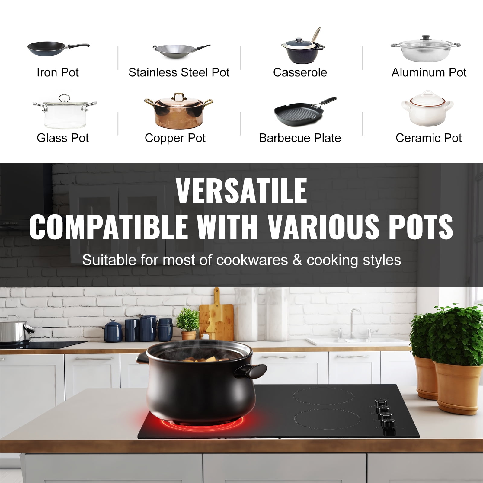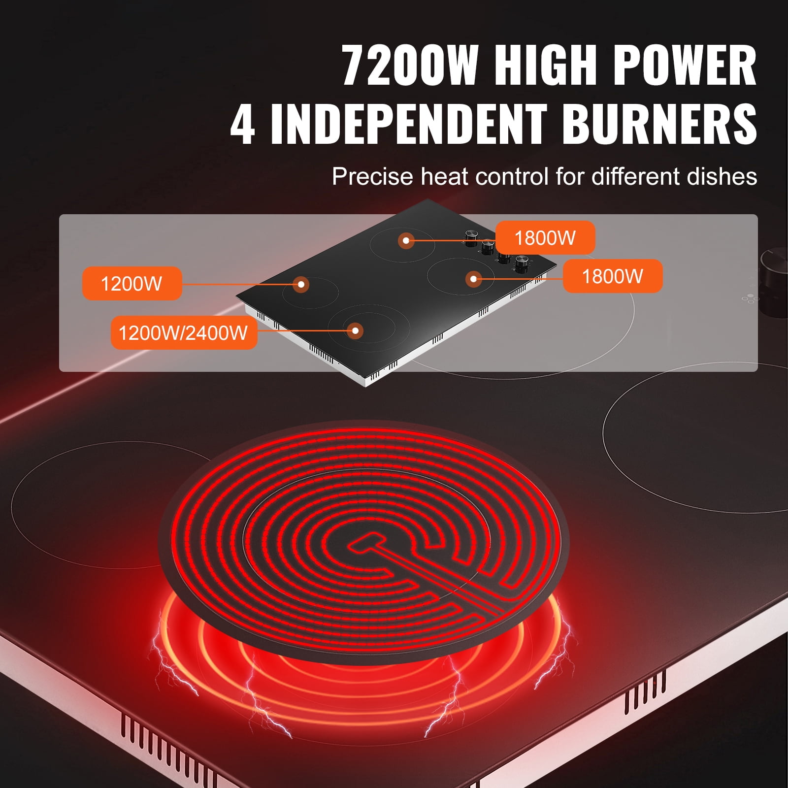 The KFFKFF electric cooktop offers 7200W of power, providing 11 heat levels for versatile cooking options. Featuring knob controls, this ceramic cooktop is easy to operate and provides independent temperature control for precise cooking. With 4 burners, you can cook multiple dishes simultaneously, saving time and energy. Designed with safety in mind, this cooktop operates without high-frequency radiation, making it safe for all users. The built-in design of this 30-inch cooktop saves valuable kitchen space and is compatible with 220-240V, 60Hz voltage.