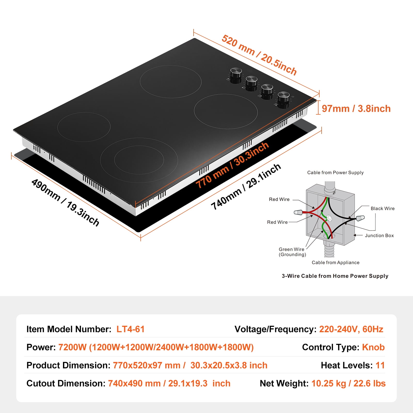 Product Description Electric Cooktop with Knob Control Introducing our KFFKFF Electric Cooktop with a convenient 11-level knob control panel. This innovative design allows for easy and precise heat adjustments, ensuring your meals are cooked to perfection. Whether you’re simmering, frying, grilling, steaming, boiling, or baking, this cooktop is versatile enough to handle it all, making meal preparation a breeze. With its built-in design, it seamlessly blends into your kitchen, adding a touch of elegance to your space. Experience the convenience and efficiency of our KFFKFF Electric Cooktop today! Efficient Electric Cooktop Experience the convenience of our KFFKFF built-in electric cooktop. With its user-friendly 11-level knob control panel, achieving your desired heat settings has never been easier. Whether you’re simmering, frying, grilling, steaming, boiling, or baking, this cooktop ensures fast and efficient cooking, allowing you to enjoy your meals in no time. Simplified Knob Controls Say goodbye to complicated buttons and hello to simplicity with our KFFKFF knob-controlled ceramic cooktop. Each knob provides independent temperature control, making it a breeze to operate. This feature is especially beneficial for seniors and individuals with visual impairments, ensuring effortless cooking every time. Versatile Compatibility Our countertop stove is designed to accommodate a wide range of high-temperature cookware. From aluminum pots to copper pans, cast iron skillets to non-magnetic stainless steel pots, this cooktop offers excellent compatibility, allowing you to unleash your culinary creativity without limitations. Enhanced Safety Features Prioritizing your safety, our KFFKFF ceramic electric stove incorporates multiple protection functions, including a residual heat indicator. Rest assured, this stove operates without emitting high-frequency radiation, making it a safe choice for pregnant women and the elderly. Cook with peace of mind. Space-Saving Design Optimize your kitchen space with our built-in KFFKFF electric stove. Its sleek design seamlessly integrates into your countertop, saving valuable space. This stove is compatible with 220-240V, 60Hz voltage and requires a cutout dimension of 740×490 mm / 29.1×19.3 inches. Upgrade your kitchen with style and functionality. Effortless Cleaning Cleaning up after cooking is a breeze with our KFFKFF stove. Its high-hardness micro-crystal glass panel is not only durable and scratch-resistant but also easy to clean. Simply wipe away any grease or stains with a cloth, and your stove will look as good as new, ready for your next culinary adventure. Specifications Item Model Number:LT4-61 Voltage/Frequency: 220-240V, 60Hz Power: 7200W (1200W + 1200W + 2400W + 1200W + 1800W) Control Type: Knob Heat Levels: 11 Net Weight: 10.25 kg / 22.6 lbs Product Dimension: 770x520x97 mm / 30.3×20.5×3.8 inch Cutout Dimension: 740×490 mm / 29.1×19.3 inch Package Content 1x Electric Cooktop 1x User Manual