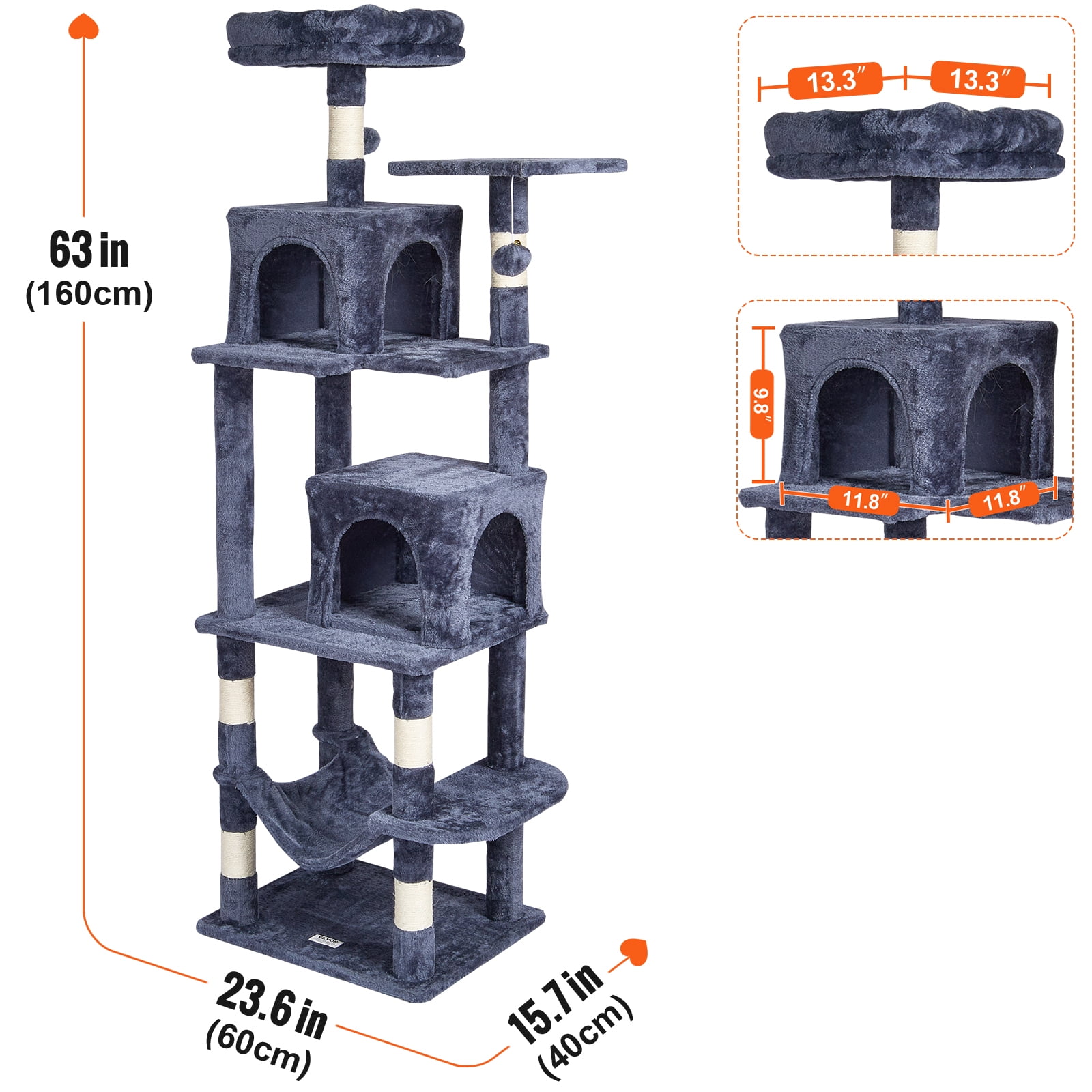 Product Description Give your beloved feline companions a sanctuary! Spoil your adored cats with this versatile cat tree that offers a variety of cozy spots for relaxation and play. With its spacious base, comfortable hammock, two private cat condos, and plush top perch, this cat tree provides endless opportunities for rest and entertainment. It also includes captivating dangling ball toys and robust sisal scratching posts to engage your cats’ natural instincts. Made from premium P2-grade particle board, this cat tree ensures both safety and longevity. A World of Exploration This extraordinary cat tree is thoughtfully designed to accommodate multiple cats, ensuring each one has their own exclusive activity and resting areas. Not only does it provide a safe and comfortable space for your cats, but it also optimizes the use of space in your home. Treat your cats to the ultimate playground they deserve! A Sanctuary of Comfort Create a sanctuary of comfort and security for your cherished cats with the Cat Tower. This remarkable cat tower offers a variety of resting areas, including a spacious base, a cozy hammock, two concealed cat condos, and a plush top perch. Your cats can lounge, hide, or perch high, enjoying their own private spaces. Endless Entertainment Unleash the playful spirit of your cats with the Playground for Cats. Equipped with dangling toys and sisal scratching posts, this cat playground offers boundless entertainment, reducing stress and alleviating boredom. The multiple platforms provide endless climbing fun, keeping your cats active and vibrant. Watch as your cats spend joyful days exploring and playing in this captivating playground. Uncompromised Safety Our cat scratching tree is meticulously crafted from high-quality P2-grade particle board, ensuring exceptional durability without any unpleasant odors. The large base and reinforced sisal posts guarantee stability, providing a secure environment for your cats. For added peace of mind, the included anti-tip straps can be effortlessly mounted to the wall, offering extra security and stability. Stylish and Functional With its sleek light gray finish, this cat house effortlessly blends with any interior style. Whether placed in the living room, bedroom, balcony, or courtyard, it adds a touch of elegance to your home. Not only is it a paradise for cats, but it also serves as a stylish decor piece. Effortless Assembly with Cat Tree Featuring pre-drilled holes, this cat tree can be easily put together by simply screwing the parts. Even if you’re a first-time user of pet furniture, you’ll find the assembly process effortless and time-saving. Say goodbye to complicated setups and hello to instant cat entertainment. Specifications Item Model Number: CAT793 Color: Dark Grey Number of Layers: 7 Number of Cat Condos: 2 Weight Capacity: 88lbs/40kg Top Perch Size: 13.3″×13.3″×3.1″/34×34×8 cm Cat Condo Size: 11.8″×11.8″×9.8″/30x30x25 cm Base Size: 19.7″x15.7″/50×40 cm Hammock Size: 18.5″x15.4″/47x39cm Product Size: 23.6″×15.7″×63″/60x40x160 cm Product Weight: 29.7 lbs/13.5kg Package Content 1 x Cat Tree Tower 1 x Manual 26 x M8*35 Screws 7 x M8*80 Double-Ended Studs 1 x Hex Wrench 1 x Expansion Screw Kit 1 x M8*25 Screws